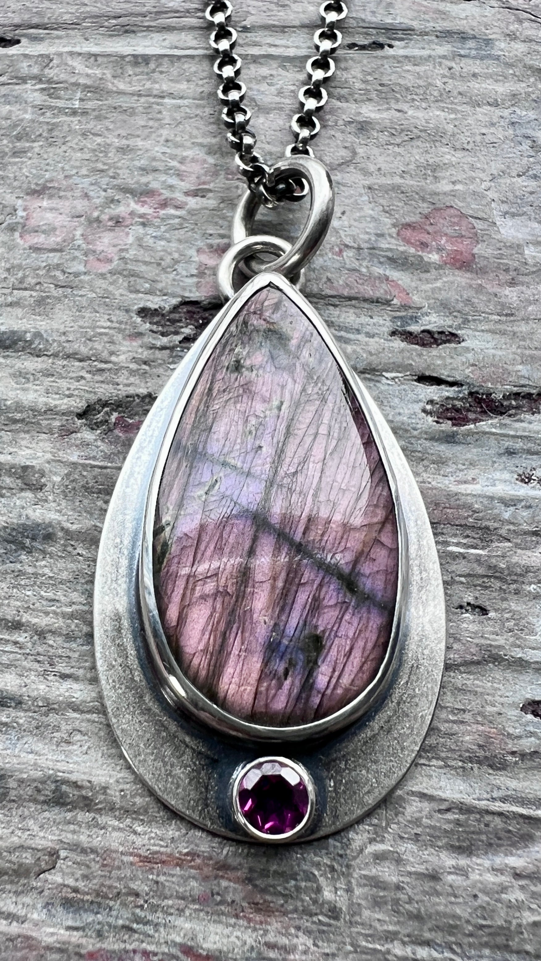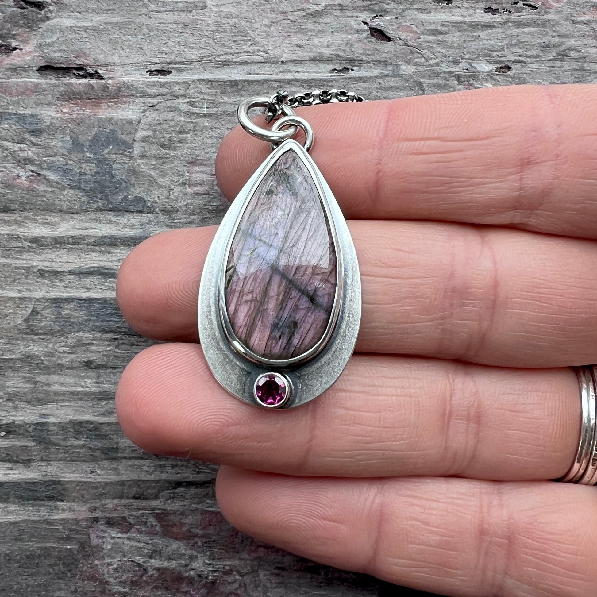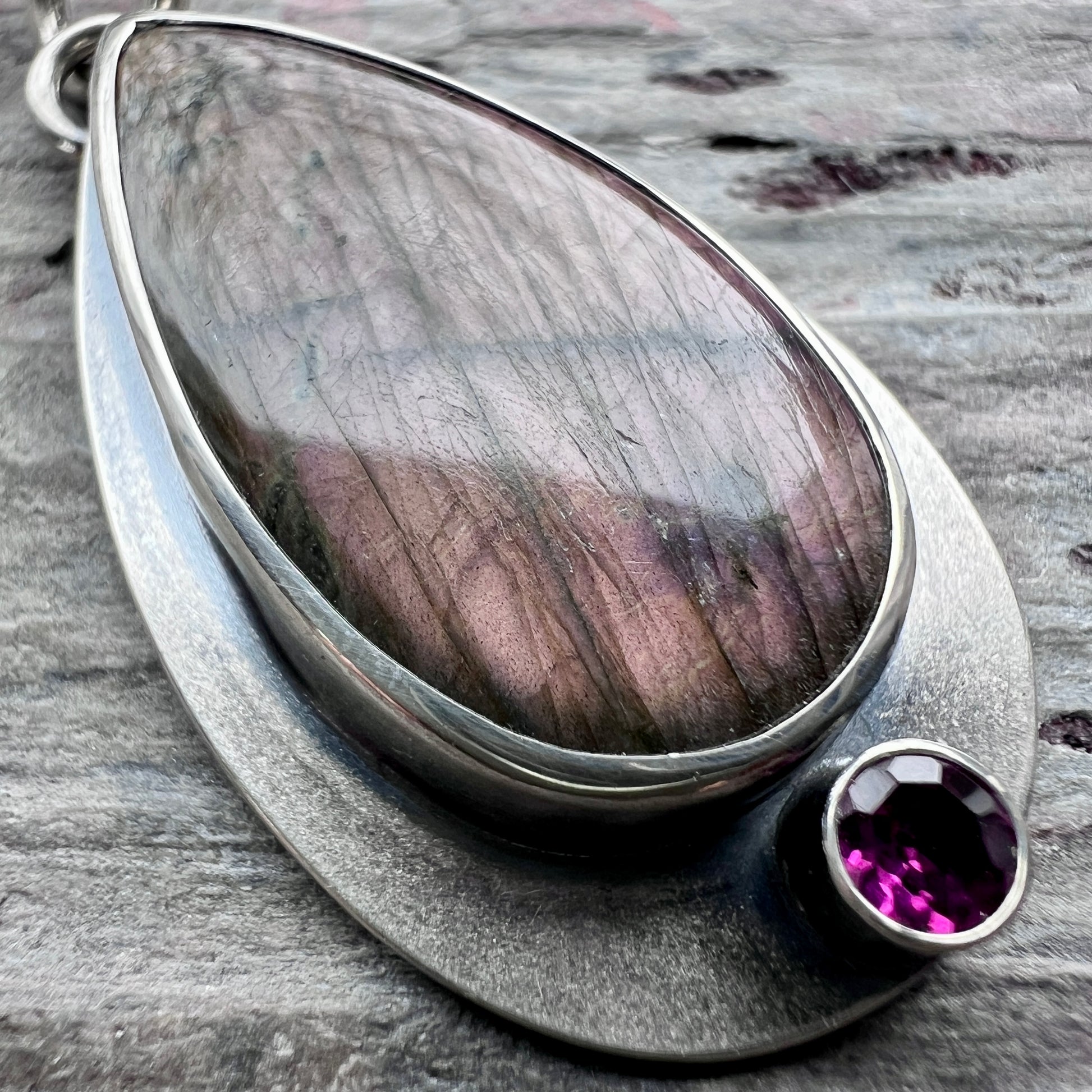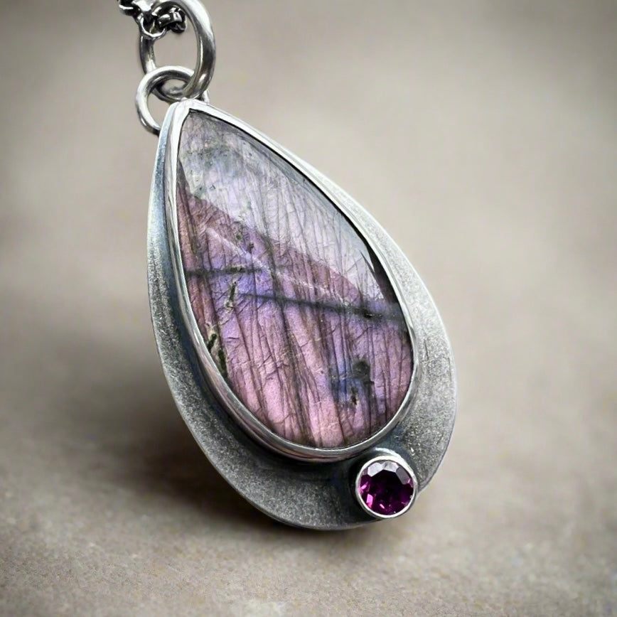 Sterling Silver Purple Labradorite and Rhodolite Garnet Necklace | Natural Stone Teardrop Pendant