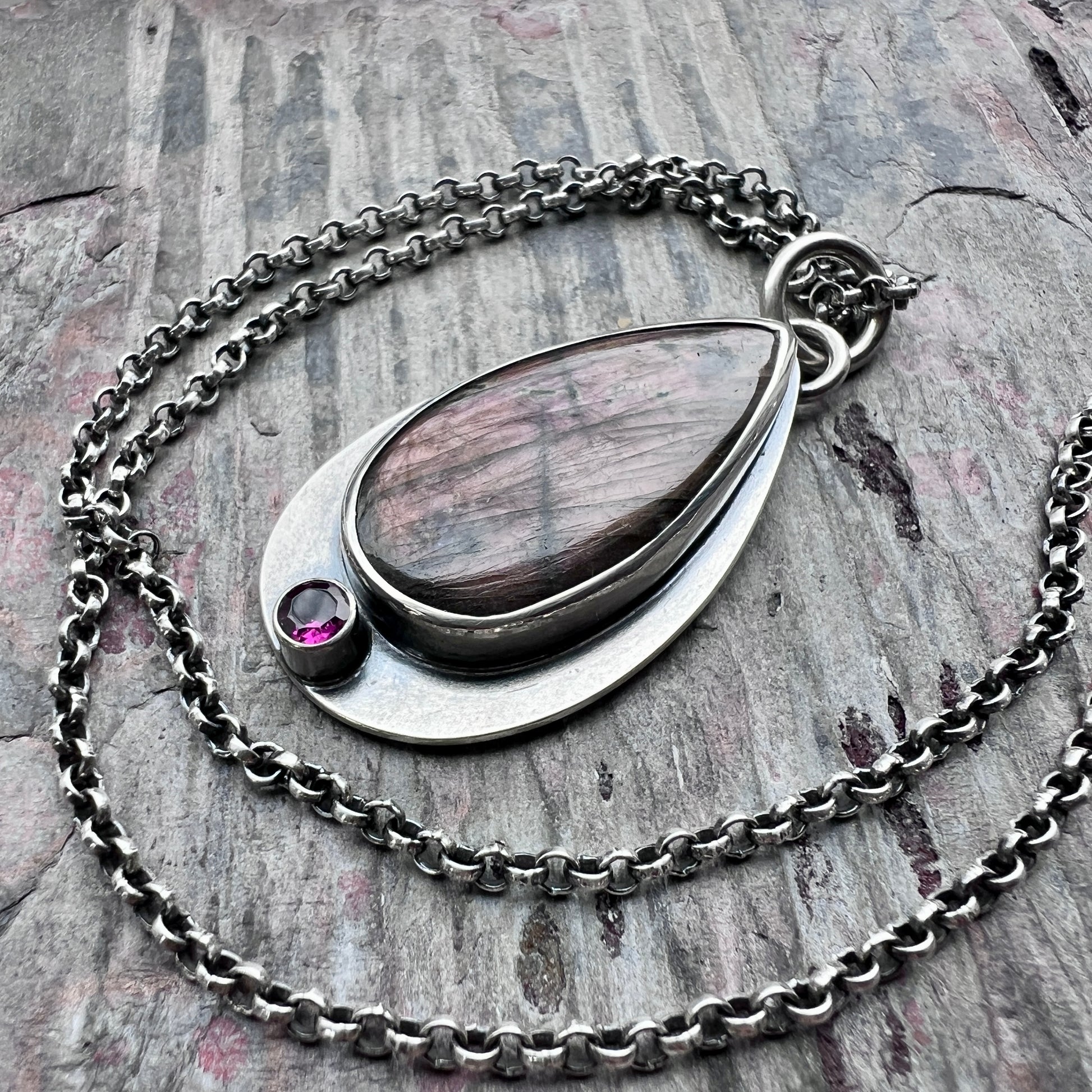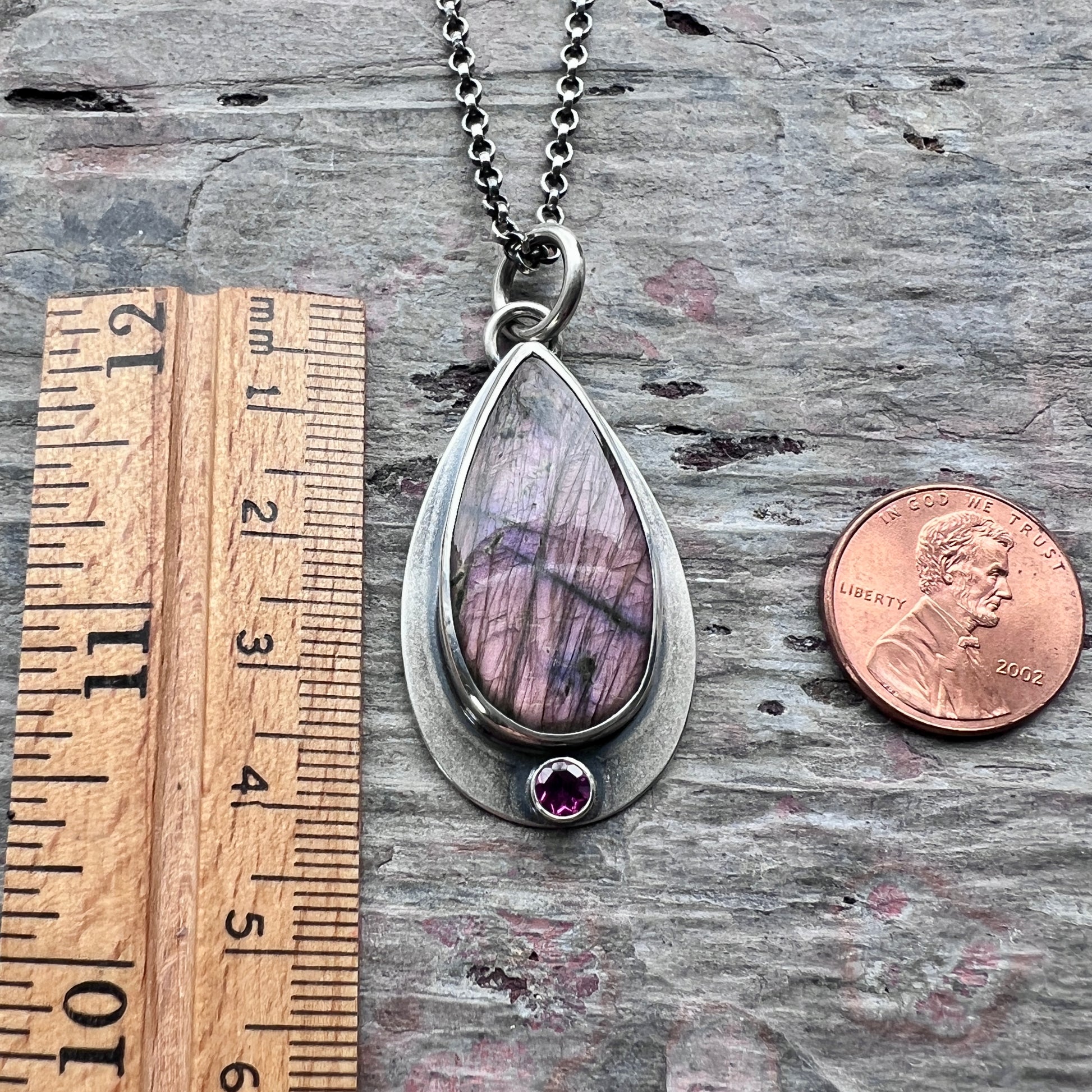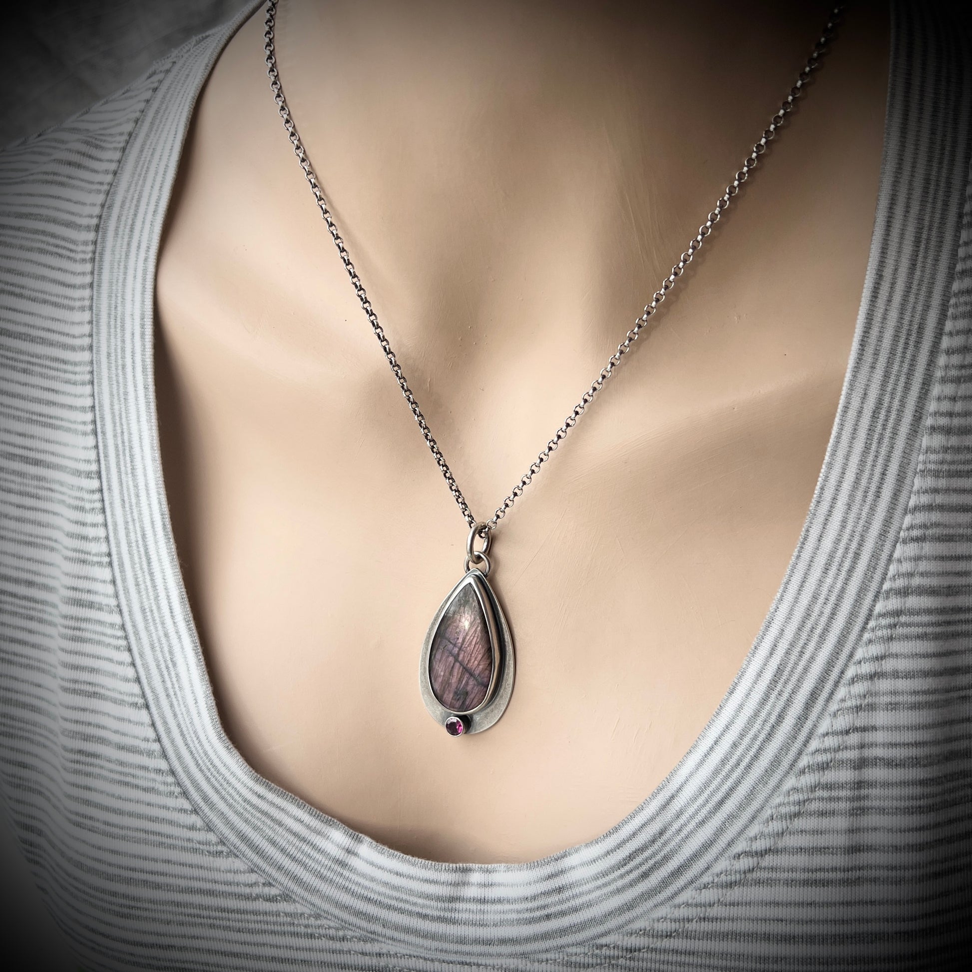 This pendant necklace is handmade from sterling silver, Labradorite, and Rhodolite Garnet. A Labradorite teardrop cabochon is set in sterling silver. This natural stone has a brown-gray base with flashes of plummy purple as light moves across the surface. Below the Labradorite is a tiny sparkling genuine Rhodolite Garnet gem. The two stones are framed by a silver border. I have made this unique necklace by sawing, soldering, and finishing the design entirely by hand. The silver has been oxidized and polished to create an antique patina finish.