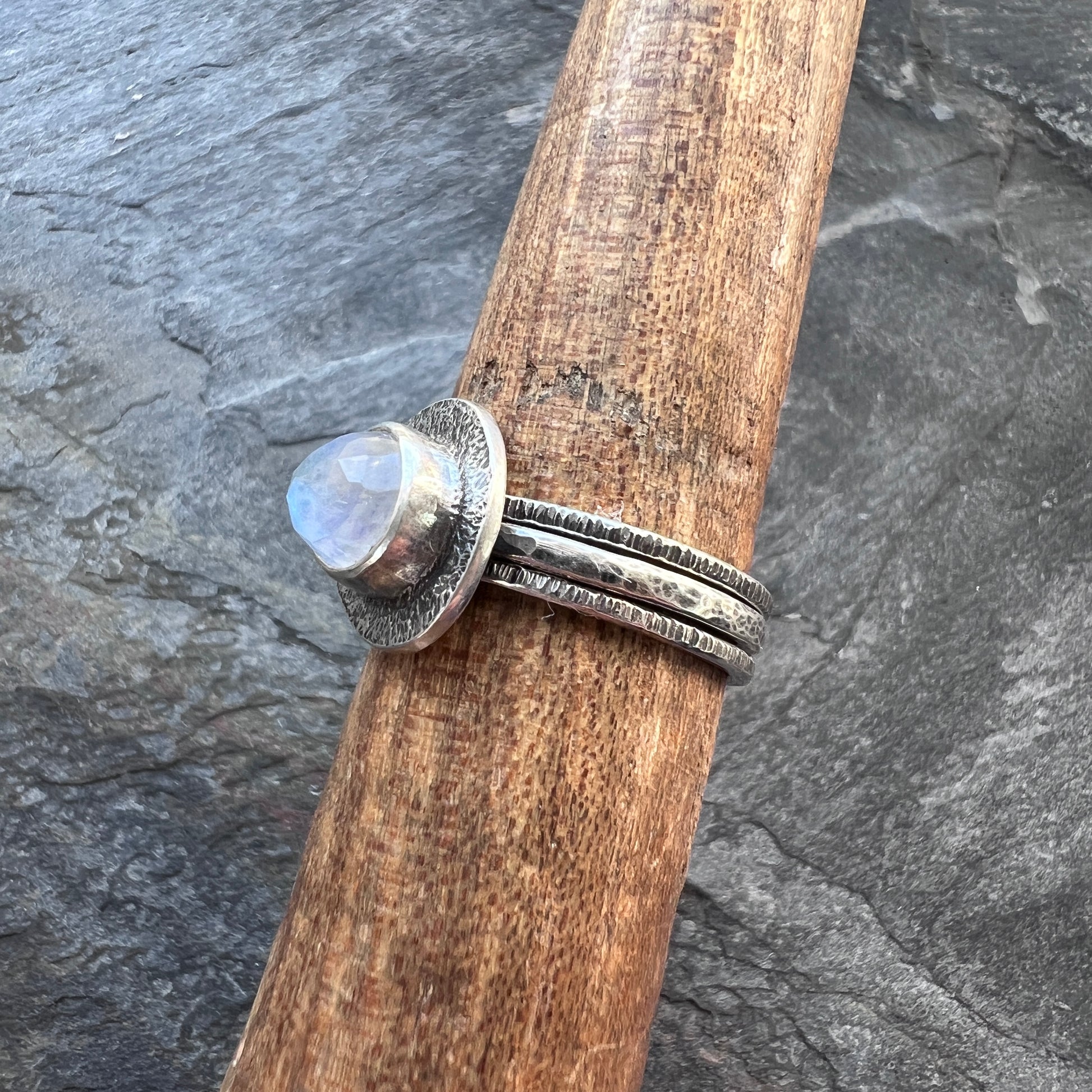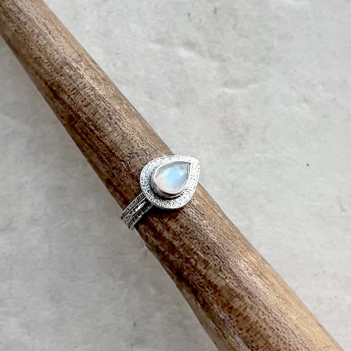This stacking ring set is created from a genuine Rainbow Moonstone cabochon and sterling silver. The natural stone teardrop is semi-transparent white with flashes of aqua as light moves across the surface. The cabochon is framed by a textured silver border. The ring features a thin textured sterling silver band along with two skinny stacking bands. I have made this unique style by forming, hammering, soldering, and finishing the piece entirely by hand. The silver has been oxidized and polished to create an antique patina finish.