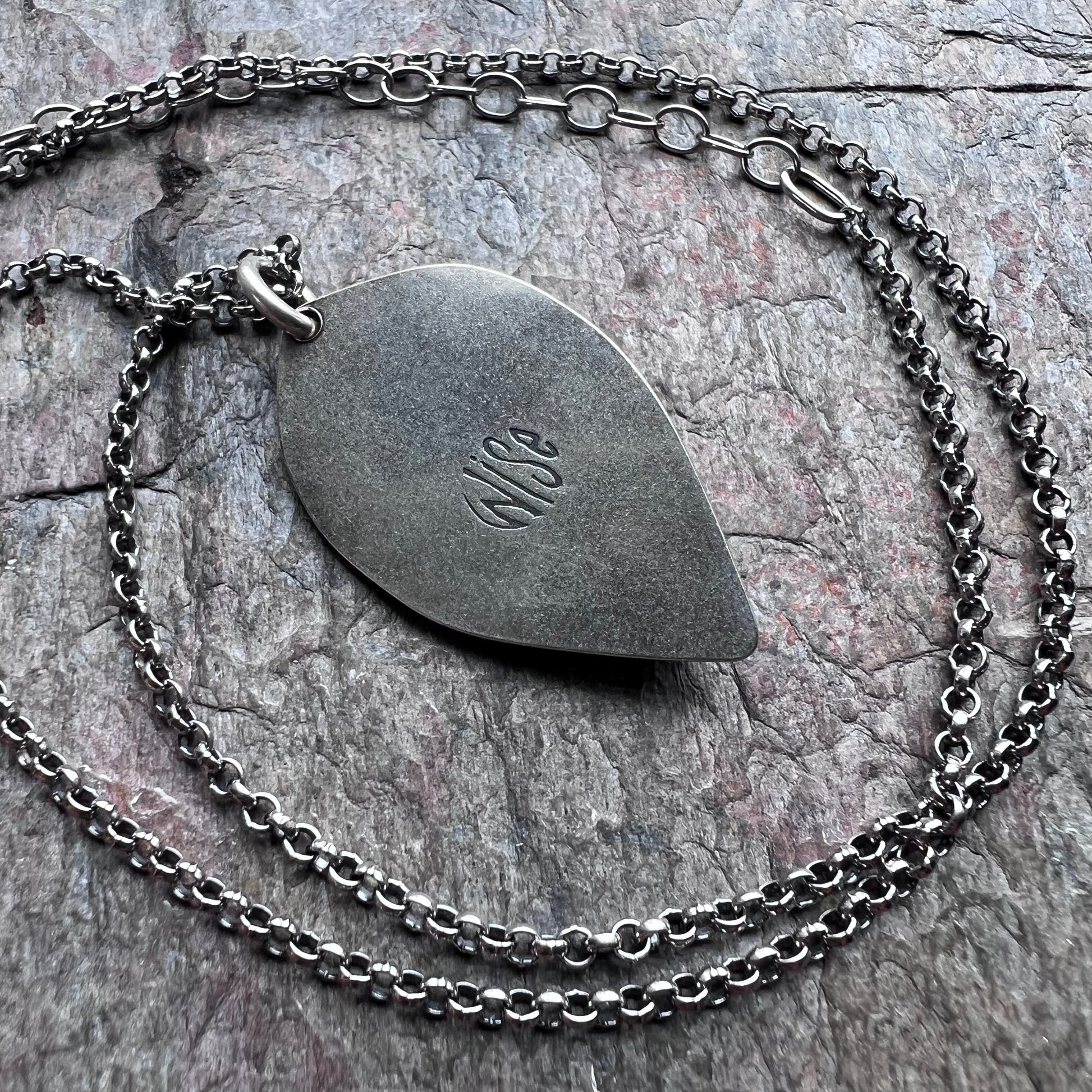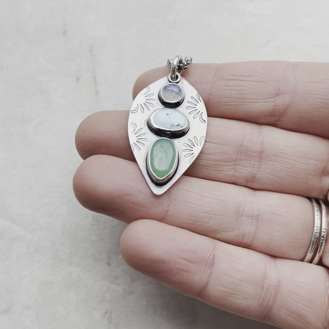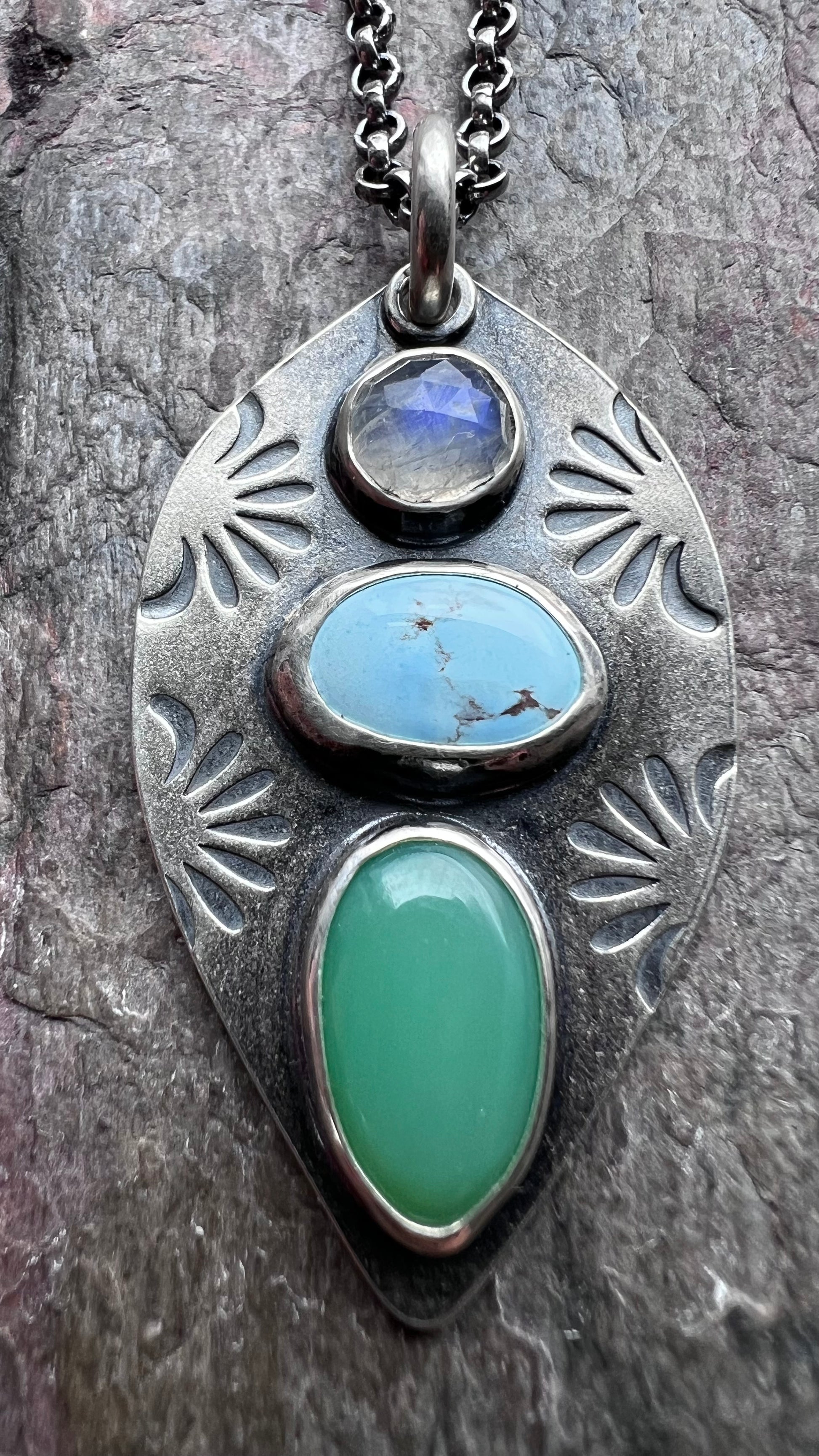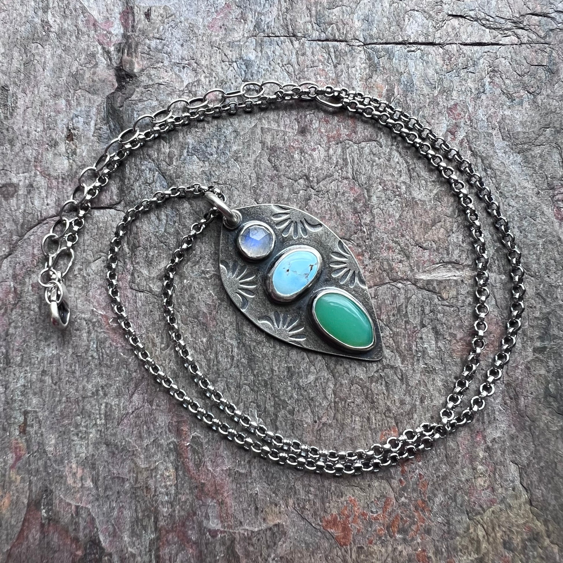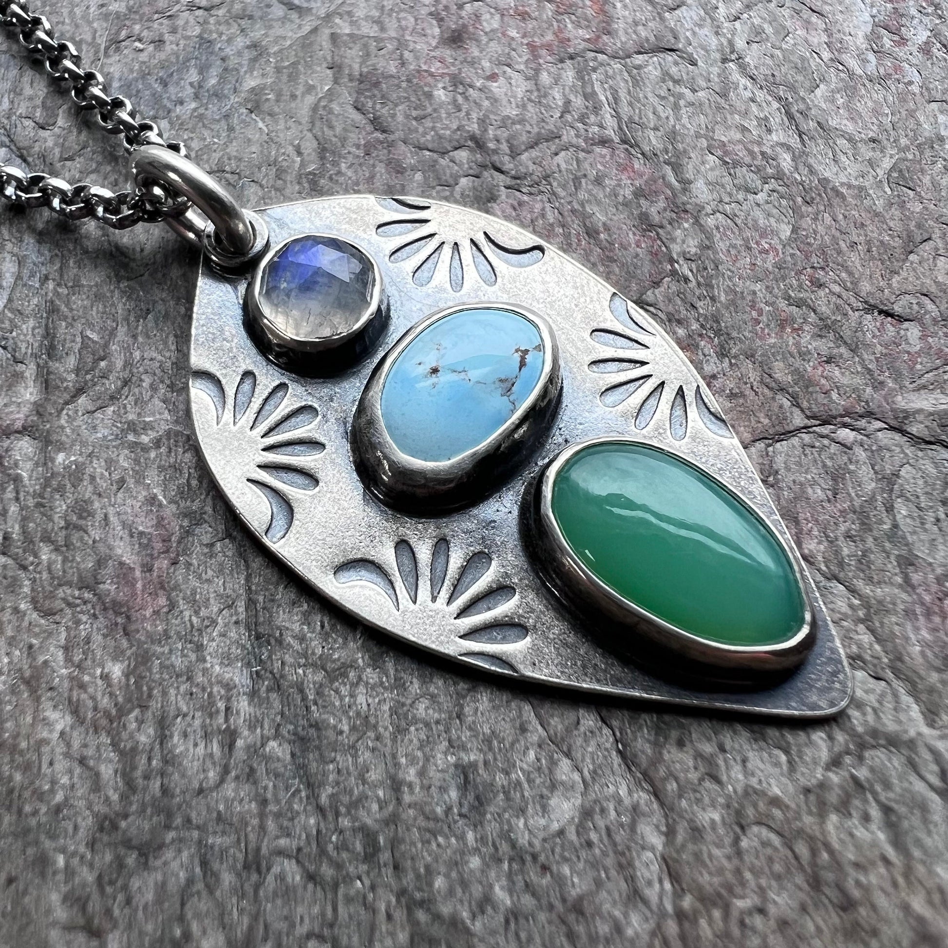A trio of rainbow moonstone, Golden Hills turquoise, and chrysoprase cabochons have been set in sterling and fine silver. I have made this one-of-a-kind necklace by sawing, soldering, texturing, and finishing the design entirely by hand. Pendant hangs from a sterling silver chain featuring a 3-inch extender allowing it to be worn from 17-20 inches in length. The silver has been oxidized and polished to create a patina finish.