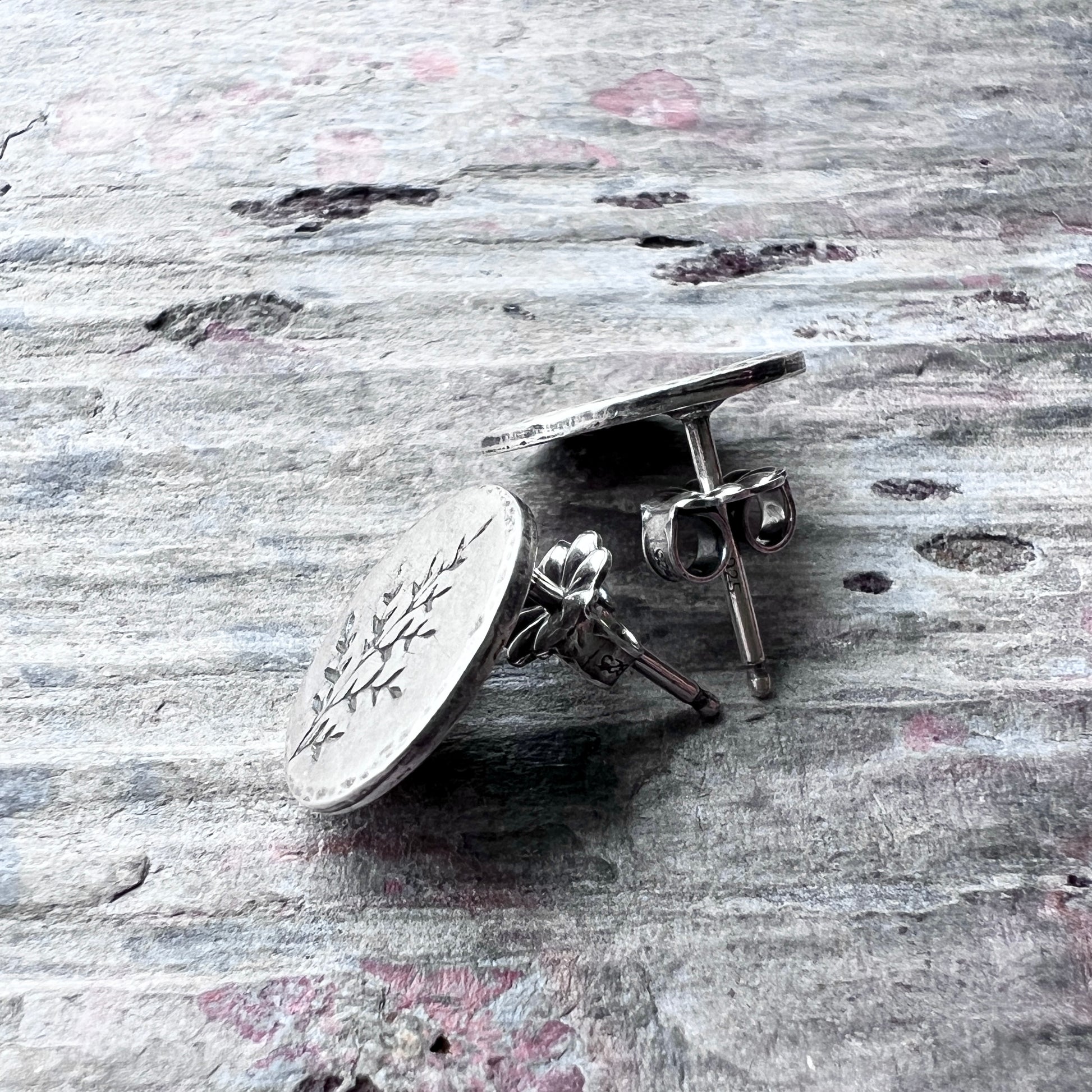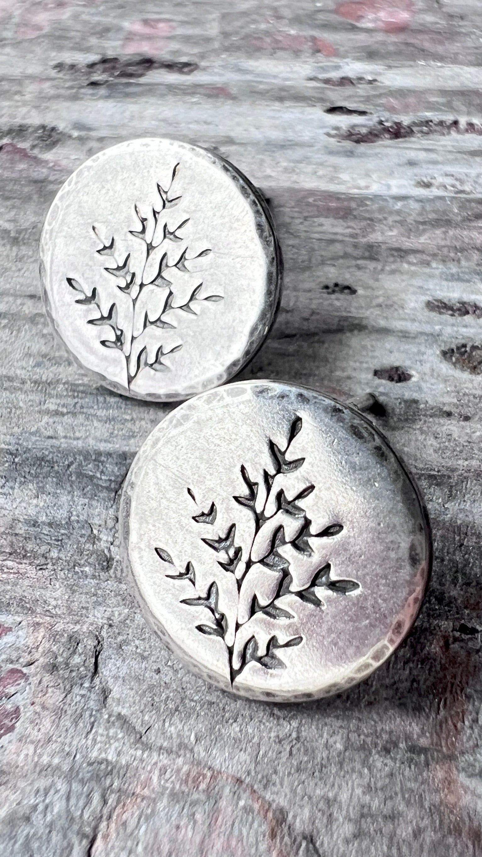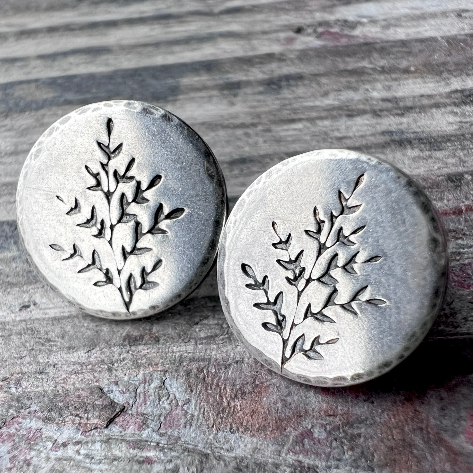 These post earrings are handmade from solid sterling silver. I have cut a pair of circle discs from a sheet of silver. I then impressed a sprig leaf into the silver and lightly hammered the borders. The earrings feature sterling silver posts and sterling silver backings to secure the earrings in place. The silver has been oxidized and polished to create an antique patina finish.