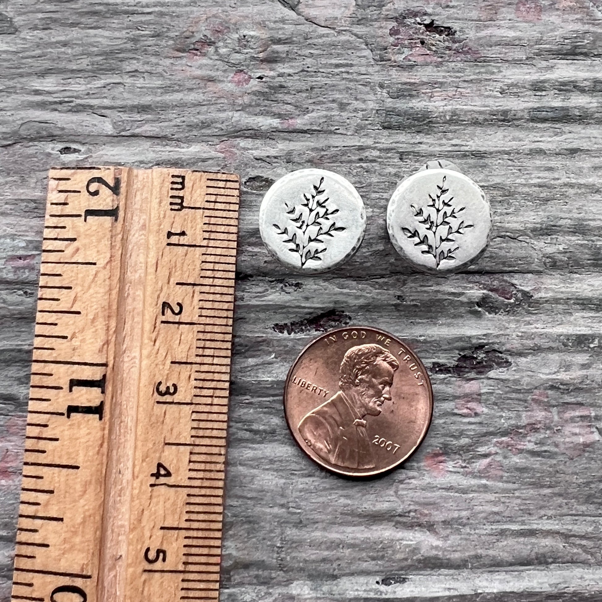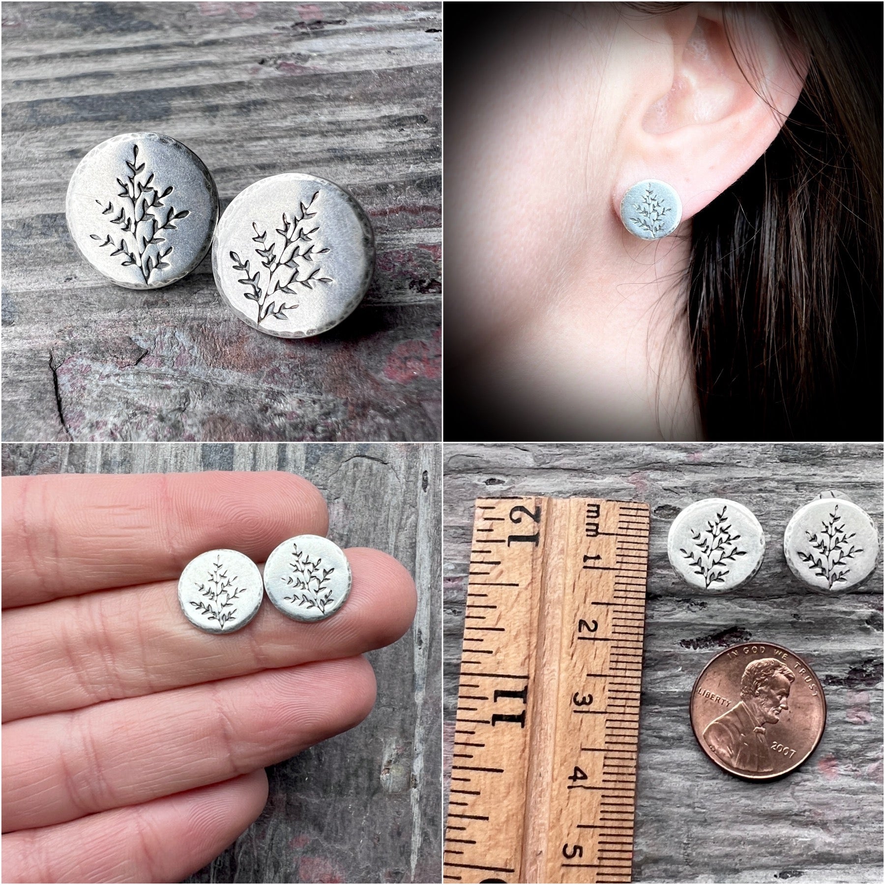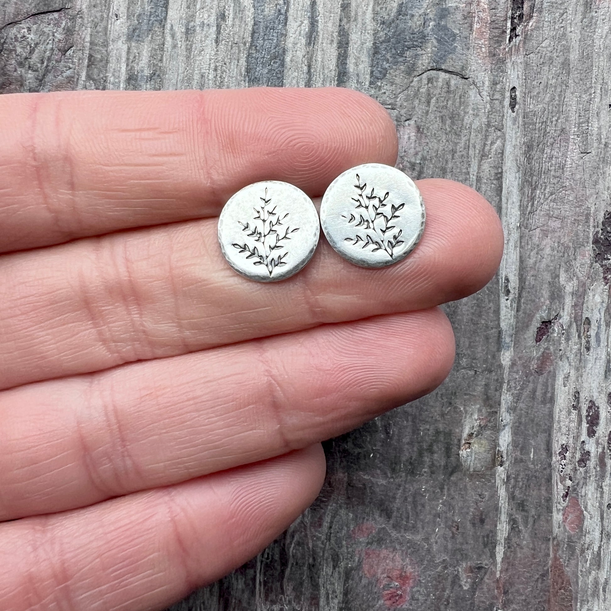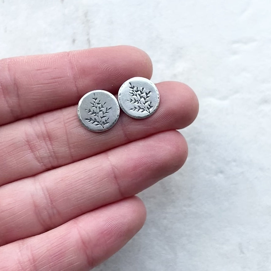 These post earrings are handmade from solid sterling silver. I have cut a pair of circle discs from a sheet of silver. I then impressed a sprig leaf into the silver and lightly hammered the borders. The earrings feature sterling silver posts and sterling silver backings to secure the earrings in place. The silver has been oxidized and polished to create an antique patina finish.