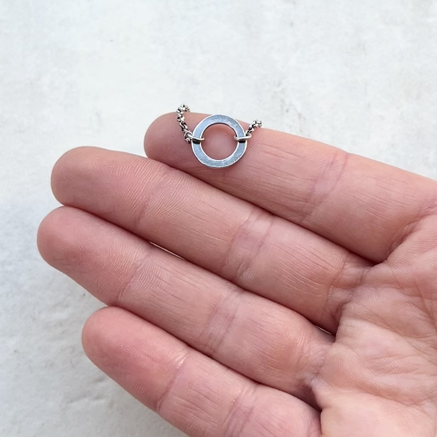 This minimalist small circle necklace is handmade from sterling silver. I have formed a small ring from silver wire. I then hammer each ring flat to create a round organic shape. The circle pendant is suspended along a sterling silver chain. The end of the chain features a lobster claw clasp and a 3-inch extender chain allowing the necklace to be slightly adjustable in length.
