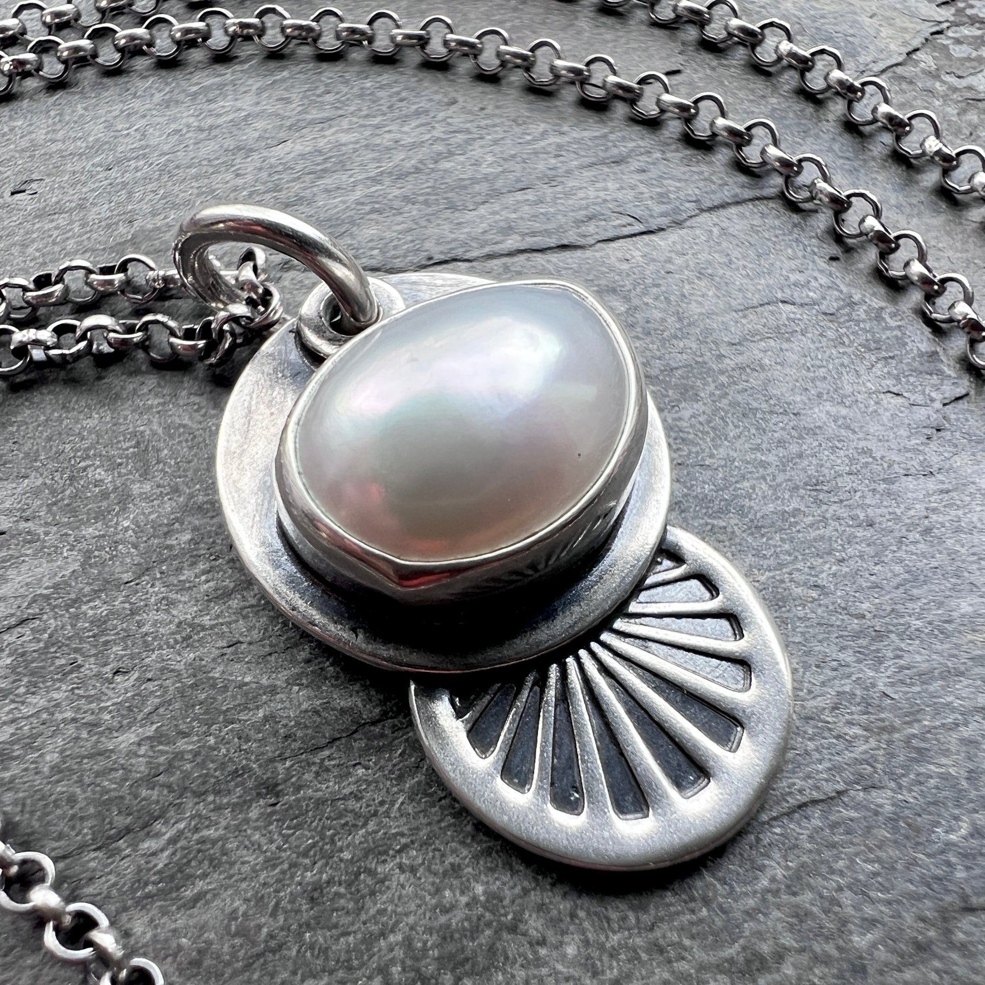 This pendant necklace is handmade from sterling silver and a natural baroque pearl. The genuine pearl is set in two layers of sterling silver. I have made this unique pendant by sawing, soldering, texturing, and finishing the design entirely by hand. The silver has been oxidized and polished to create an antique patina finish.