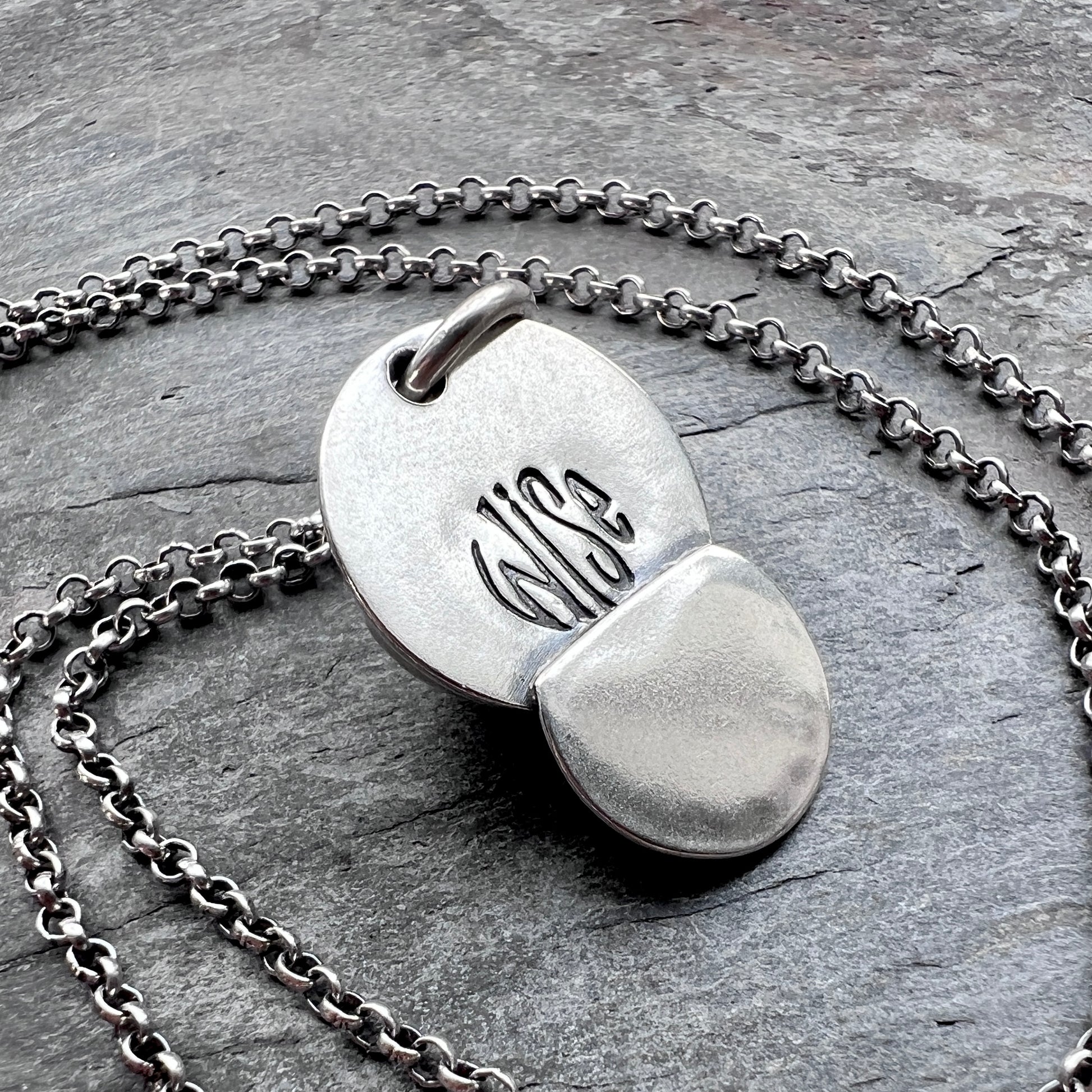 The pendant hangs from a sterling silver chain. The chain features a lobster claw clasp and a 3-inch extender allowing it to be slightly adjustable. Select your desired length when ordering. Note that the total length is measured from end-to-end and includes all parts of chain and clasp.