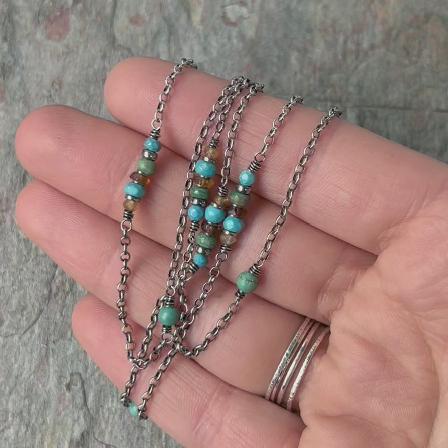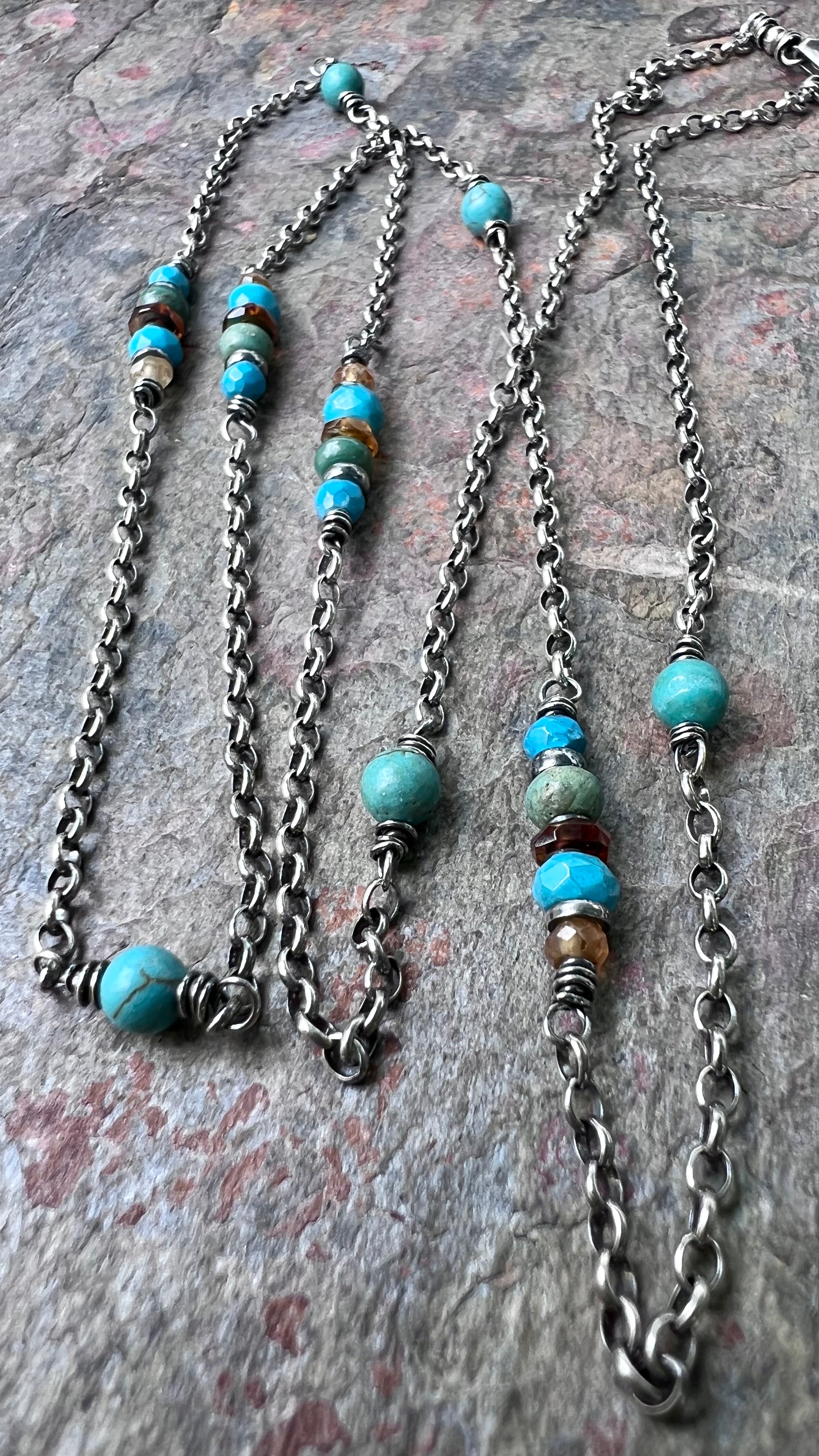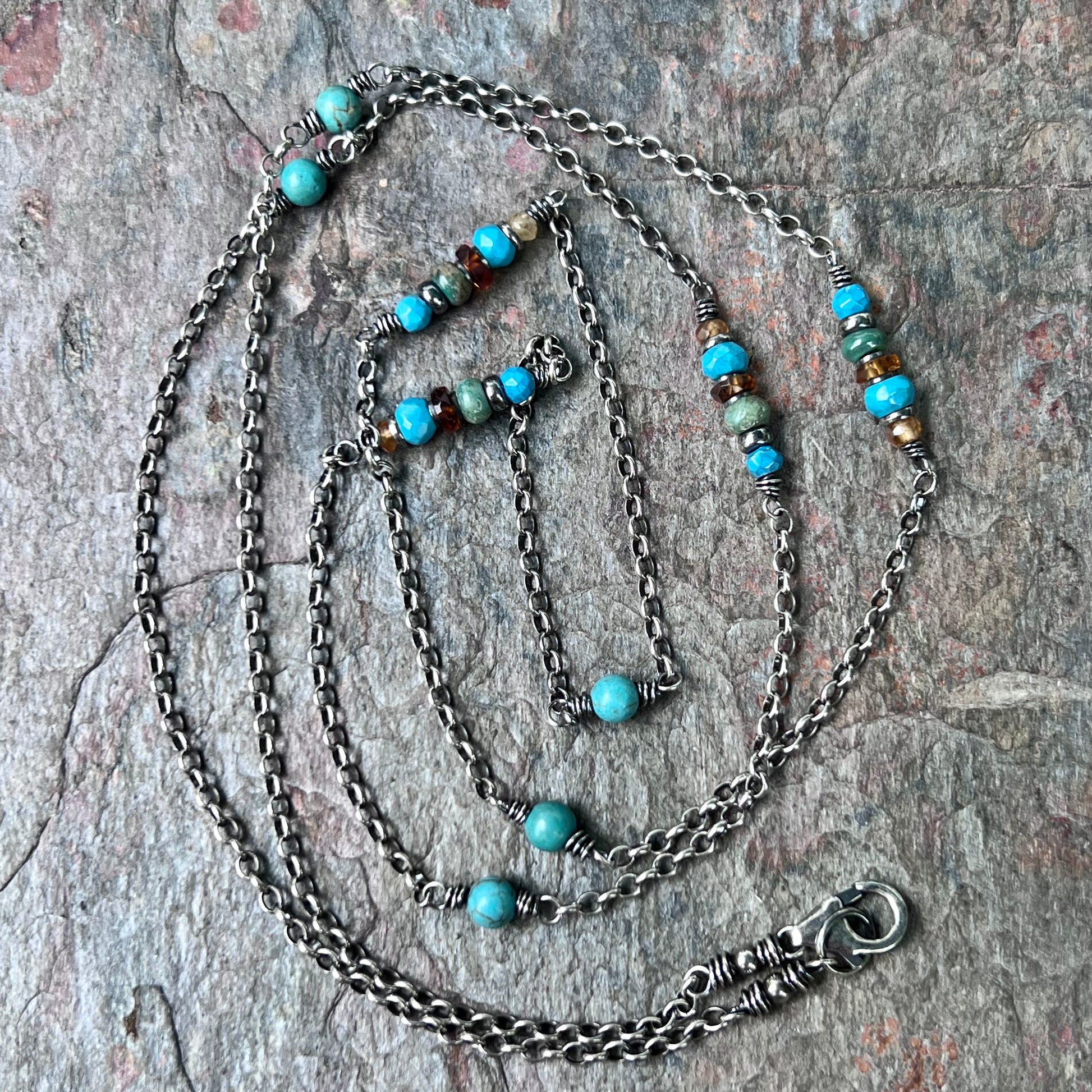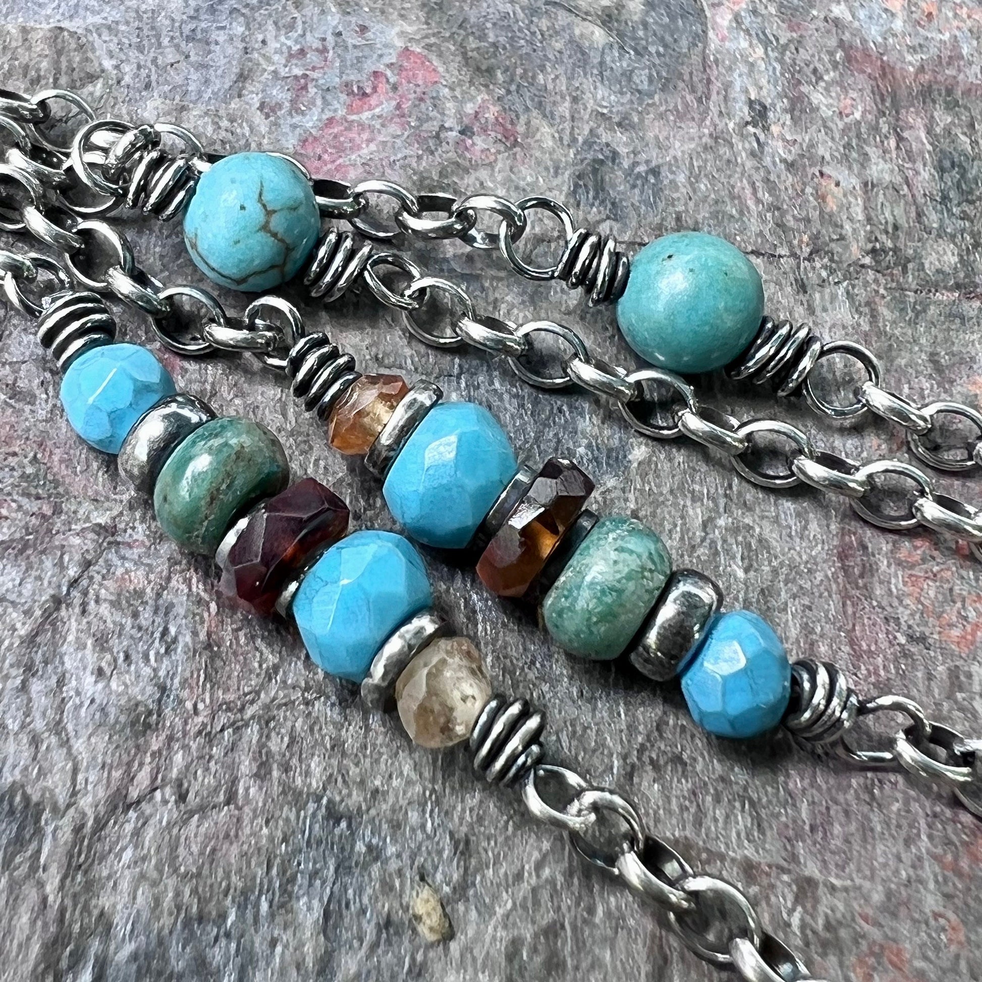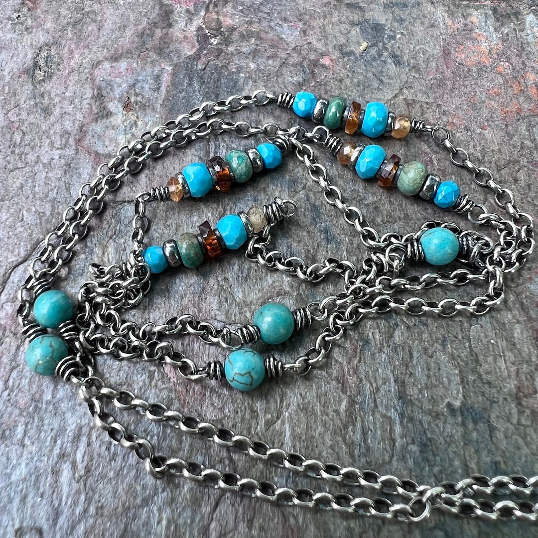 A mix of genuine Turquoise and Hessonite Garnet gems have been wrapped in sterling silver. The stones are accented by sterling silver beads. The gems are spaced along a sterling silver chain. I have oxidized and polished the silver to give it an aged patina finish.
