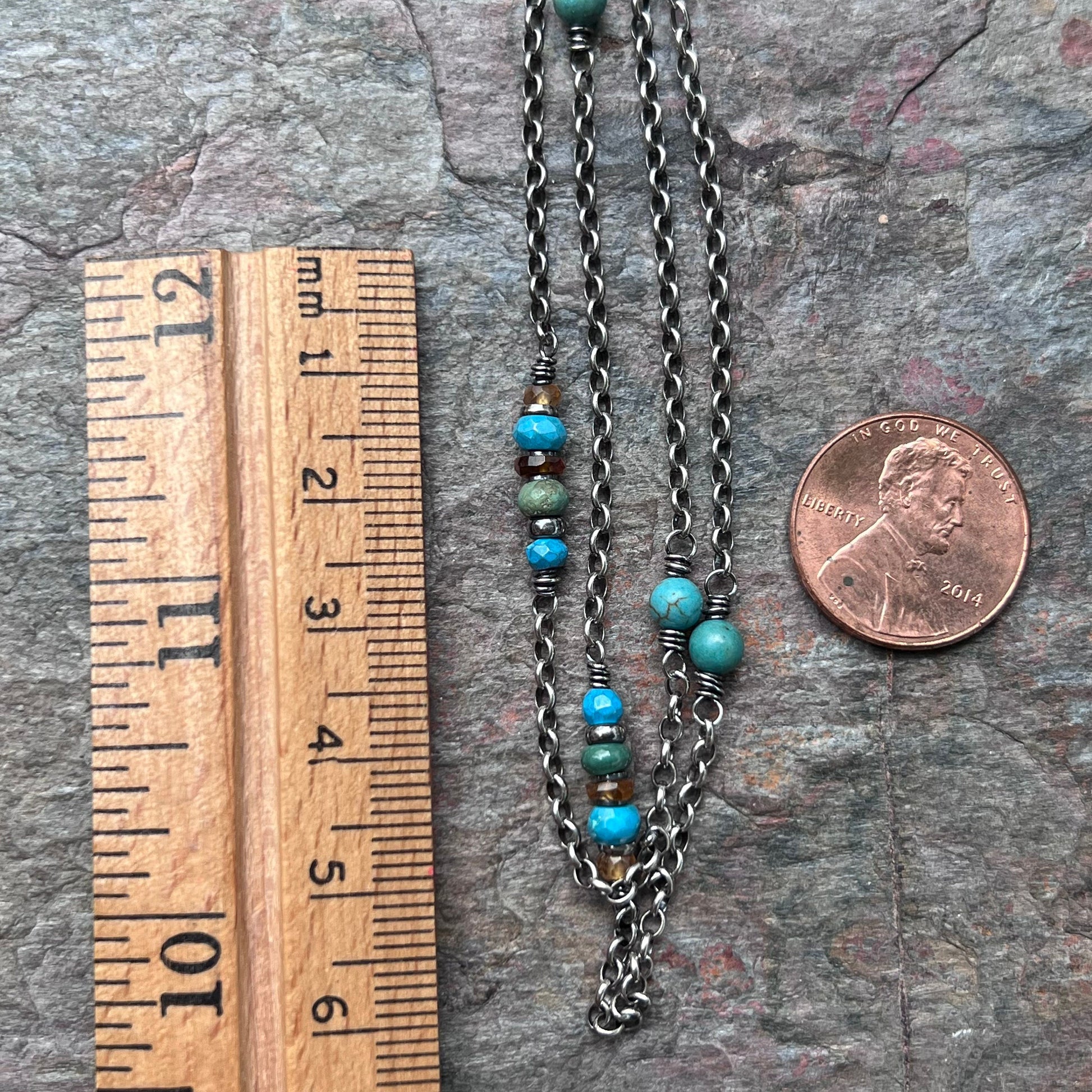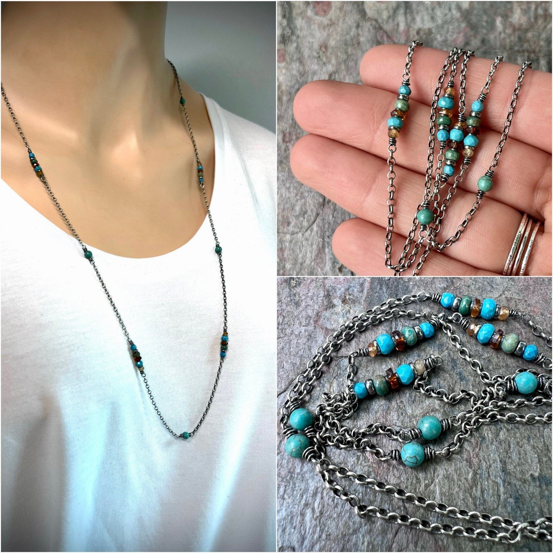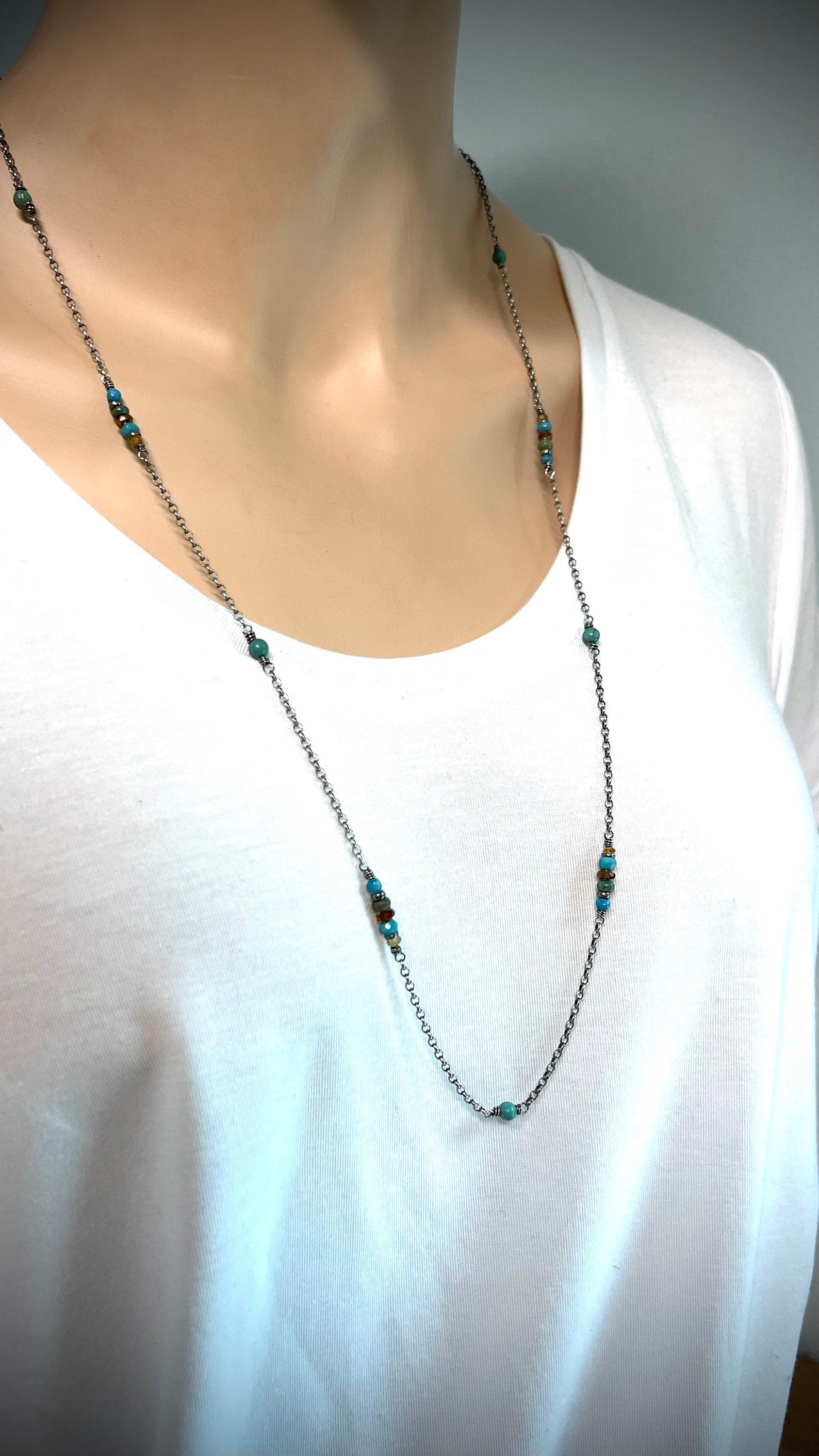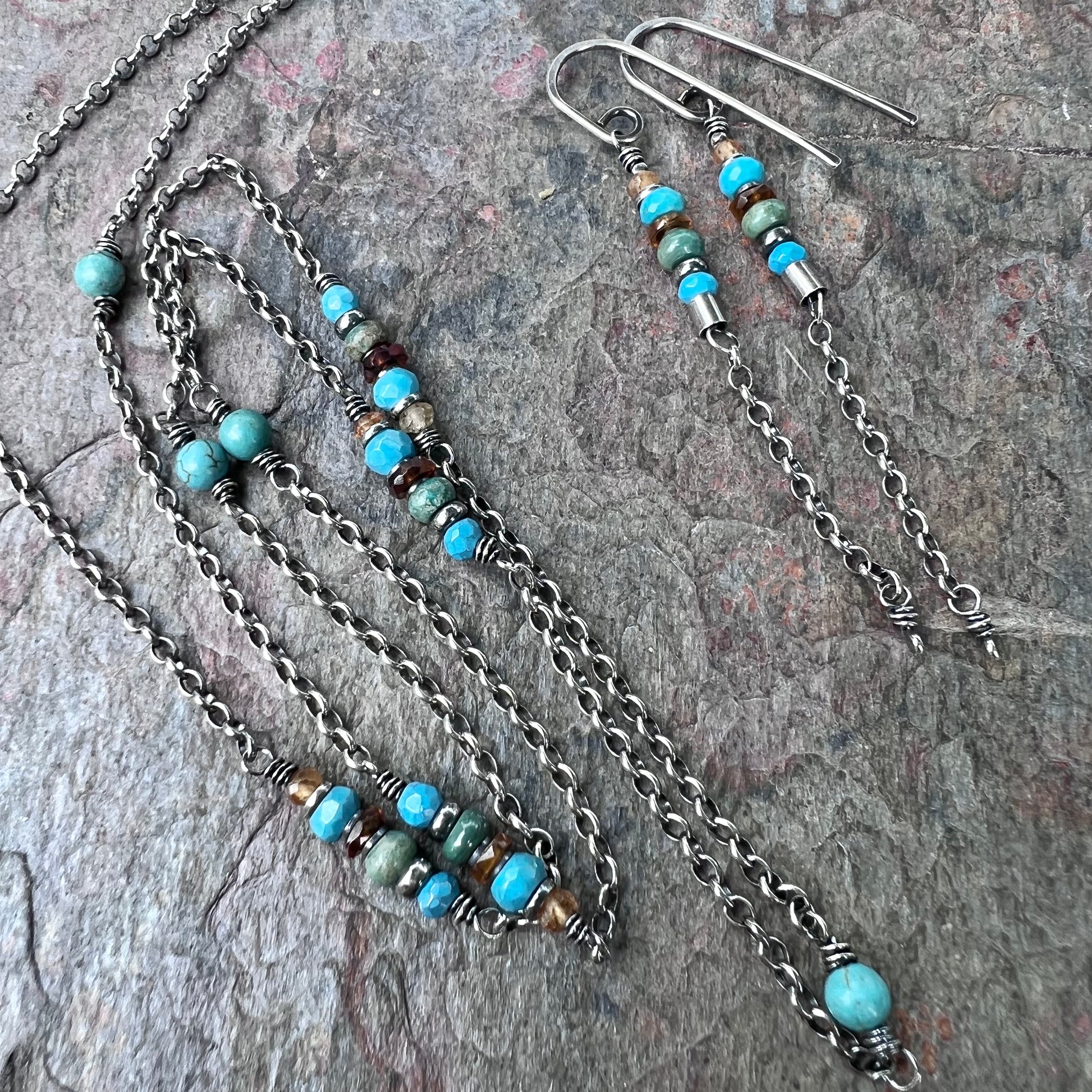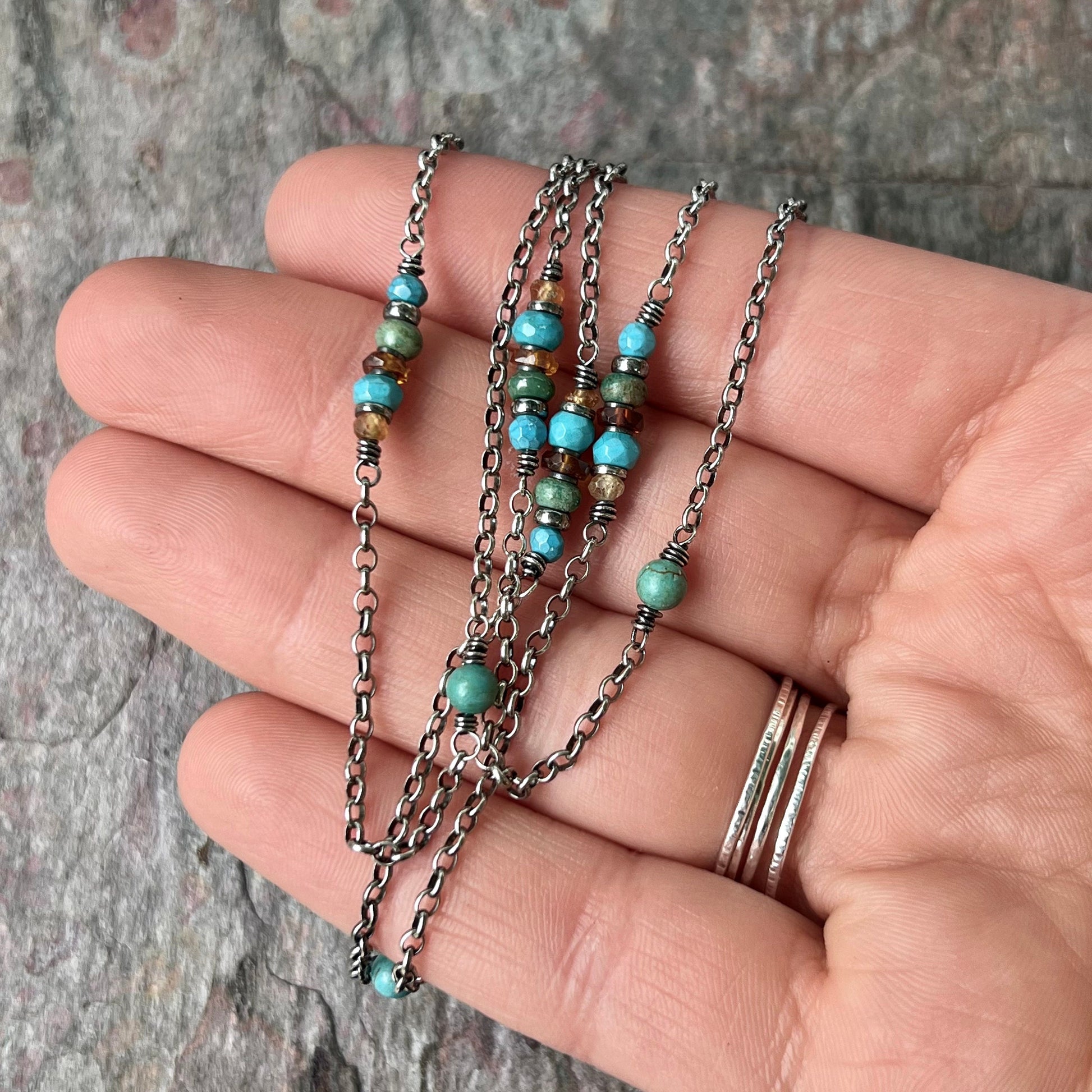 A mix of genuine Turquoise and Hessonite Garnet gems have been wrapped in sterling silver. The stones are accented by sterling silver beads. The gems are spaced along a sterling silver chain. I have oxidized and polished the silver to give it an aged patina finish.