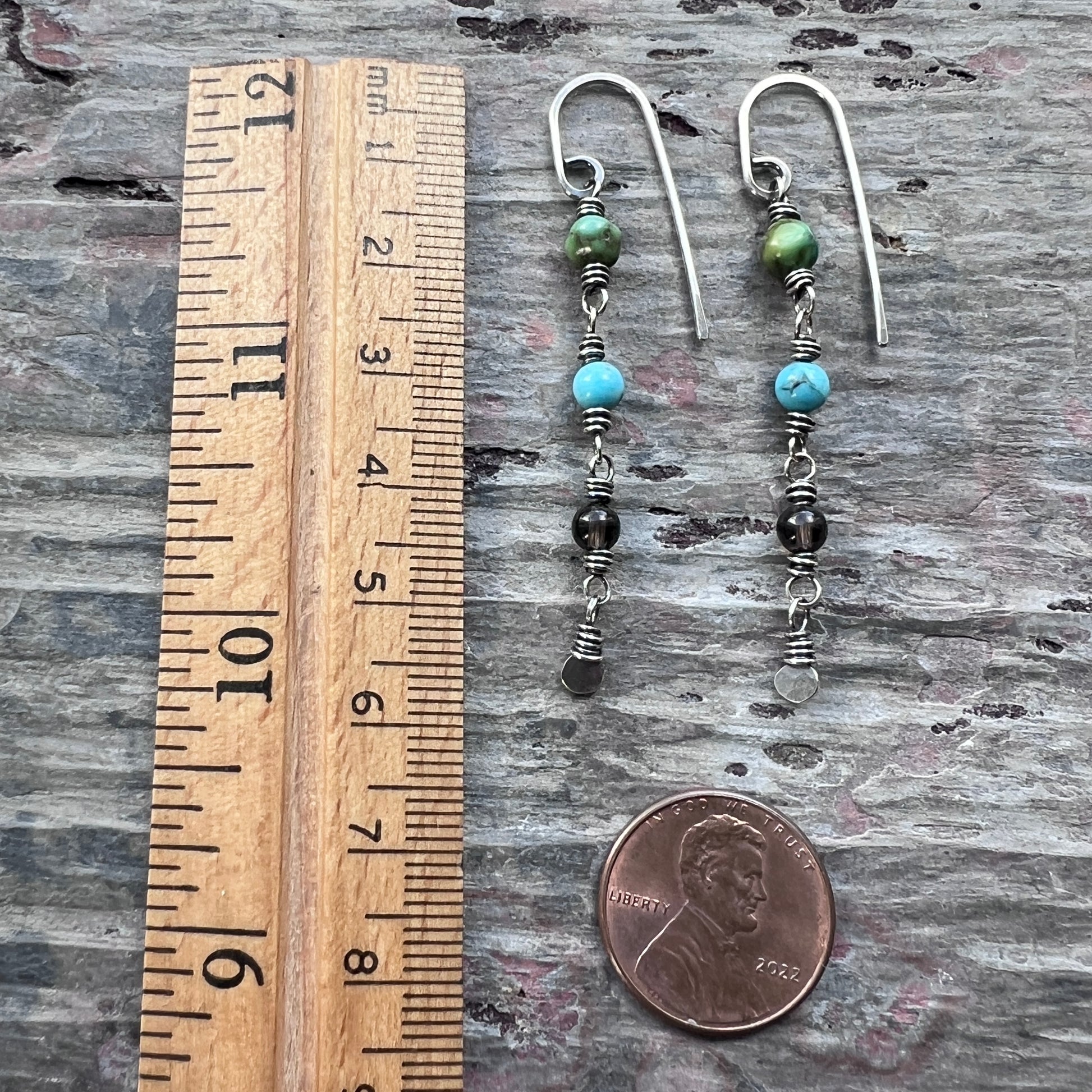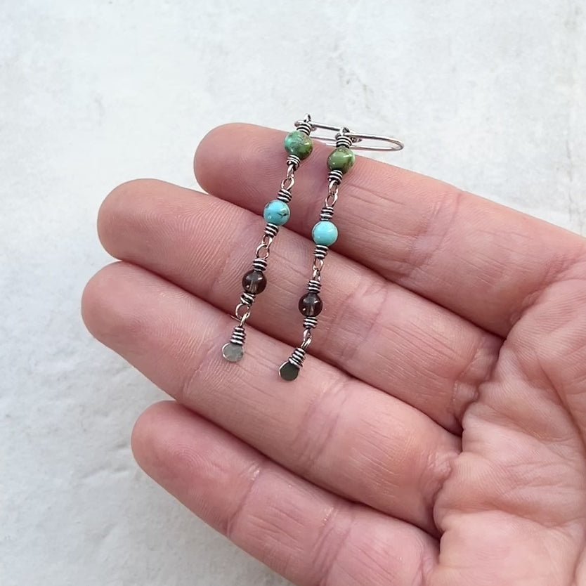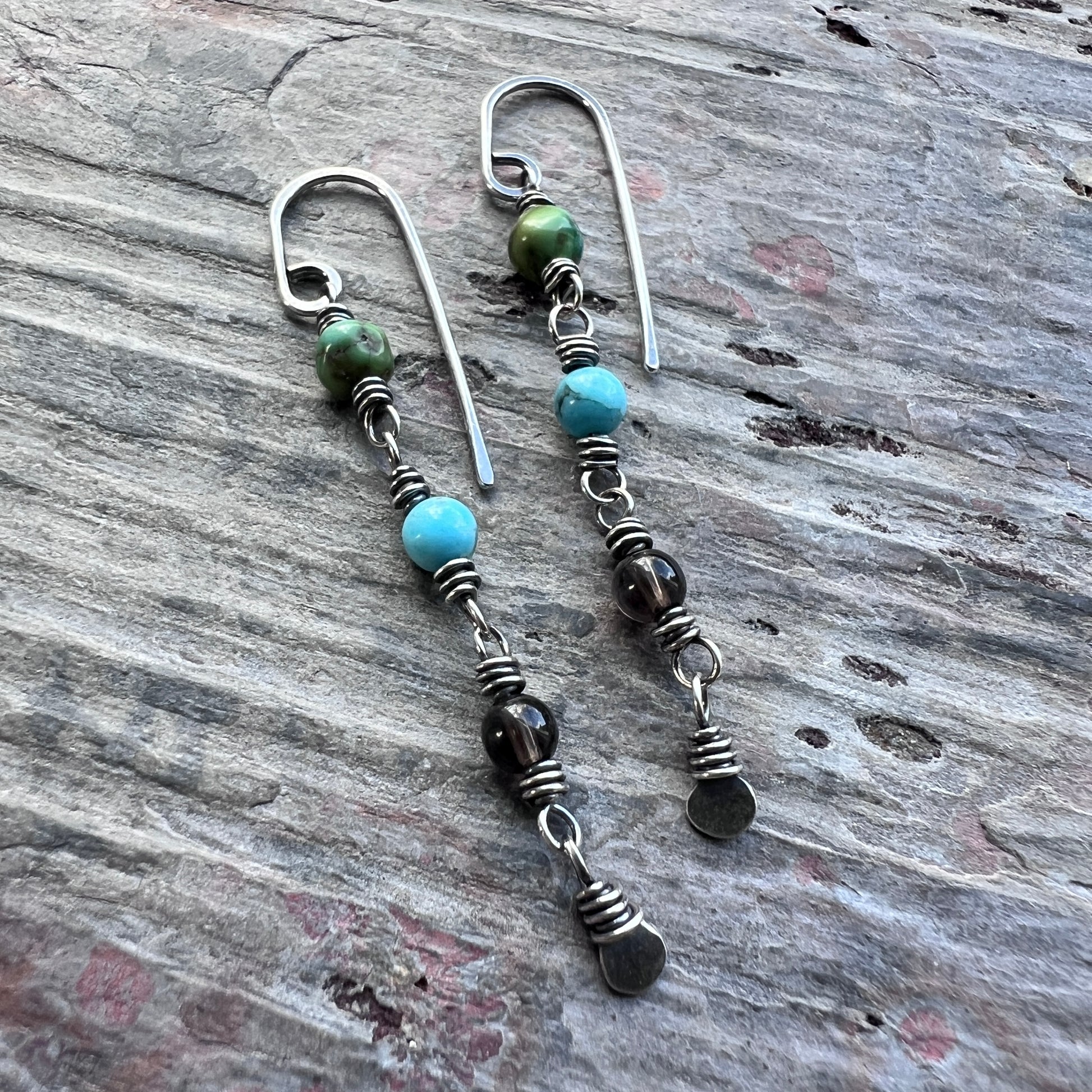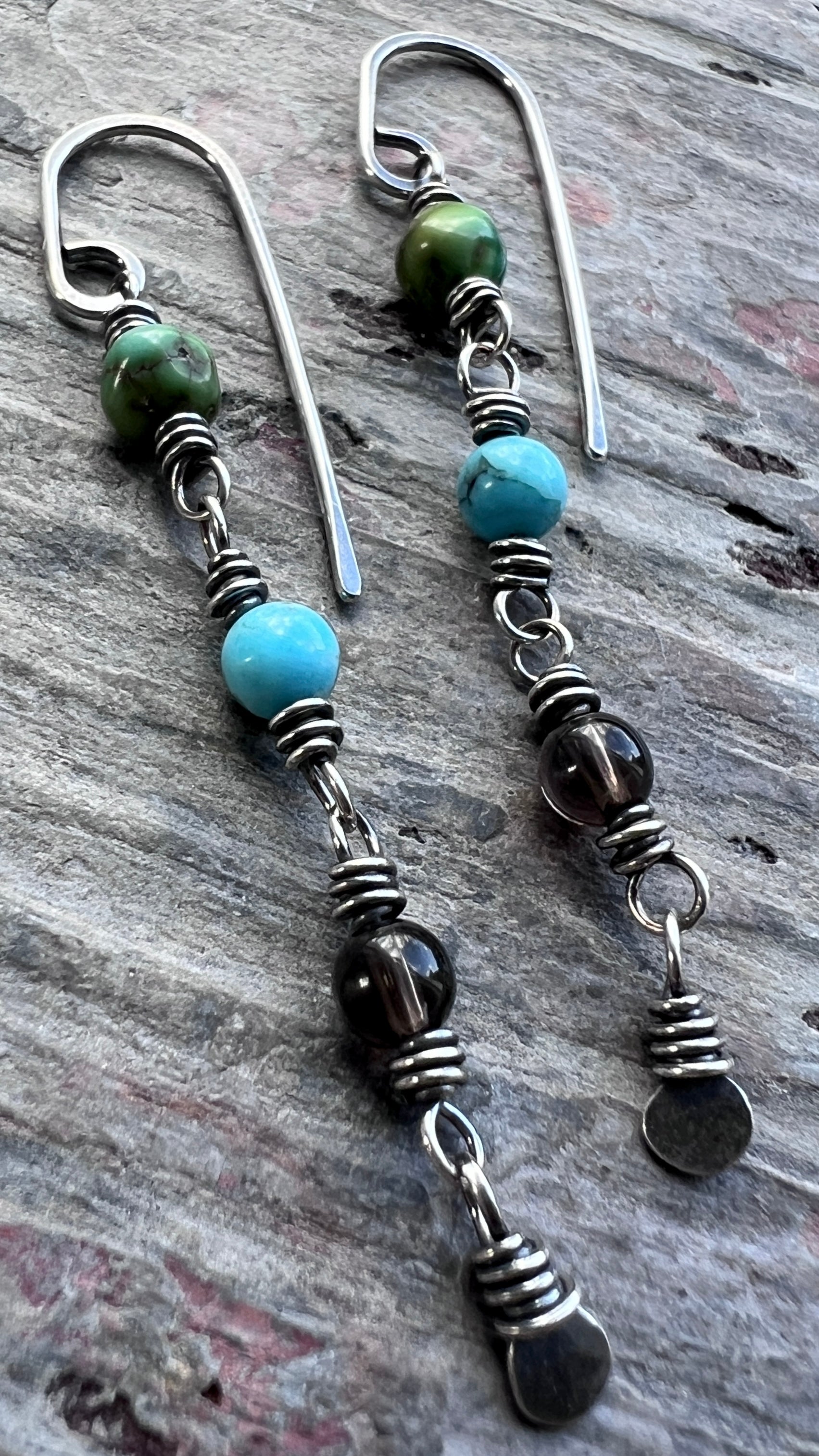 These long dangle earrings are handmade from sterling silver with genuine turquoise and smoky quartz beads. I have carefully wrapped the Sonoran lime turquoise, blue Kingman turquoise, and deep brown smoky quartz in sterling silver wire. The small stones dangle below handformed sterling silver earwires. The silver has been oxidized and polished to create an antique patina finish.