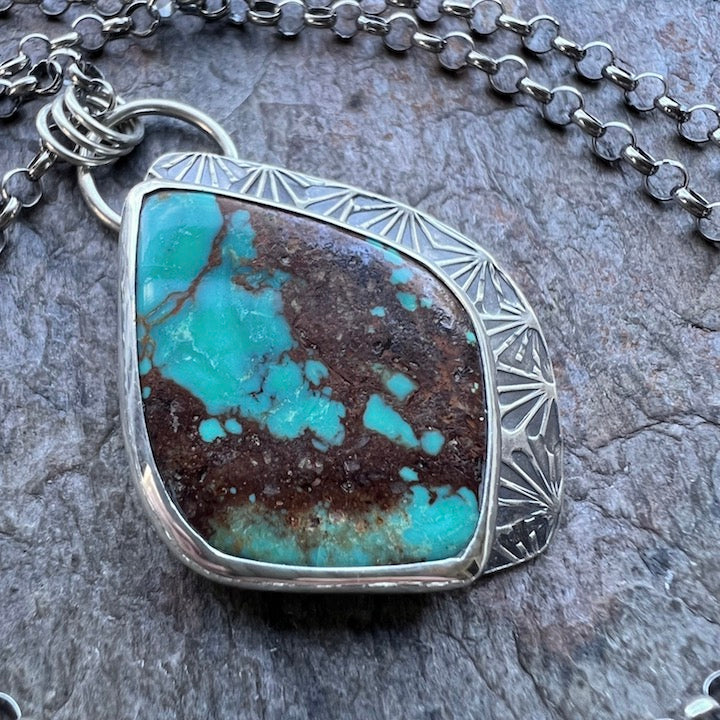 A natural American mined Turquoise stone has been set in sterling and fine silver. The stone is accented on one side by a stamped petal texture. This one-of-a-kind pendant has been formed, soldered, and finished entirely by hand. The pendant hangs from a sterling silver chain measuring about 20 inches in total length. I have oxidized and polished the silver to create an aged patina finish.