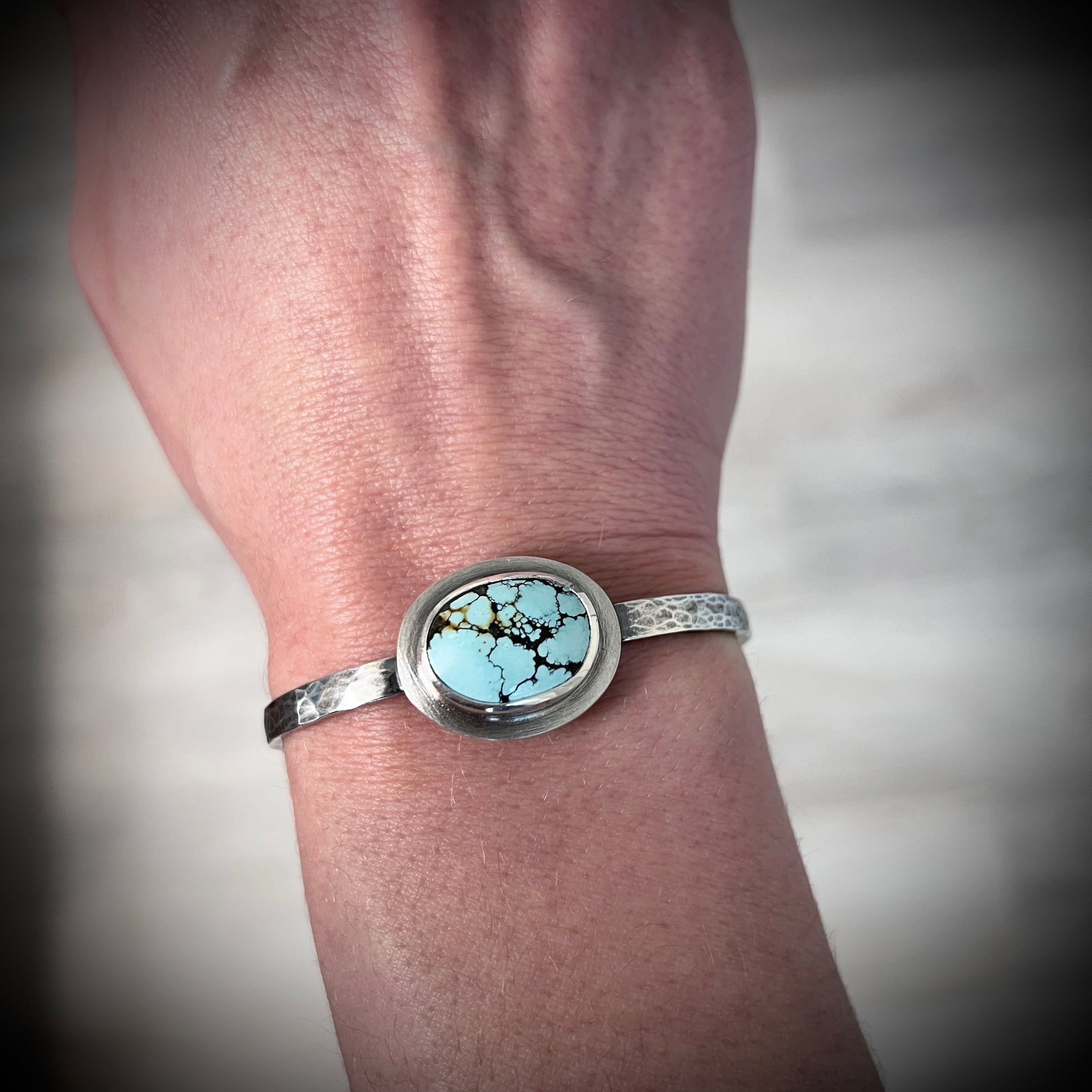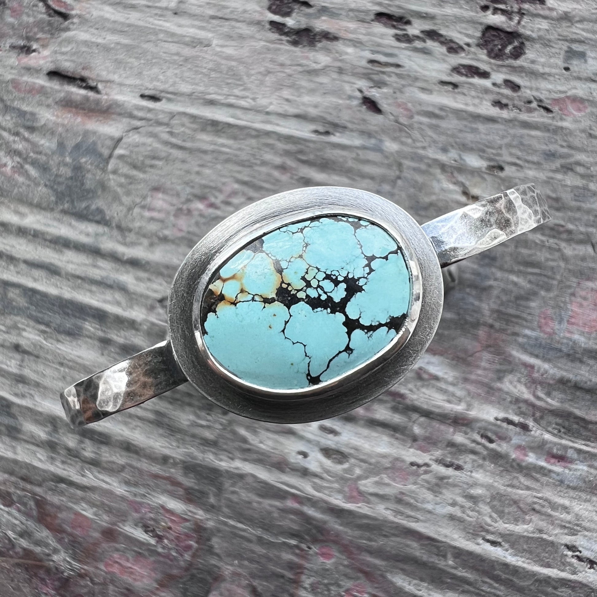 This hammered cuff bracelet is handmade from genuine turquoise and solid sterling silver. The natural turquoise cabochon is framed by a layer of sterling silver and sits upon a hammered silver cuff. I have made this one of a kind bracelet by sawing, soldering, texturing, and finishing the design entirely by hand. The silver has been oxidized and polished to create an antique patina finish.