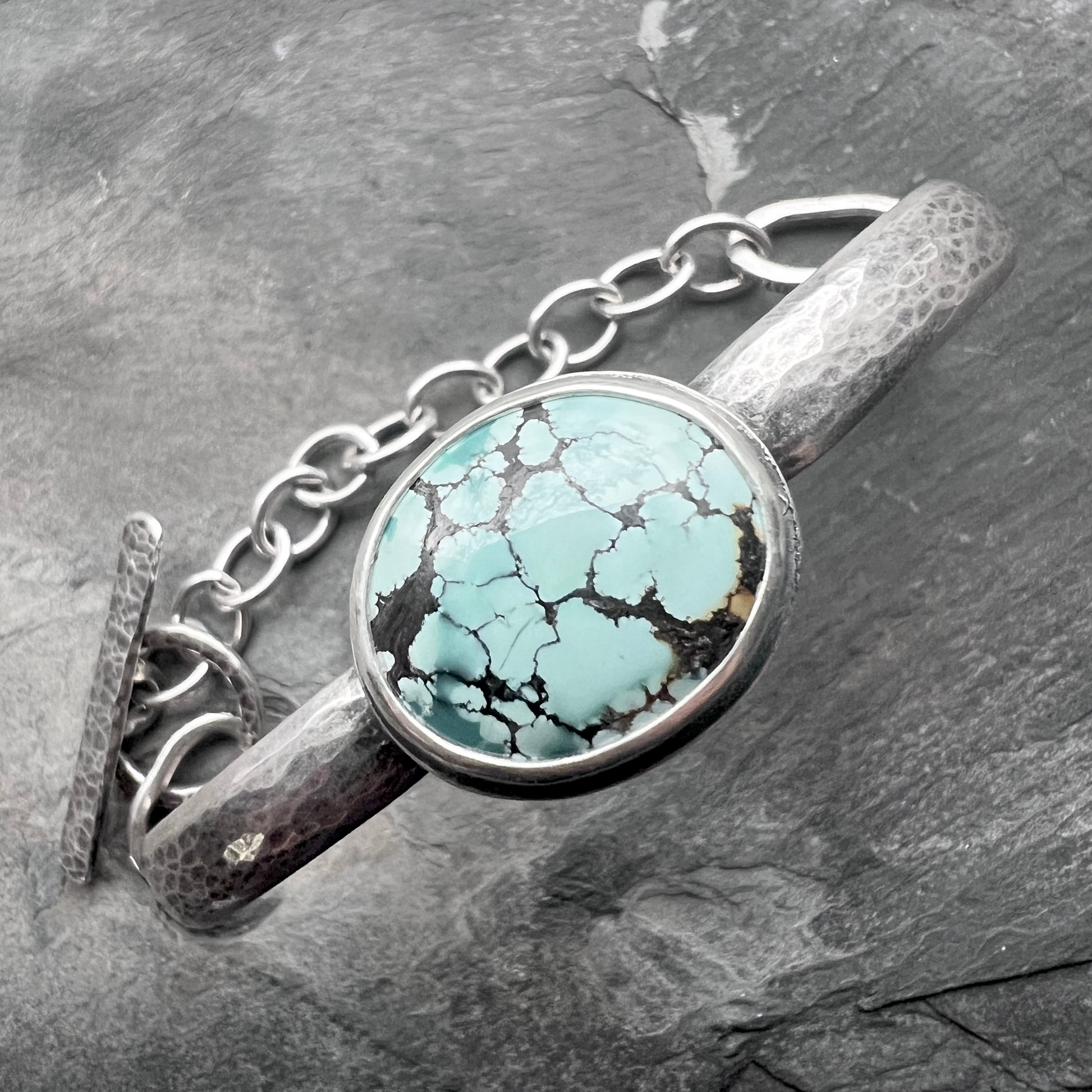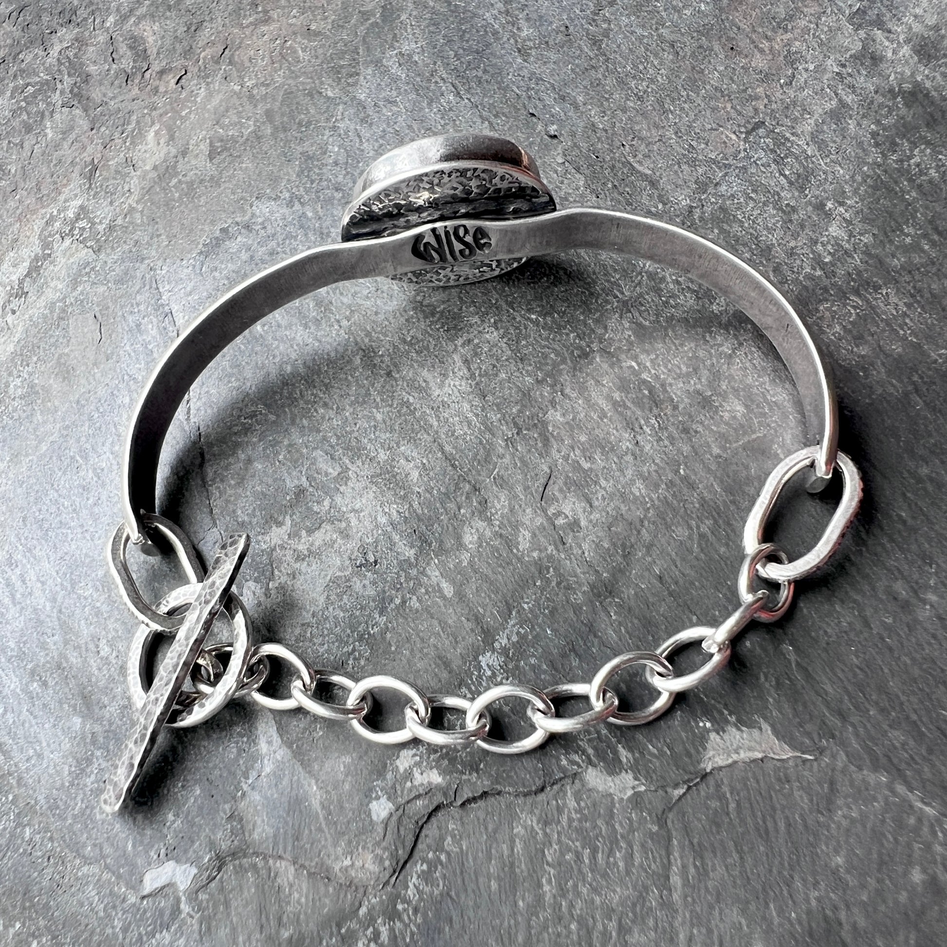 This hammered cuff bracelet is handmade from genuine turquoise and solid sterling silver. The natural turquoise cabochon is set in a silver bezel. The front of the bracelet is a hammered silver cuff with the back featuring chunky links and a toggle clasp. I have made this one of a kind bracelet by sawing, soldering, texturing, and finishing the design entirely by hand. The silver has been oxidized and polished to create an antique patina finish.