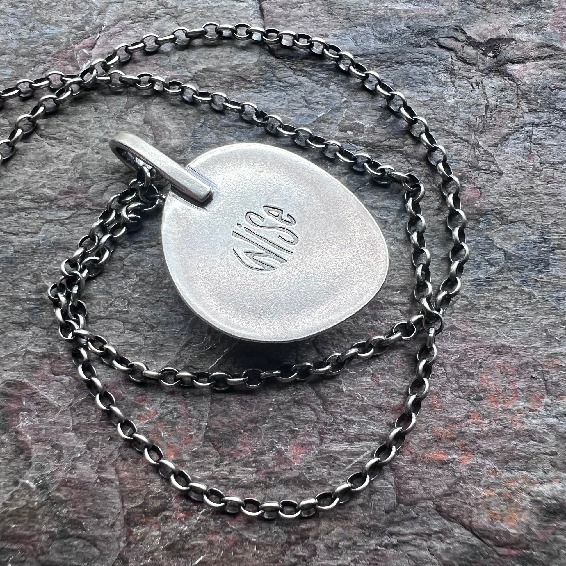 A genuine Turquoise stone has been set in sterling and fine silver. The stone is framed by a textured sterling silver border. This one-of-a-kind pendant has been formed, soldered, textured, and finished entirely by hand. The pendant hangs from a sterling silver chain featuring a 3 inch extender and lobster claw clasp. It can be worn from between 16 to 19 inches in total length. I have oxidized and polished the silver to create an aged patina finish.