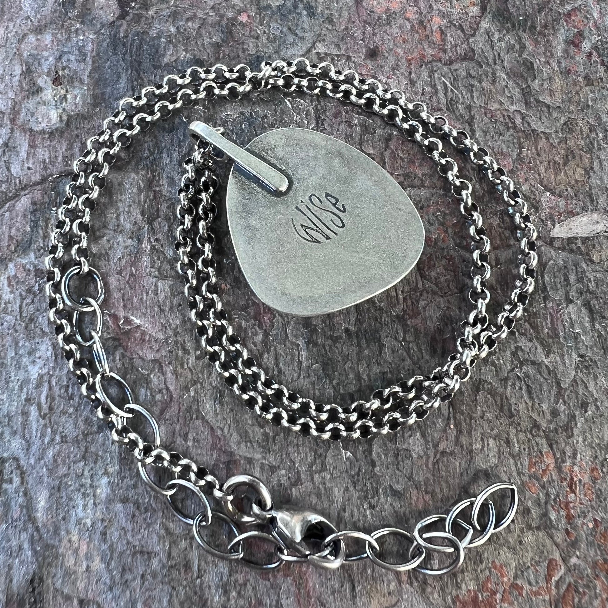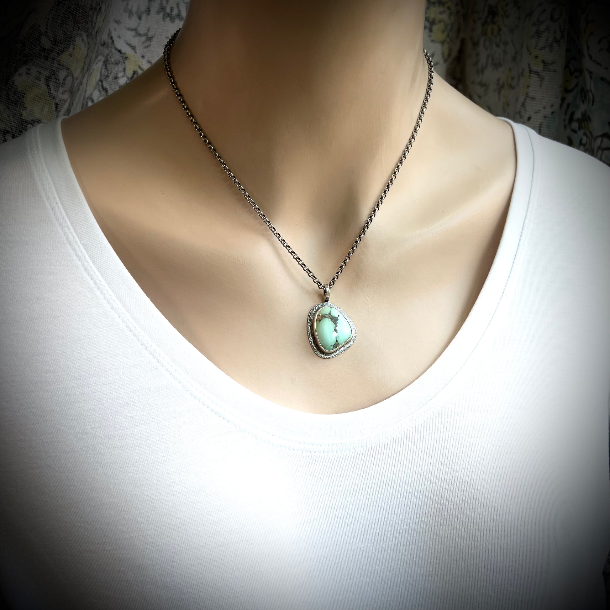 A genuine Turquoise stone has been set in sterling and fine silver. The pale aqua stone is framed by a textured sterling silver border. This one-of-a-kind pendant has been formed, soldered, textured, and finished entirely by hand. The pendant hangs from a sterling silver chain featuring a 3 inch extender and lobster claw clasp. It can be worn from between 16 to 19 inches in total length. I have oxidized and polished the silver to create an aged patina finish.