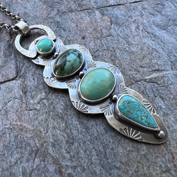 A mix of four American mined Turquoise cabochons are set in sterling and fine silver. The stones are accented by stamped designs and small silver granules. This one-of-a-kind pendant has been formed, soldered, textured, and finished entirely by hand. The pendant hangs from a sterling silver chain measuring about 26 inches in total length. The chain features a handmade hook clasp. I have oxidized and polished the silver to create an aged patina finish.
