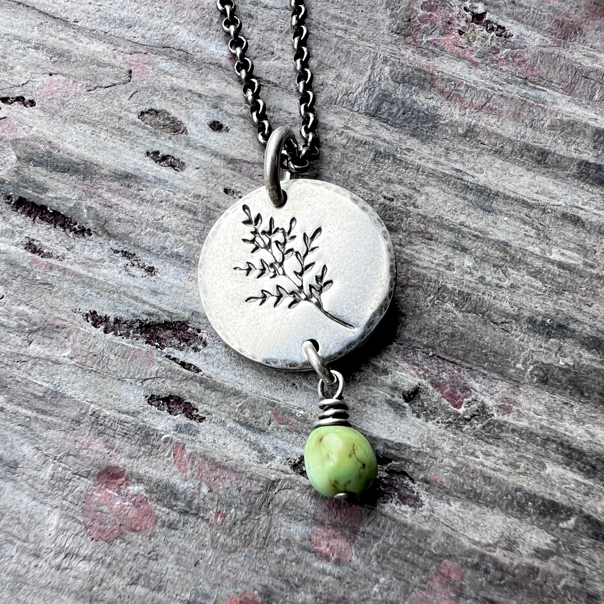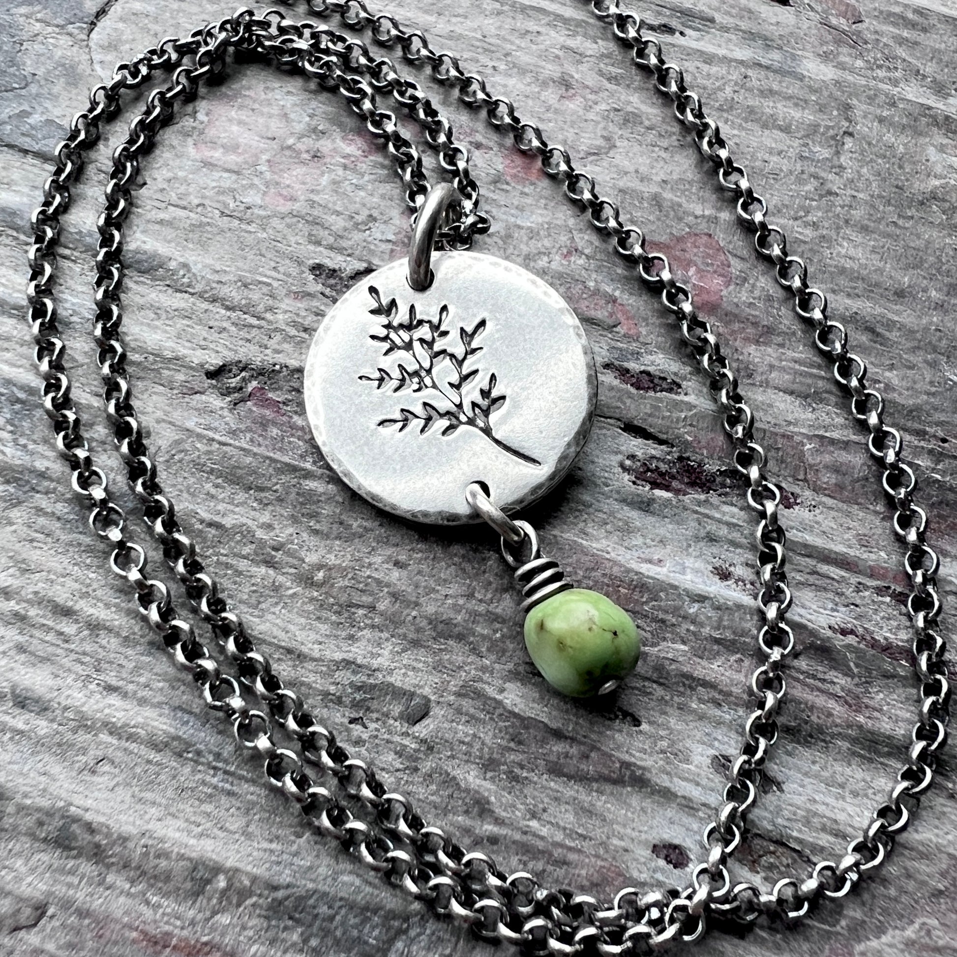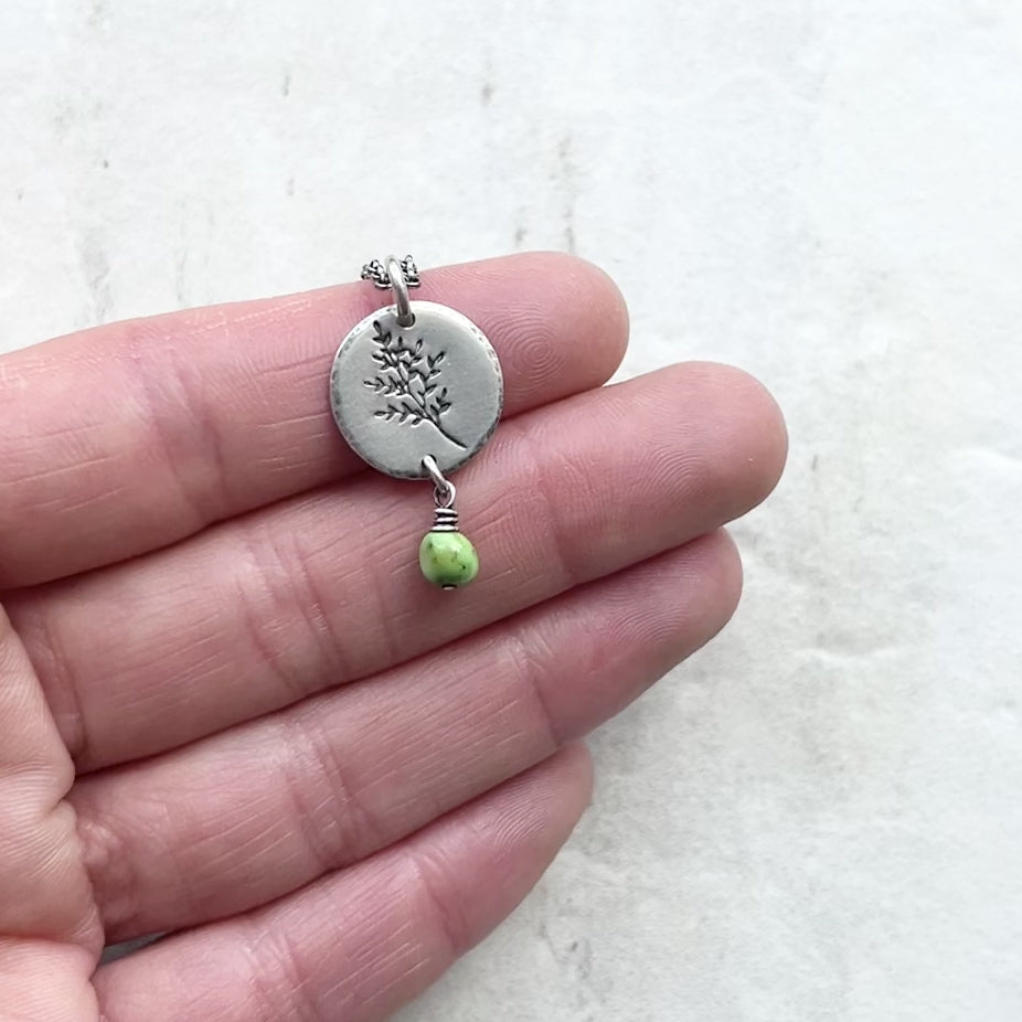 This pendant necklace is handmade from a genuine turquoise nugget and sterling silver. The natural Sonoran lime turquoise dangles below a sterling silver circle which has been impressed with a sprig leaf design. The silver has been oxidized and polished to create an antique patina finish.