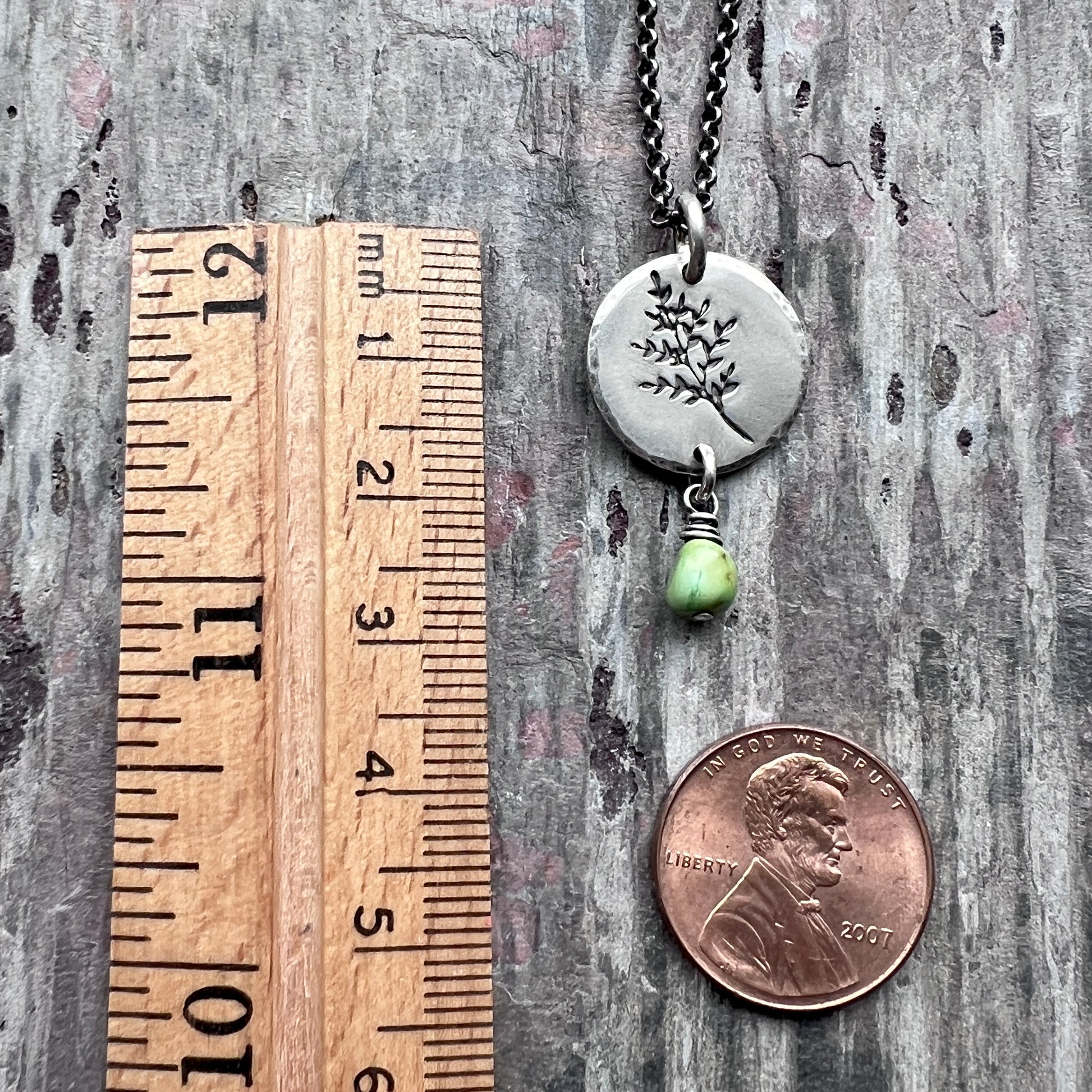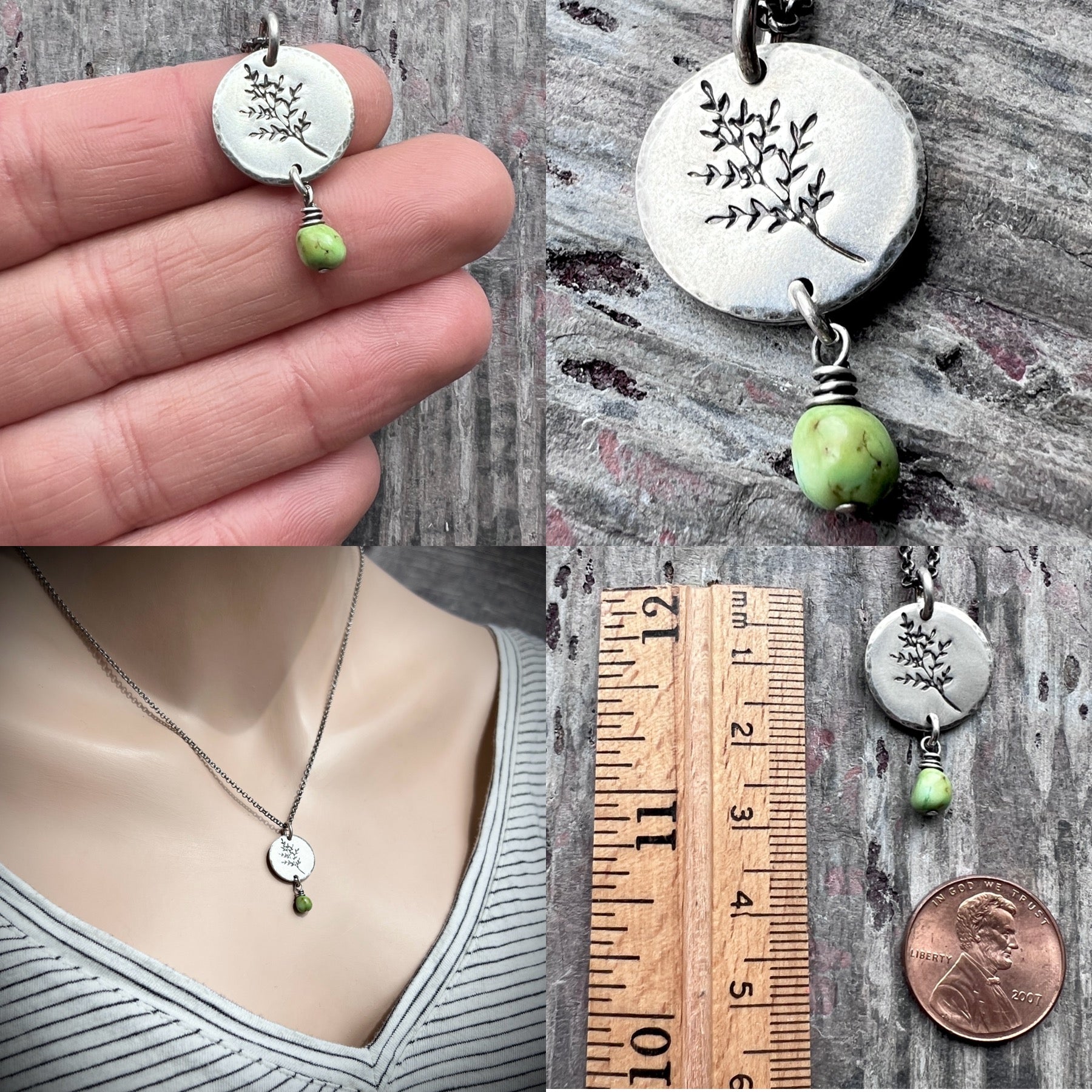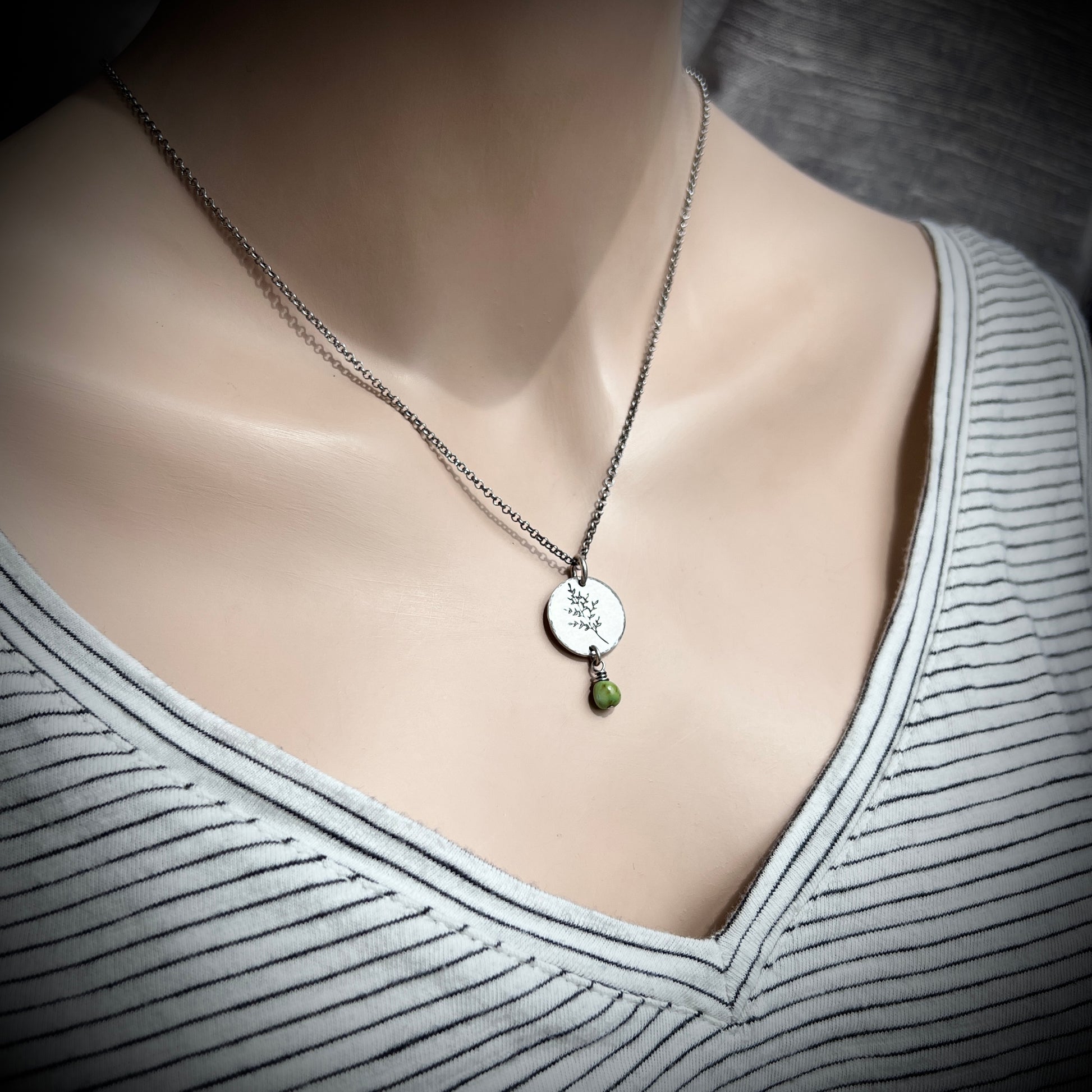 This pendant necklace is handmade from a genuine turquoise nugget and sterling silver. The natural Sonoran lime turquoise dangles below a sterling silver circle which has been impressed with a sprig leaf design. The silver has been oxidized and polished to create an antique patina finish.
