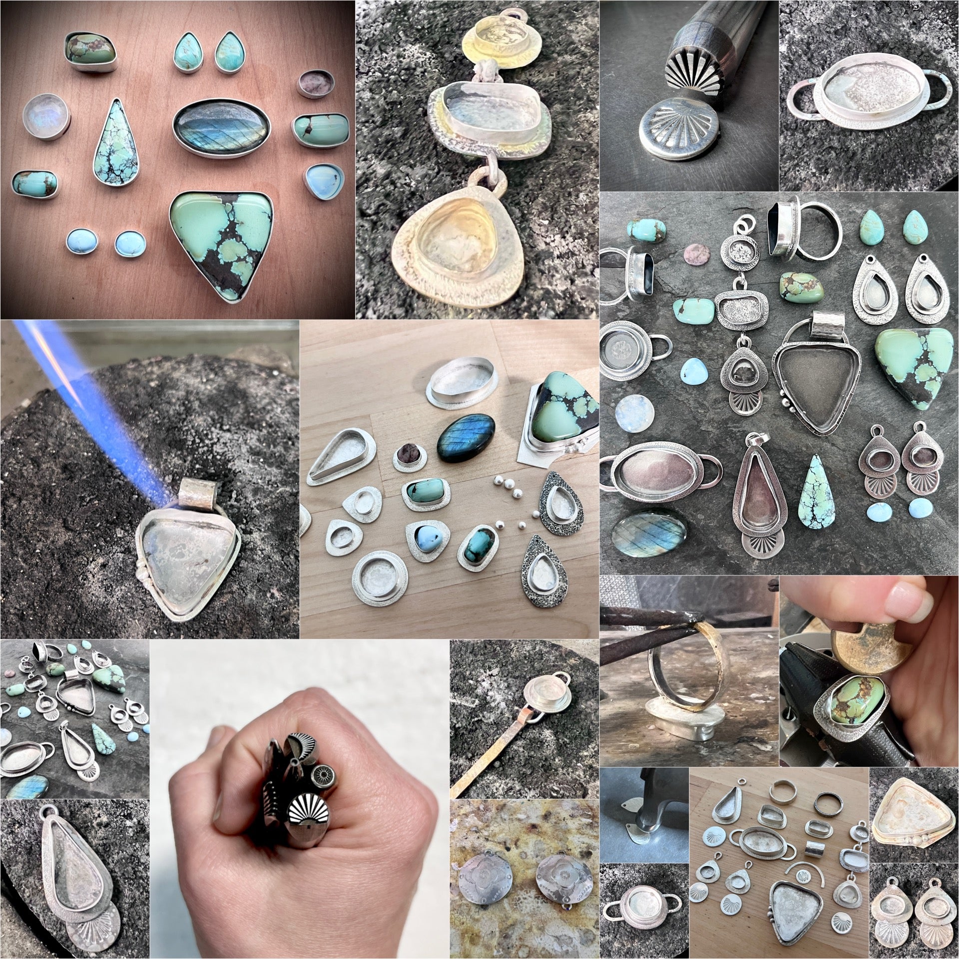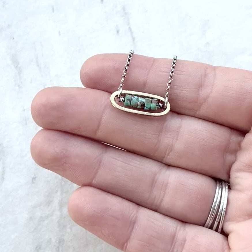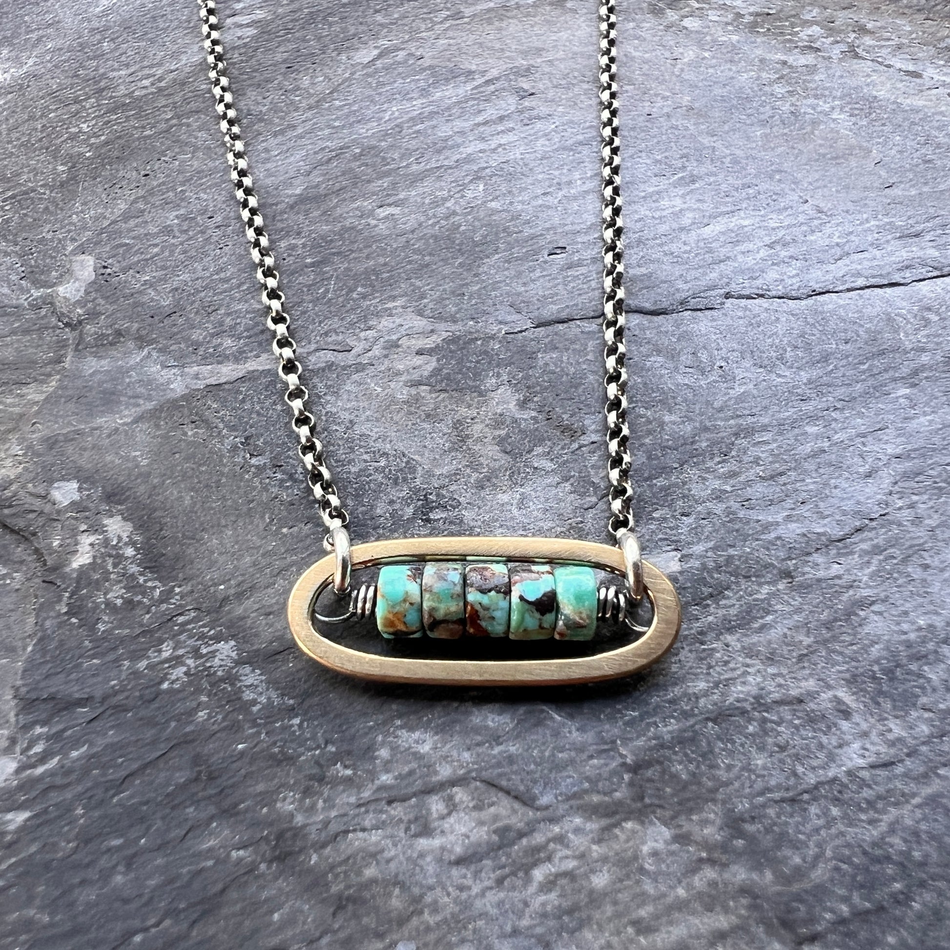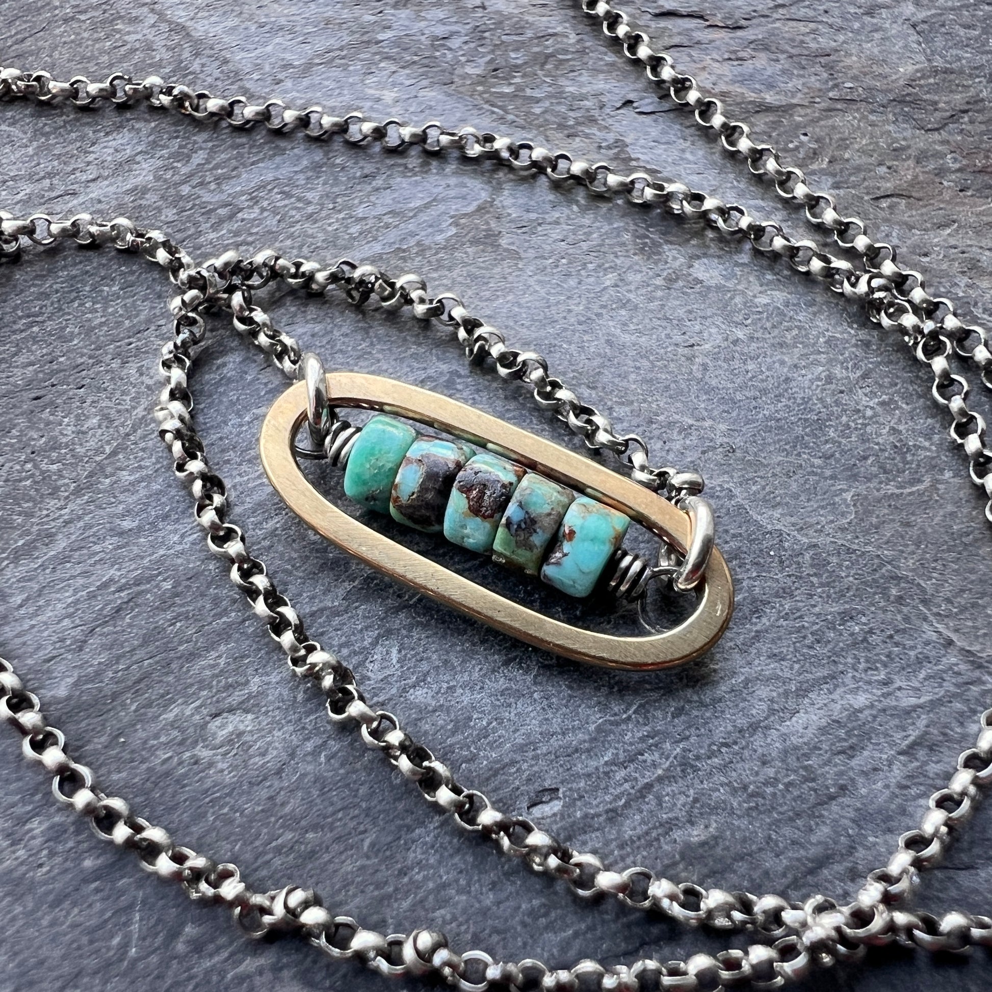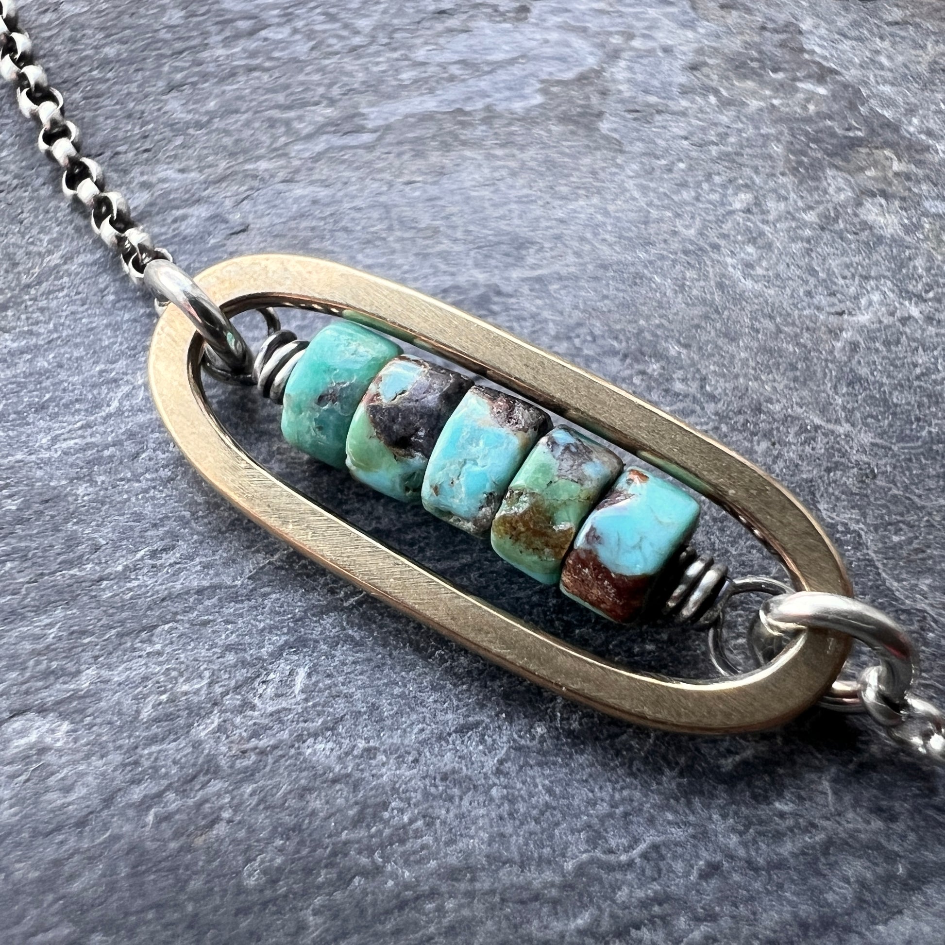 This mixed metal necklace is handmade from genuine turquoise, sterling silver, and golden brass. The natural turquoise stones are blue-green with brown matrix throughout. The small stones are framed by a brass link which I have formed, soldered, and hammered flat by hand. The pendant is suspended along a lightweight sterling silver chain.