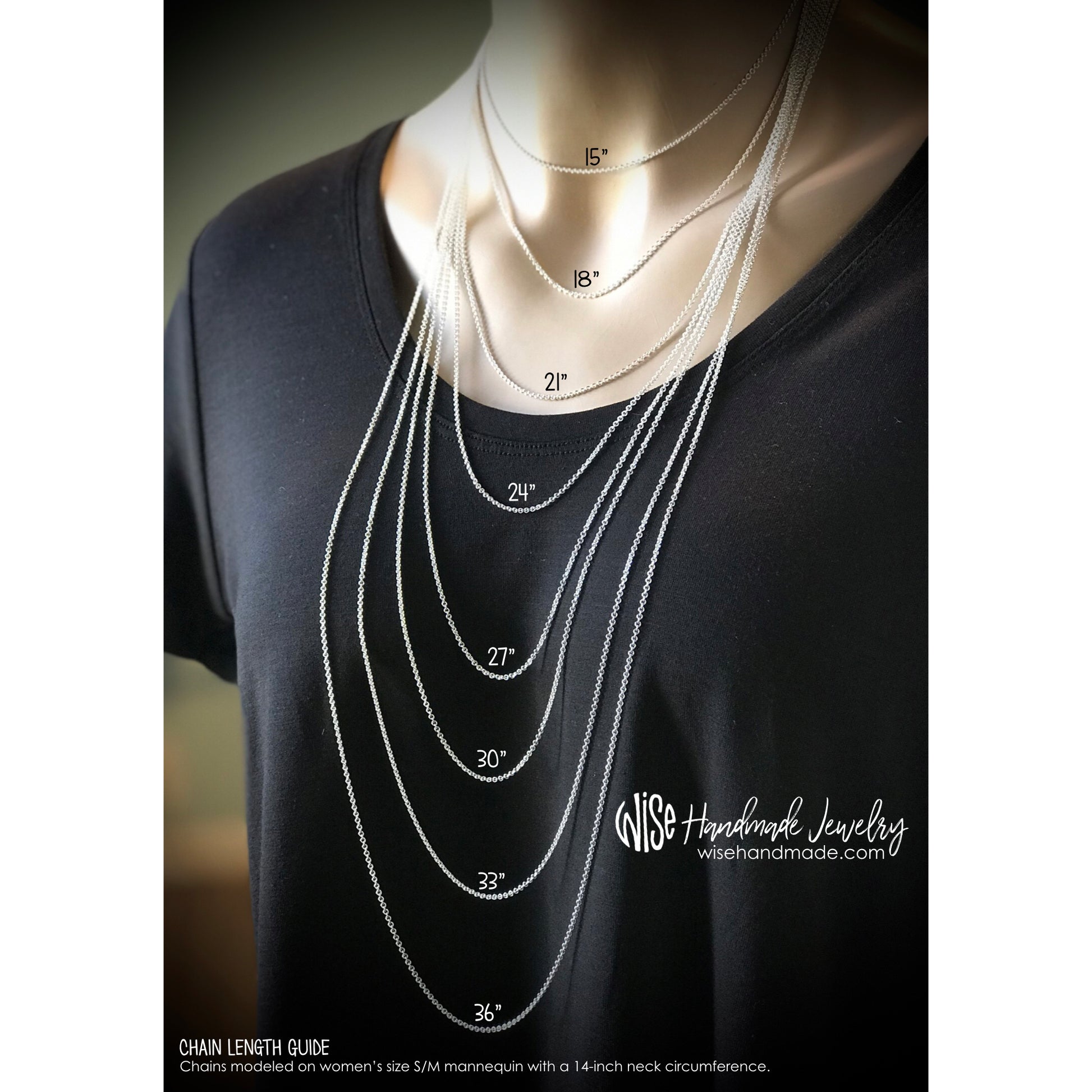 The necklace photographed is shown at an 18-inch length modeled on a women's size S/M mannequin with a 14-inch neck circumference.