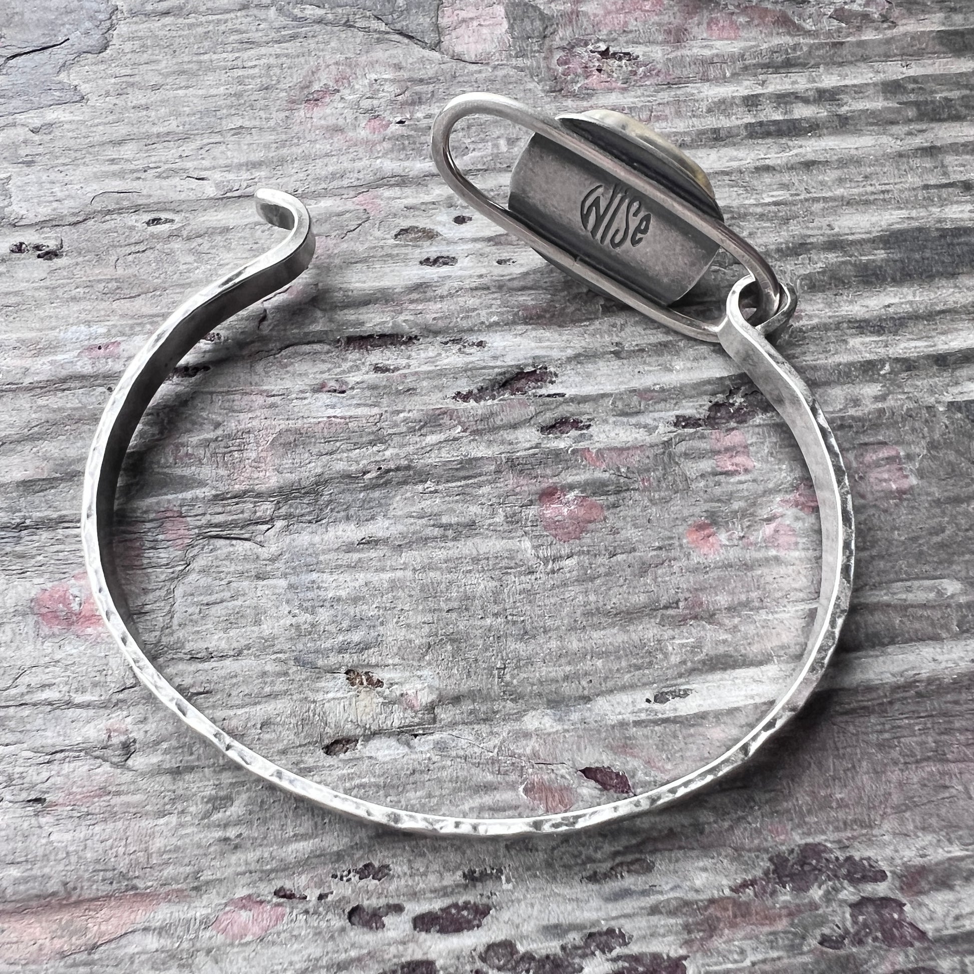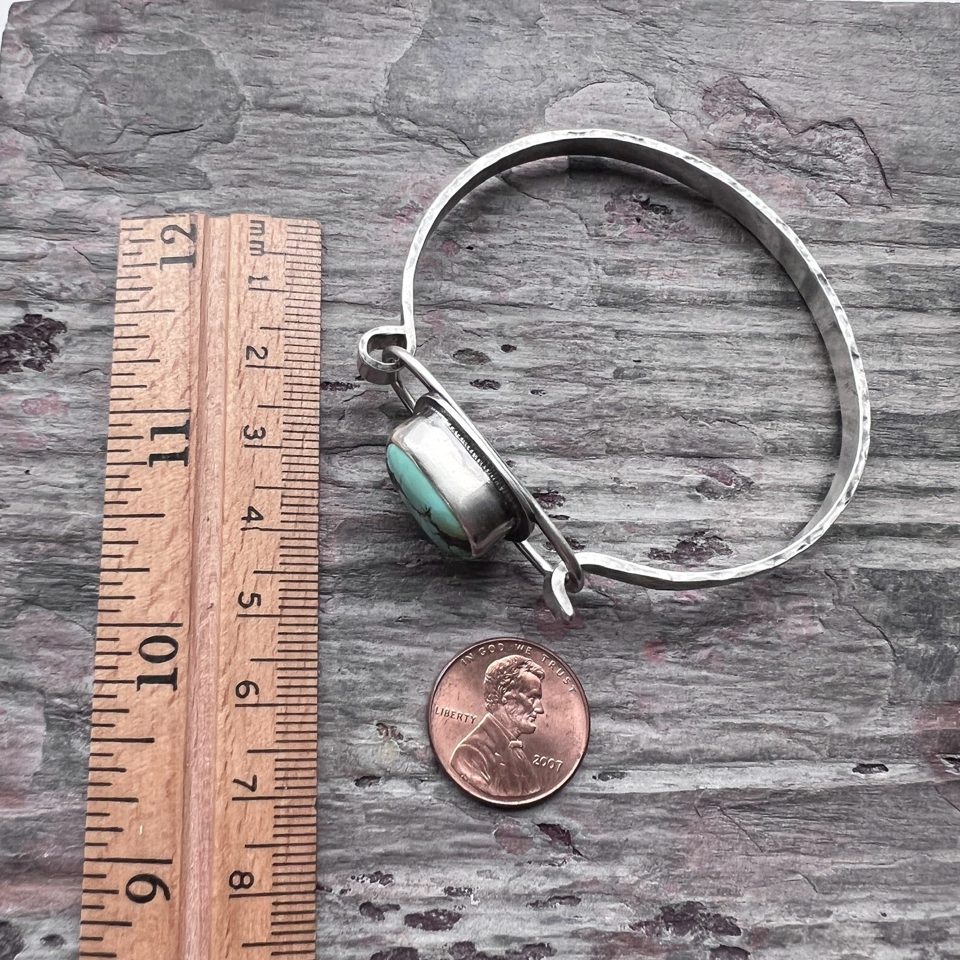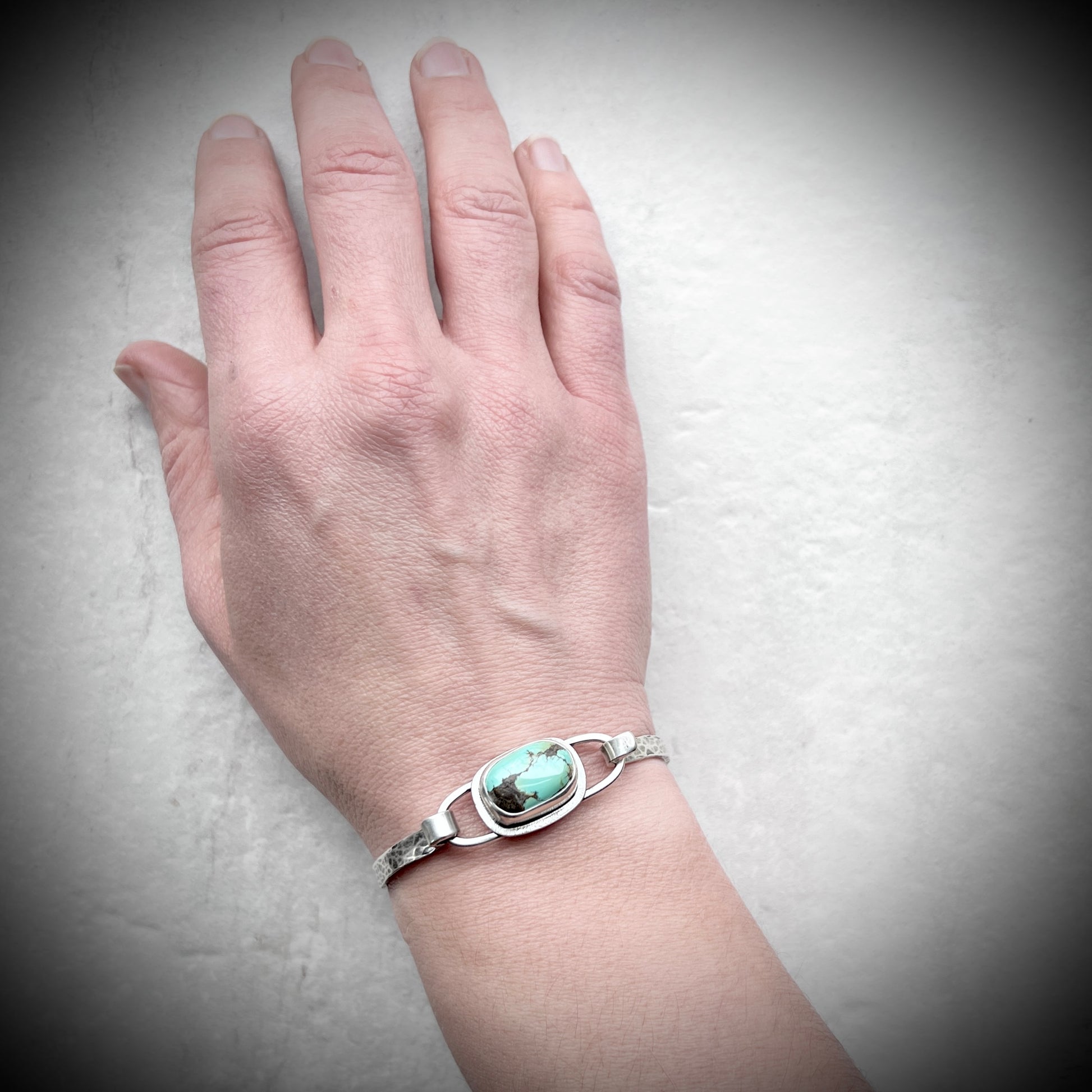 This artisan tension cuff bracelet is handmade from genuine turquoise and solid sterling silver. The natural turquoise cabochon has been set in textured silver and features a hammered silver cuff. I have made this unique bracelet by sawing, soldering, texturing, and finishing the design entirely by hand. The silver has been oxidized and polished to create an antique patina finish.
