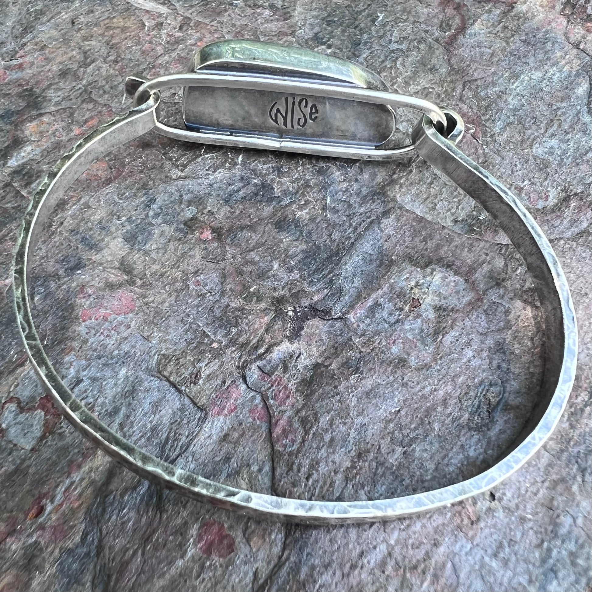 A genuine turquoise cabochon has been set in sterling and fine silver. I have made this one-of-a-kind bracelet by sawing, soldering, texturing, and finishing the design entirely by hand. The silver has been oxidized and polished to create a patina finish.