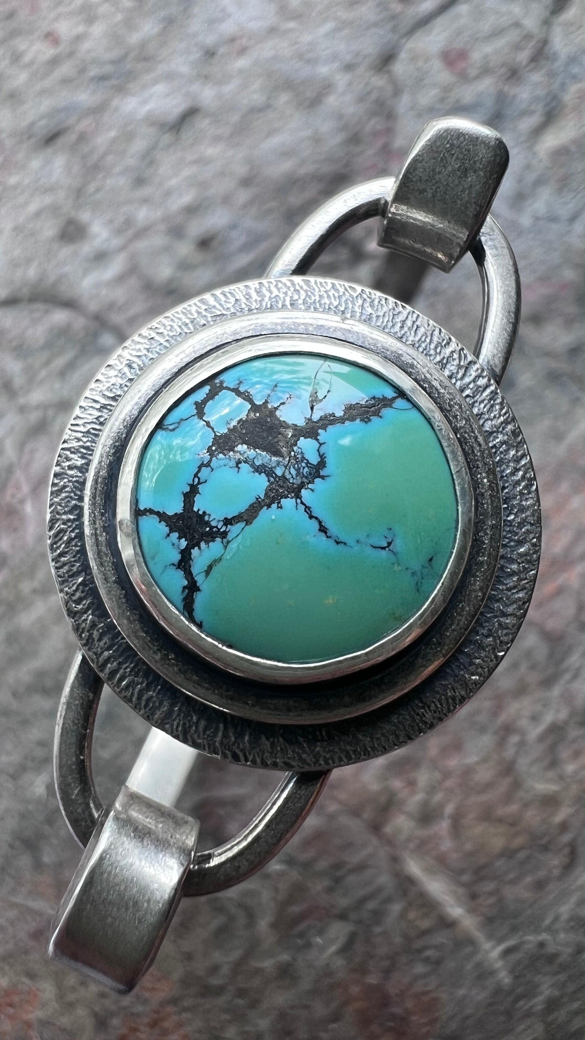 A genuine turquoise cabochon has been set in sterling and fine silver. I have made this one-of-a-kind bracelet by sawing, soldering, texturing, and finishing the design entirely by hand. The silver has been oxidized and polished to create a patina finish.