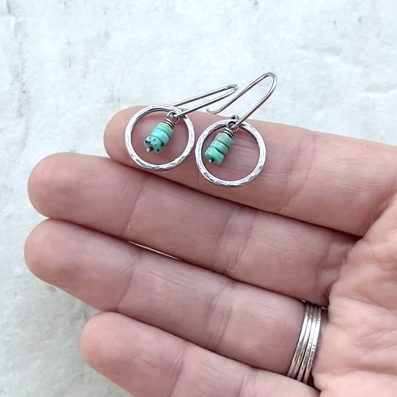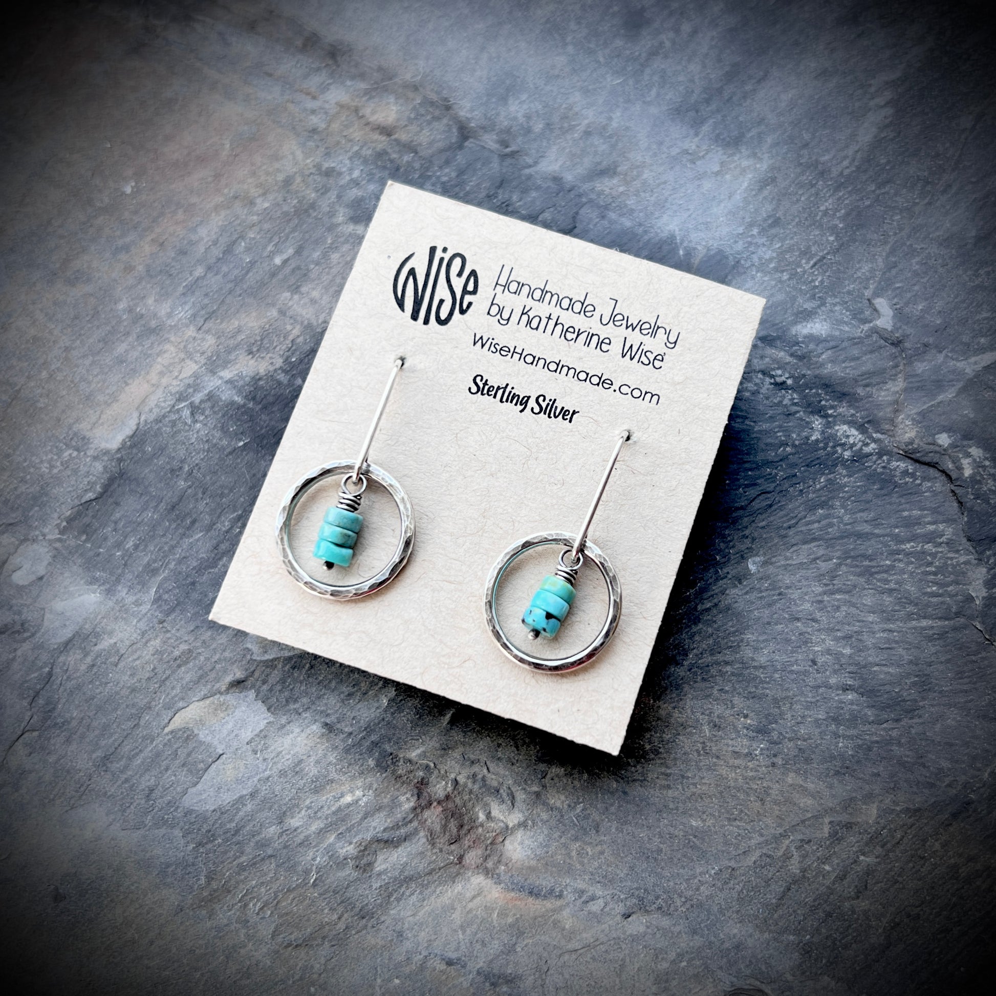 These dangle earrings are handmade from genuine turquoise and sterling silver. A set of natural turquoise stones have been wrapped in sterling silver. The small blue-green stones are framed by sterling silver circles which I have formed, soldered, and hammered by hand. The earrings dangle from handmade sterling silver earwires.
