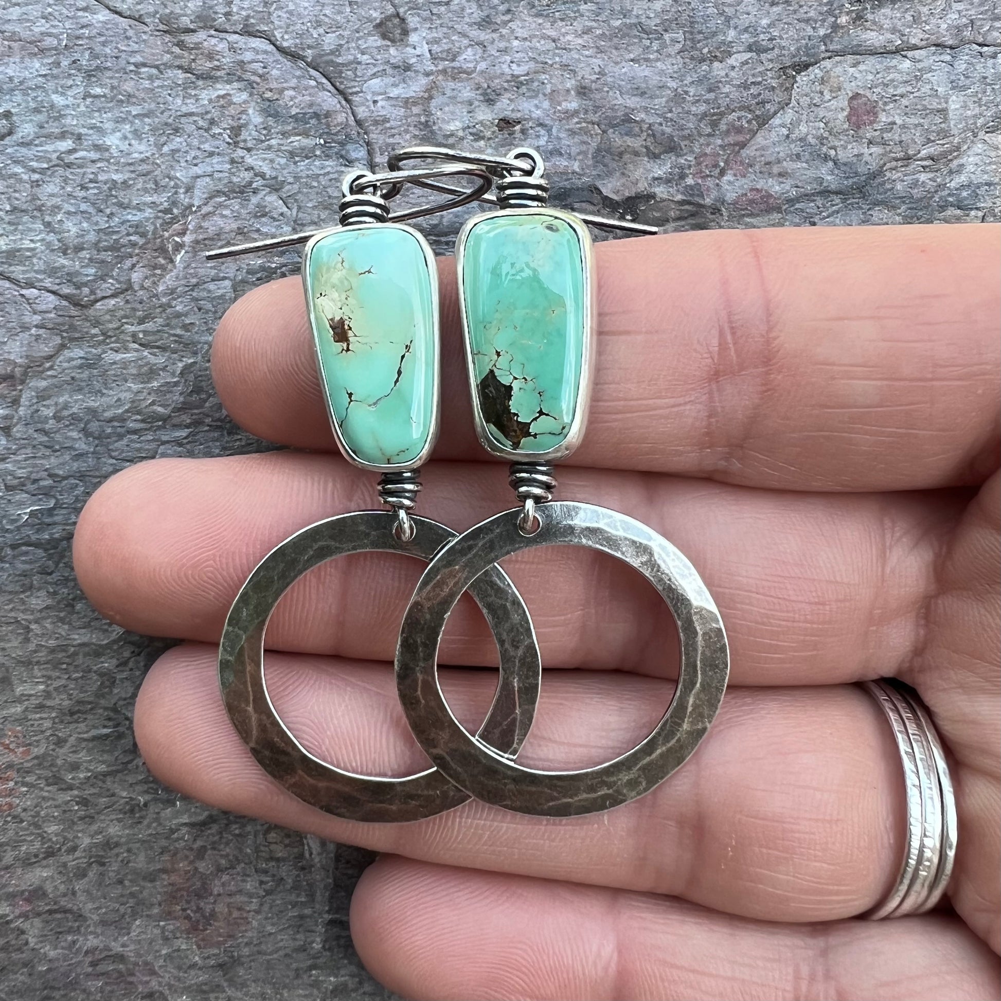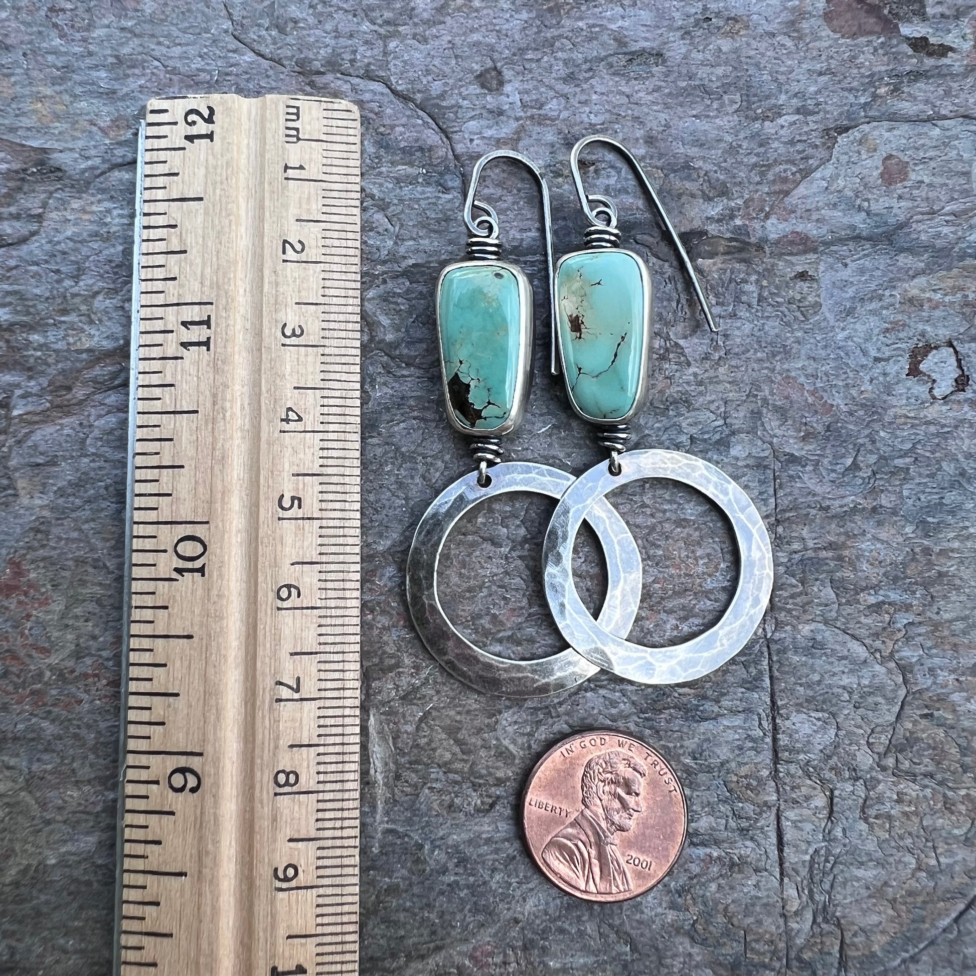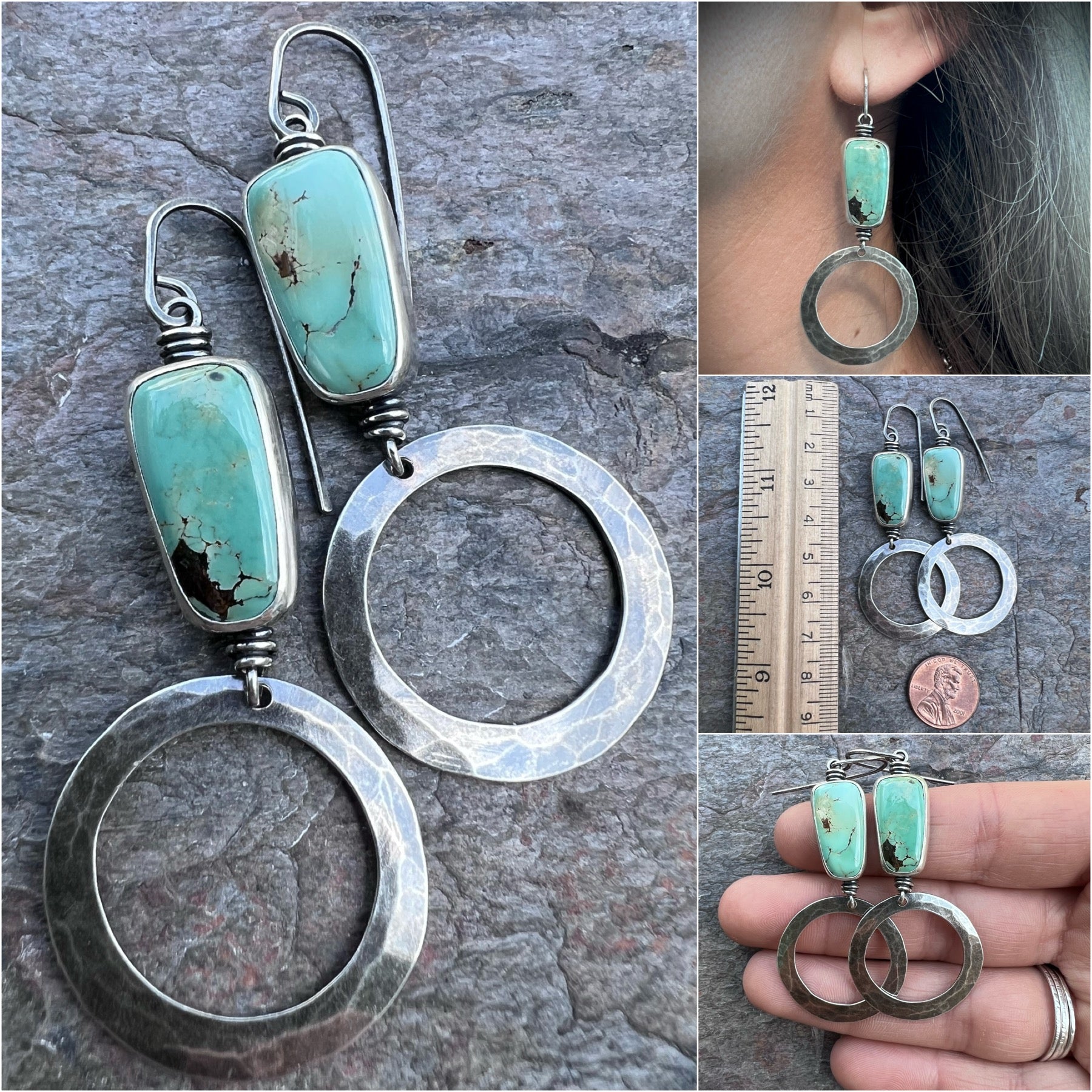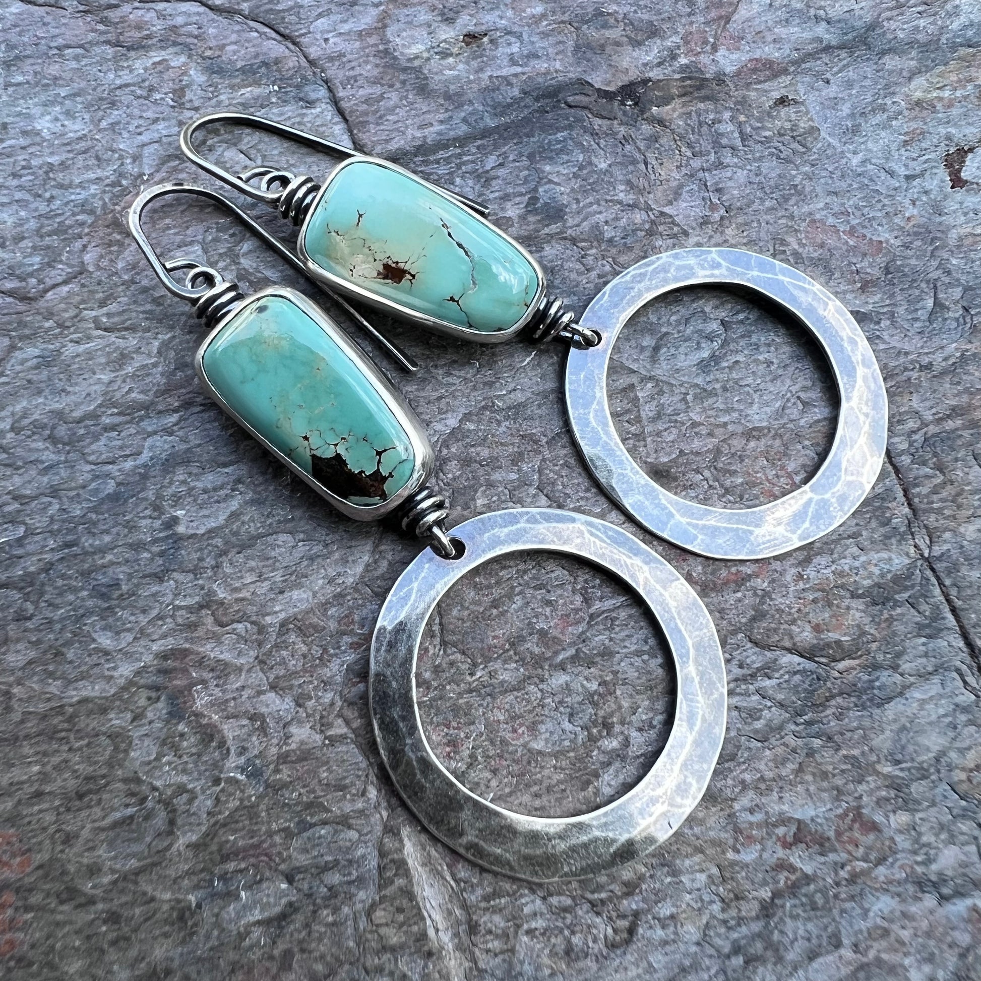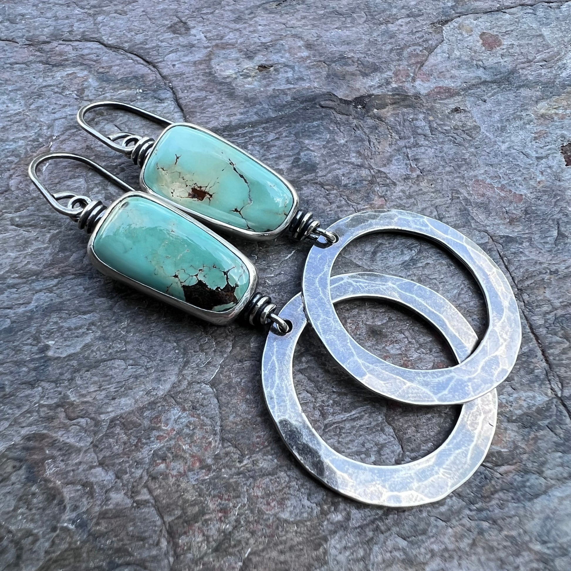 Turquoise Sterling Silver Hammered Hoop Earrings - Handmade One-of-a-kind Earrings