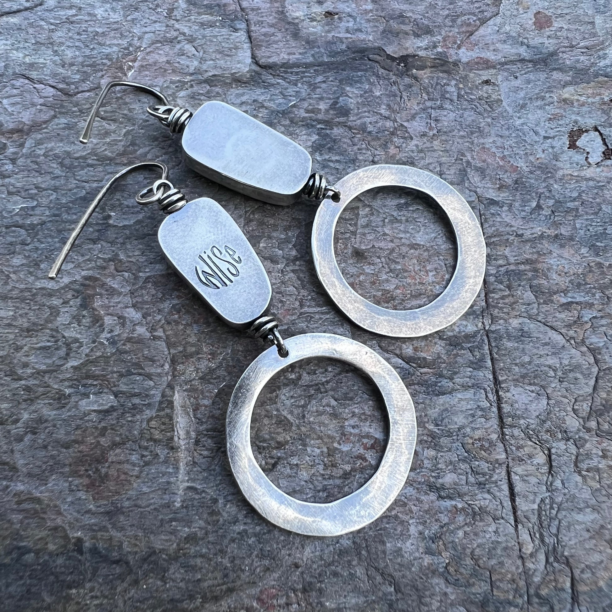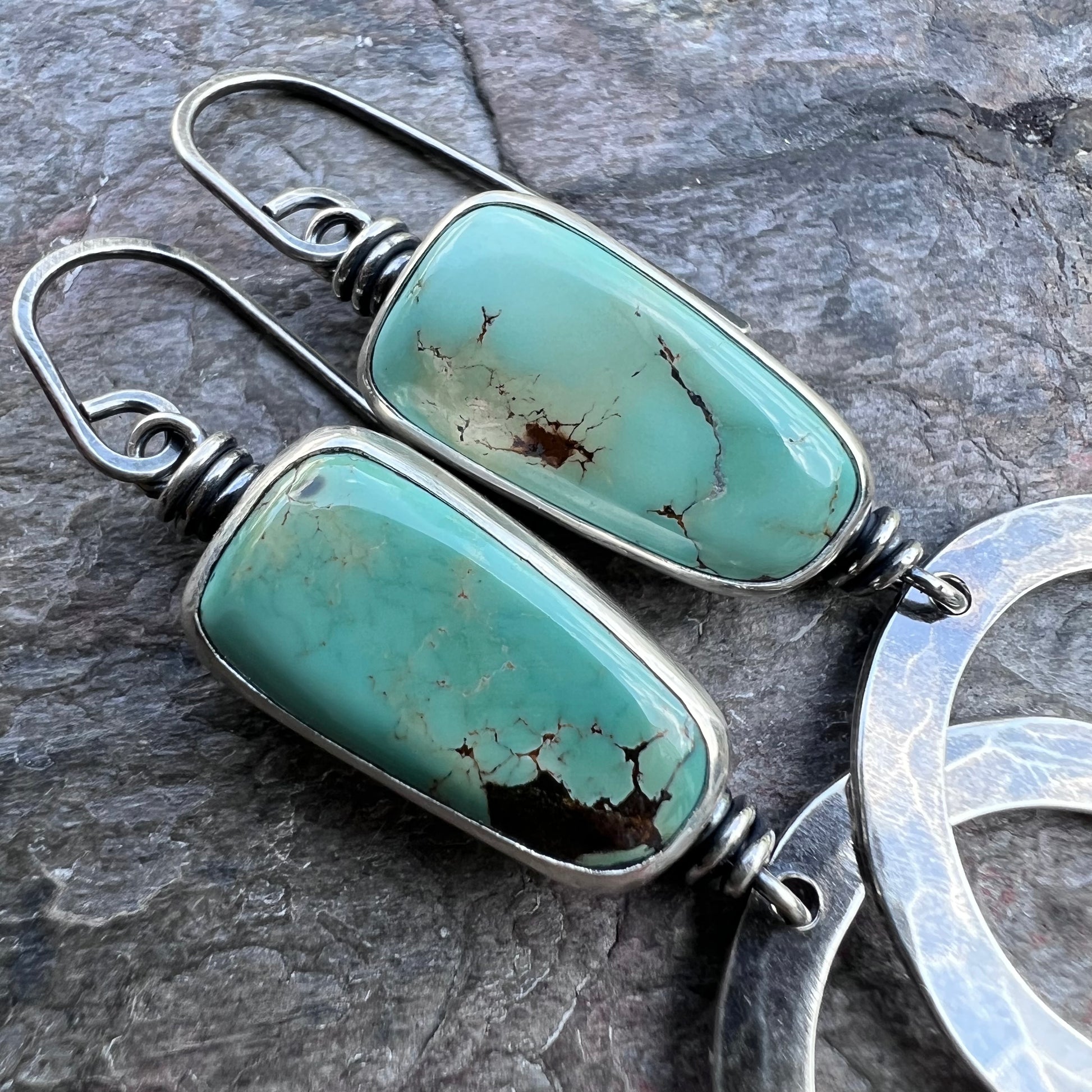 A pair of genuine turquoise cabochons have been set in sterling and fine silver. Below the turquoise dangle hammered sterling silver hoops. I have made these one-of-a-kind earrings by sawing, soldering, texturing, and finishing the design entirely by hand. Earrings dangle from handformed sterling silver earwires. The silver has been oxidized and polished to create a patina finish.