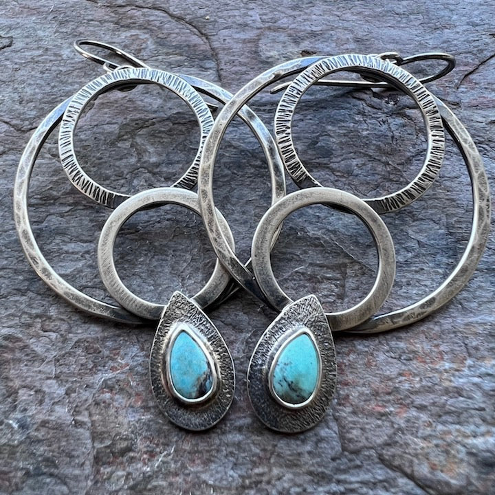 Turquoise Sterling Silver Earrings - One-of-a-Kind Turquoise Teardrops and Textured Sterling Silver Circles