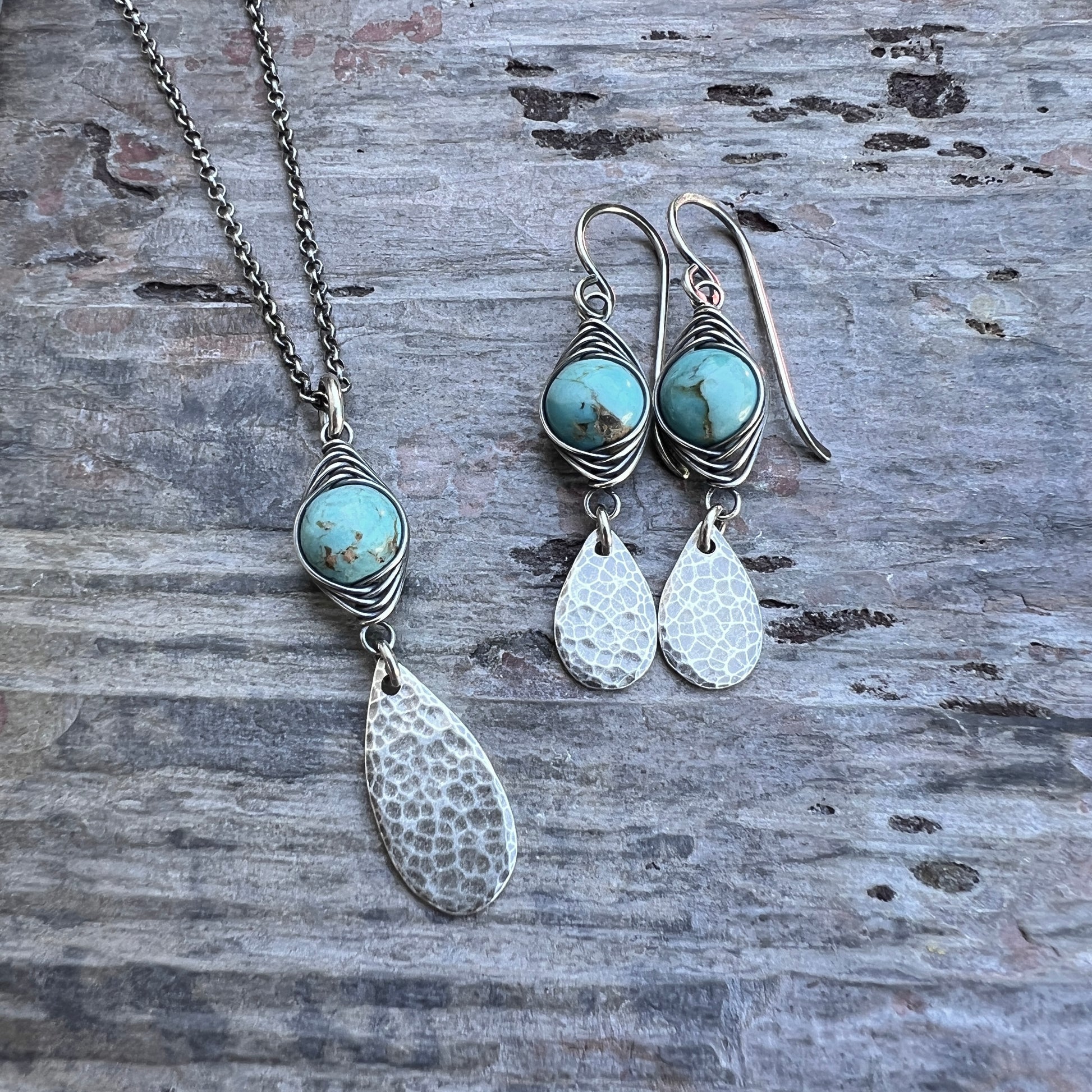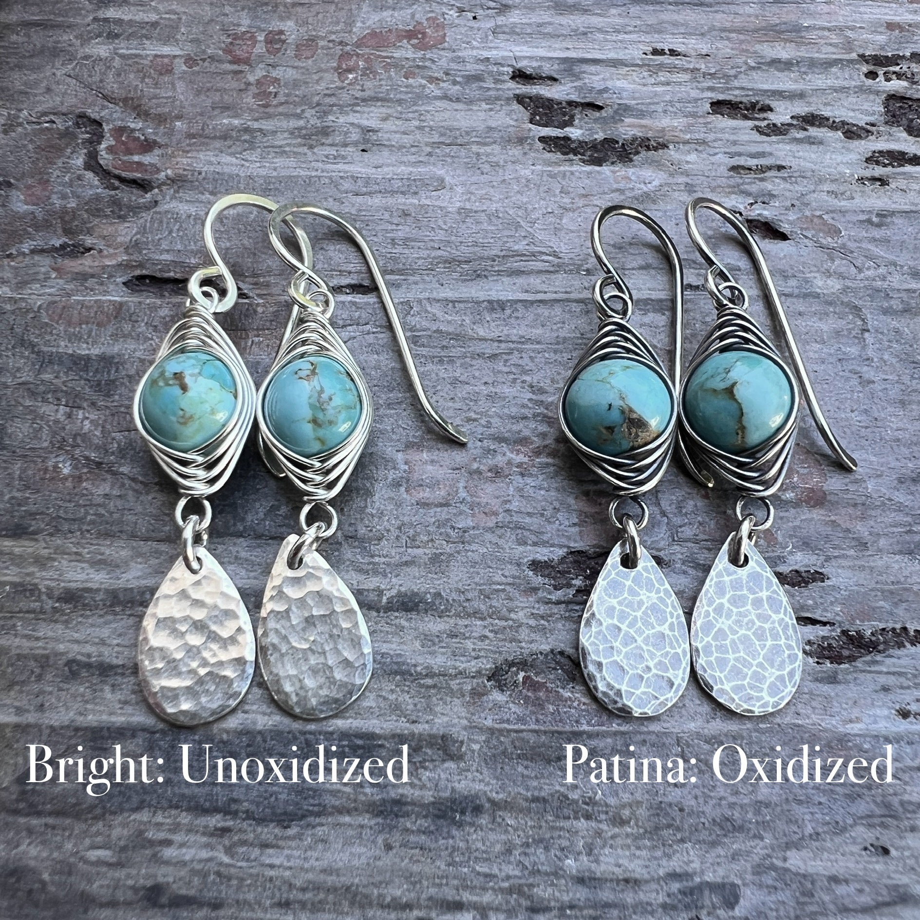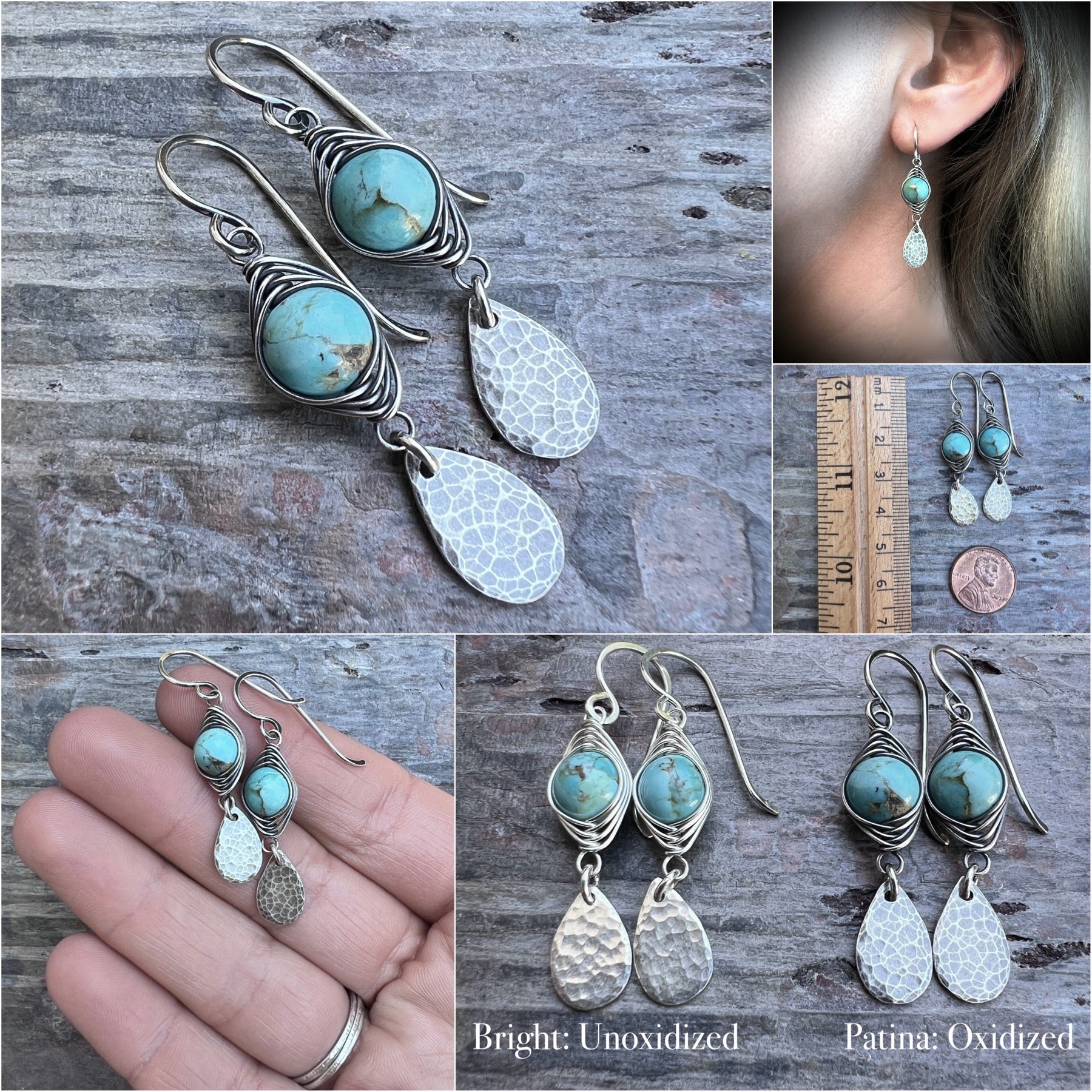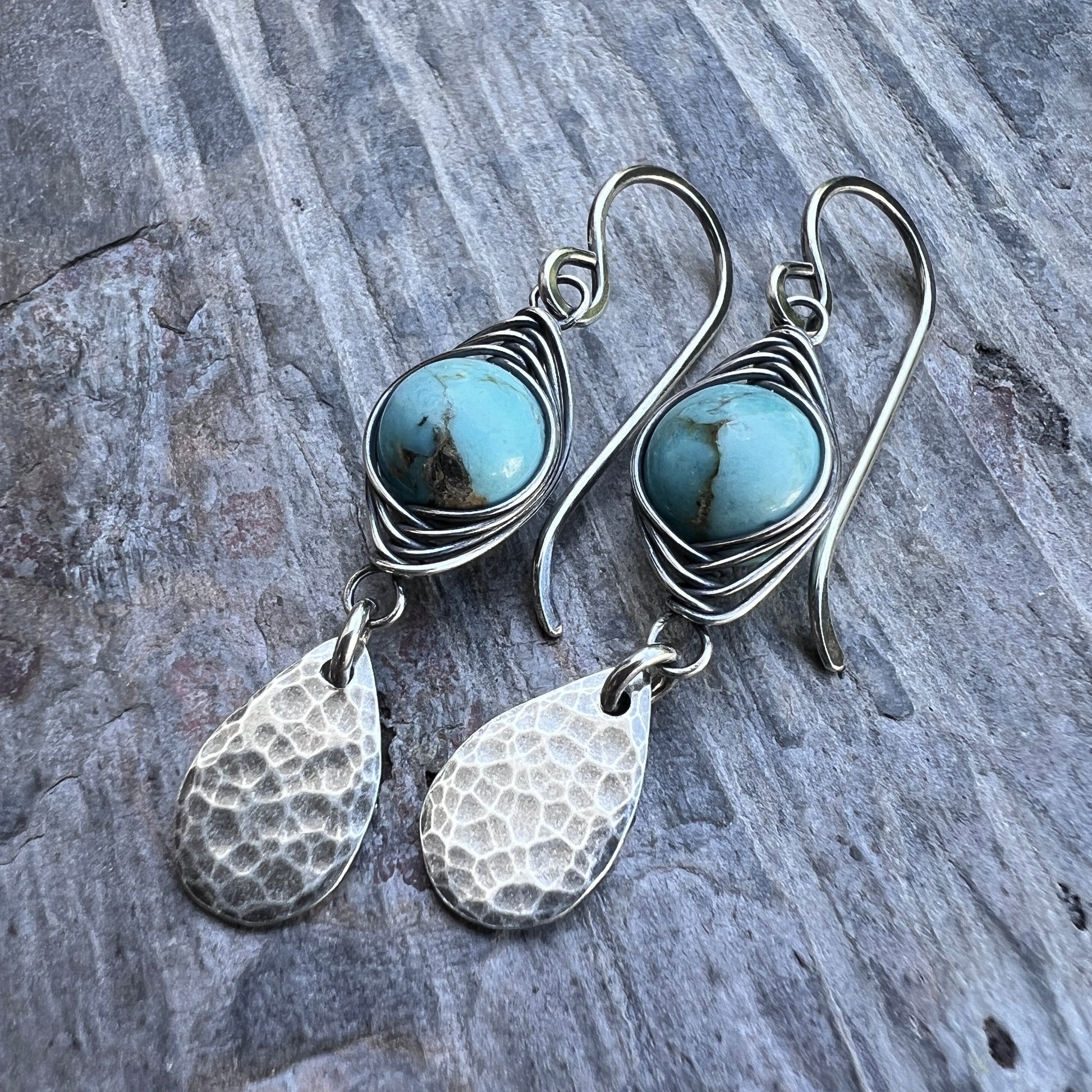 Genuine Turquoise Sterling Silver Earrings | Wire-wrapped Natural Stone and Hammered Teardrop Dangles