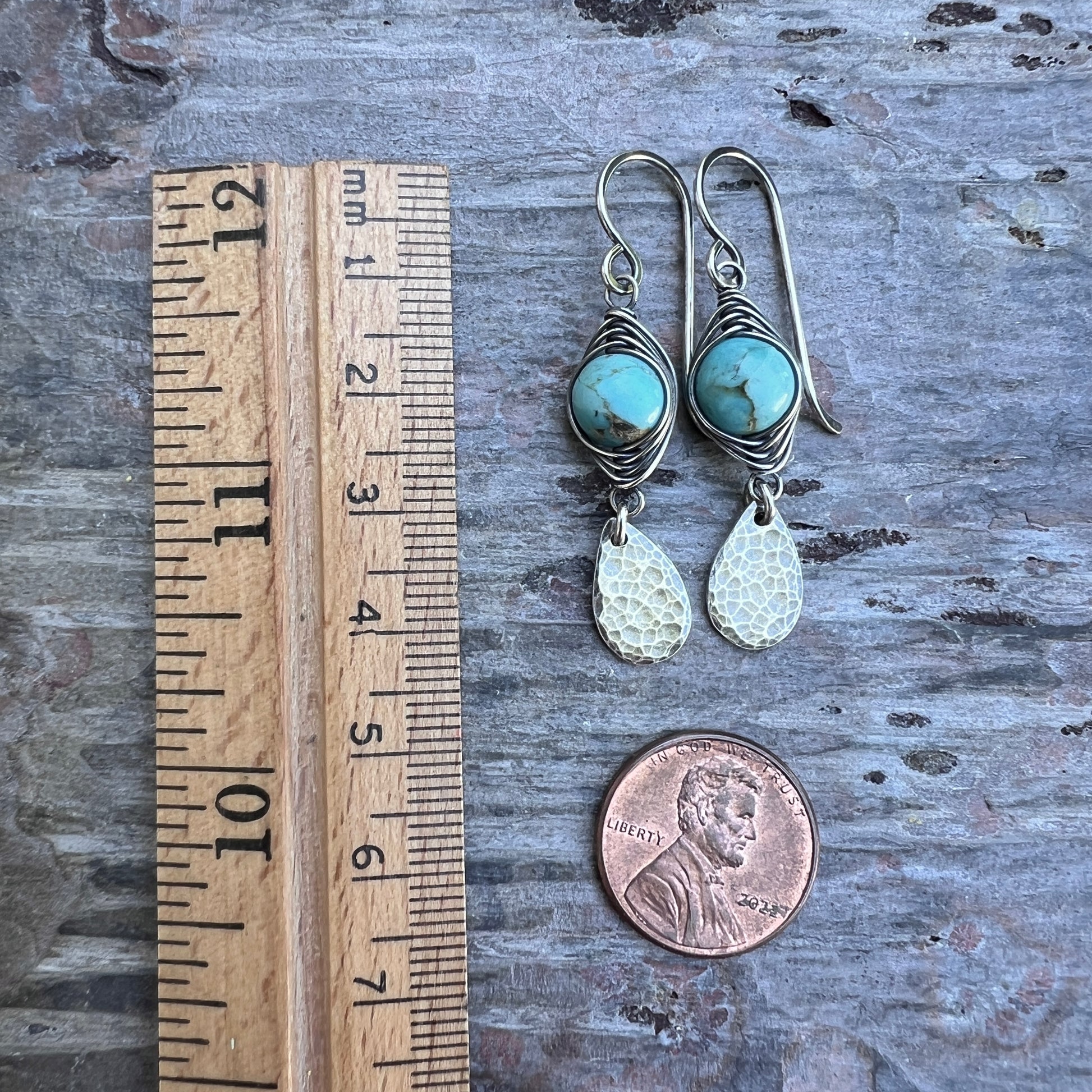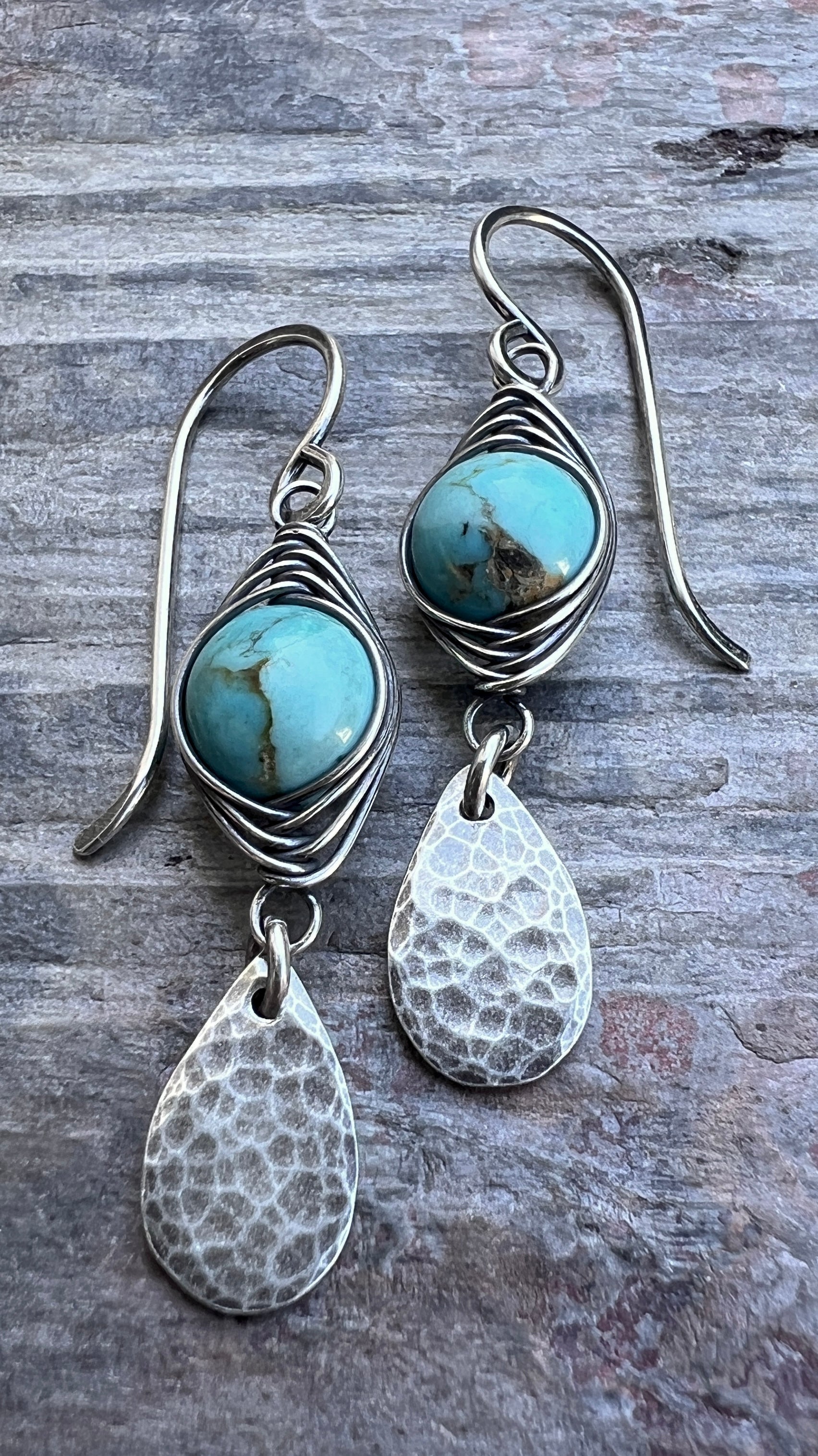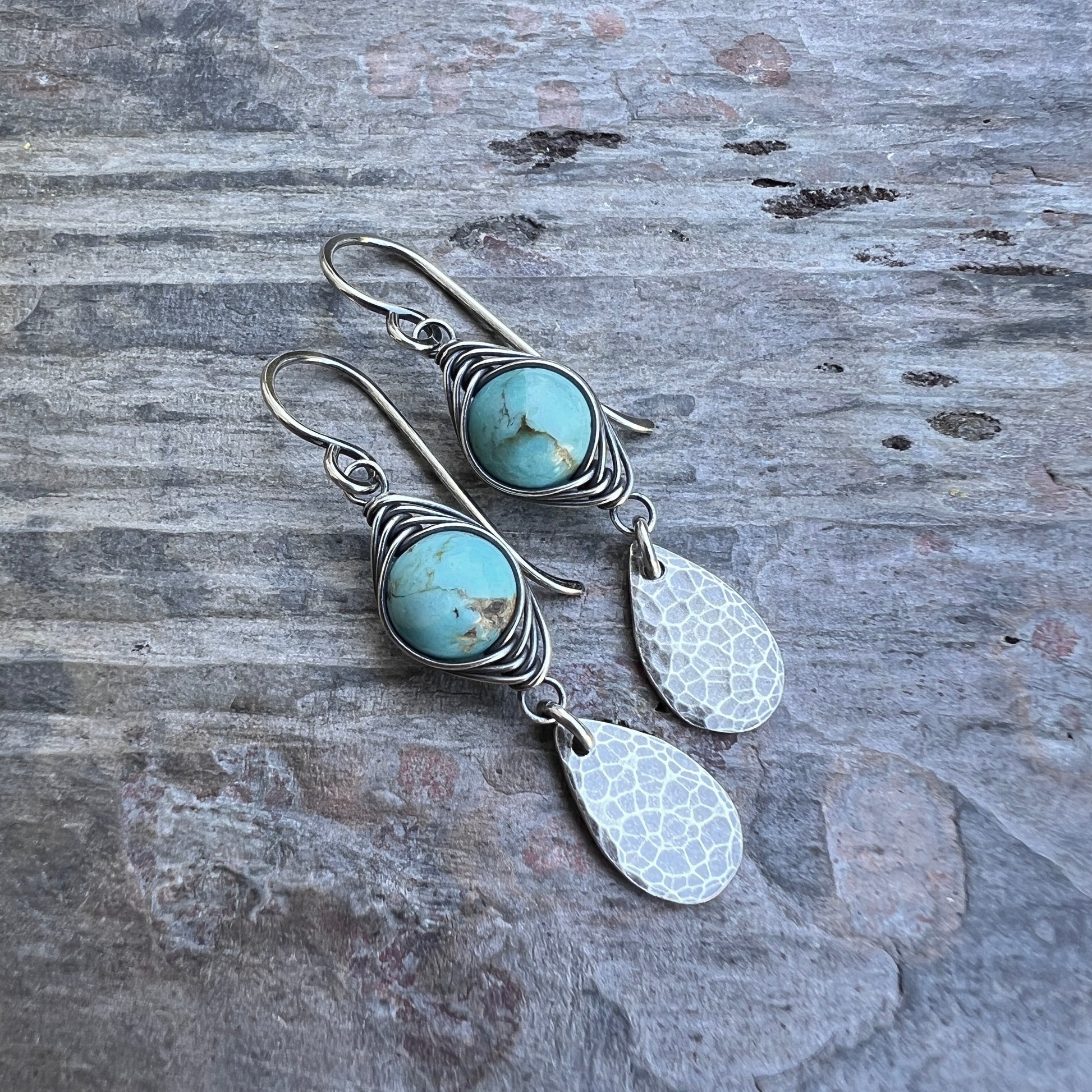 These dangle earrings are handmade from genuine turquoise and sterling silver. The round natural stones are framed in sterling silver wire which I have carefully wrapped around each stone to create the woven design. Below the turquoise stones dangle hammered sterling silver teardrops which I have cut and hammered by hand. The earrings hang from handformed sterling silver earwires.