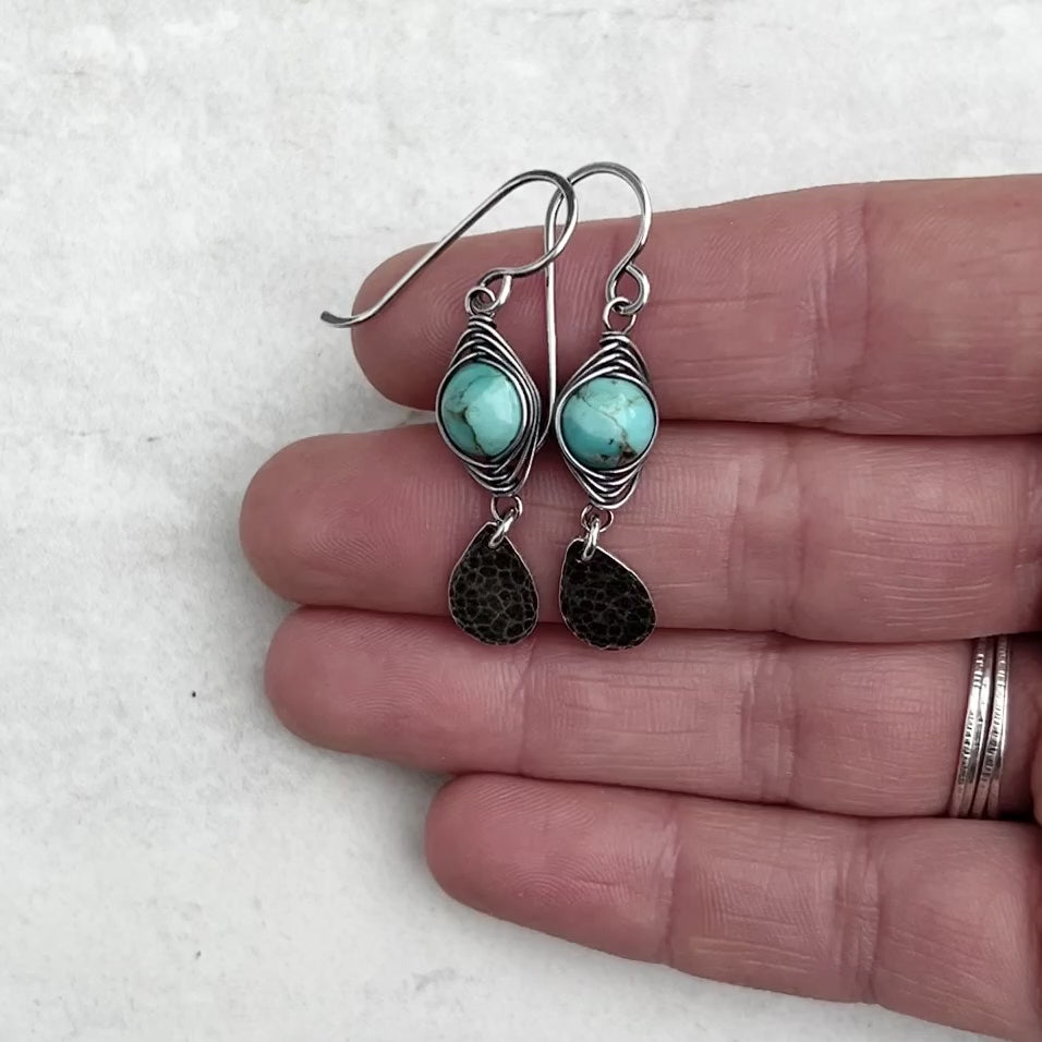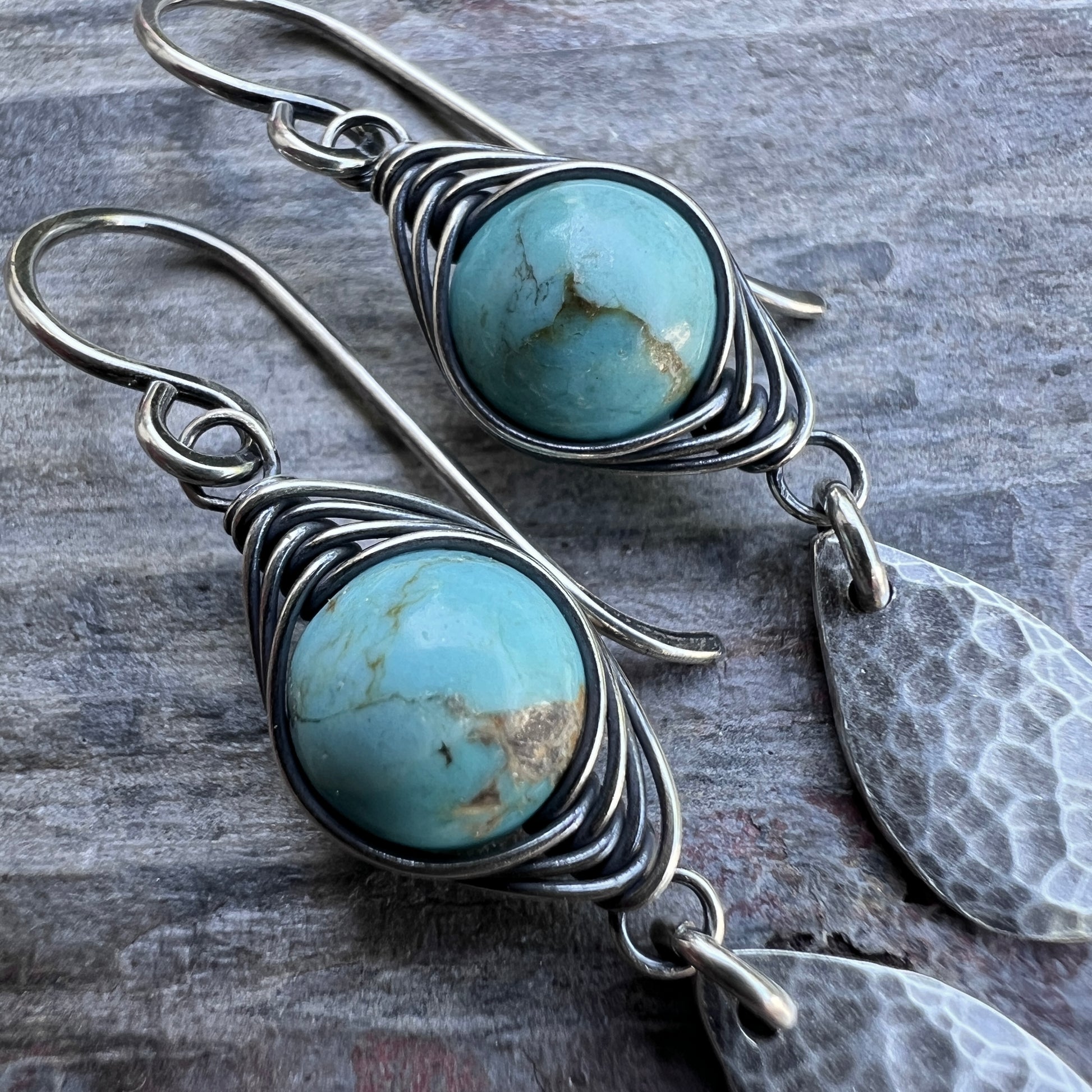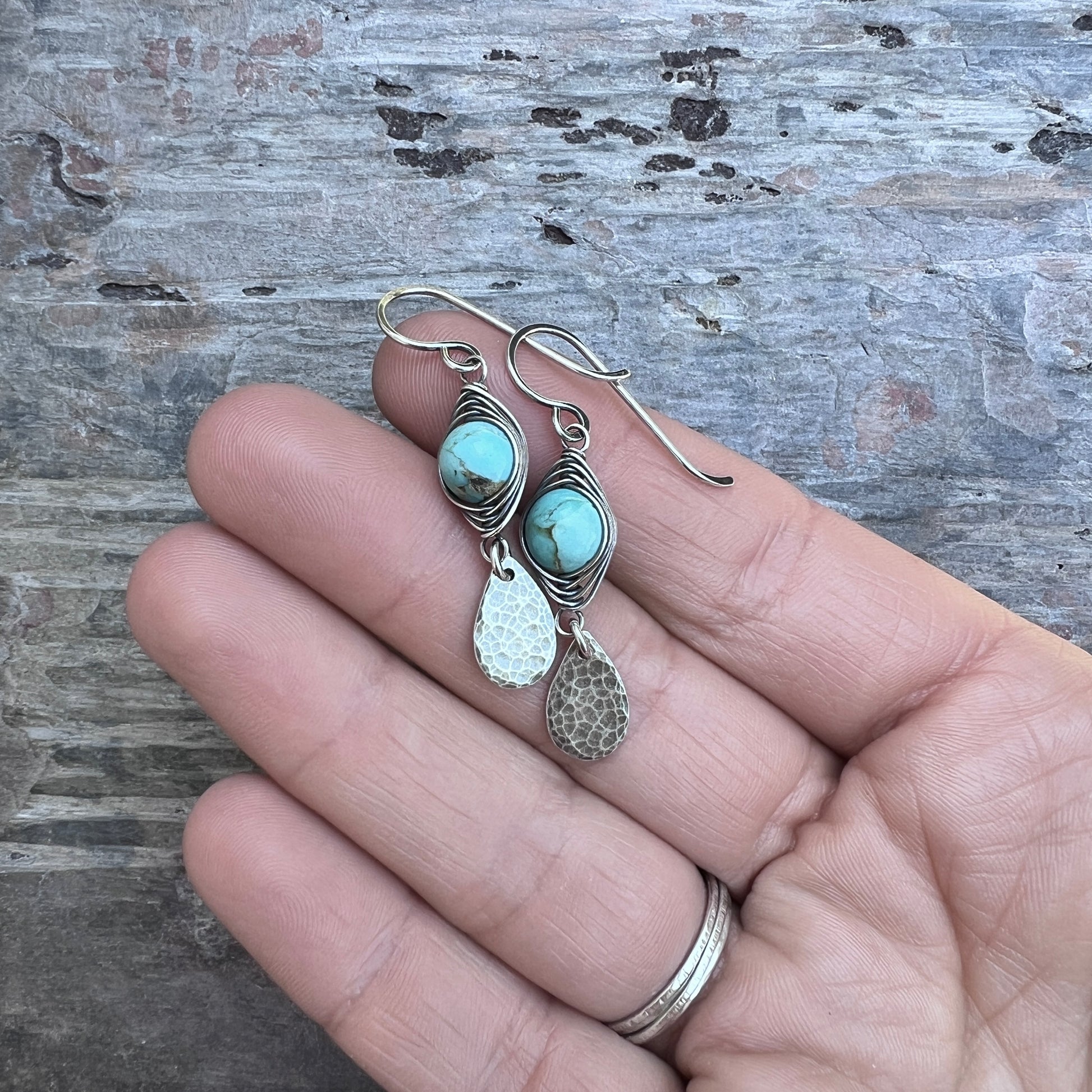 These dangle earrings are handmade from genuine turquoise and sterling silver. The round natural stones are framed in sterling silver wire which I have carefully wrapped around each stone to create the woven design. Below the turquoise stones dangle hammered sterling silver teardrops which I have cut and hammered by hand. The earrings hang from handformed sterling silver earwires.