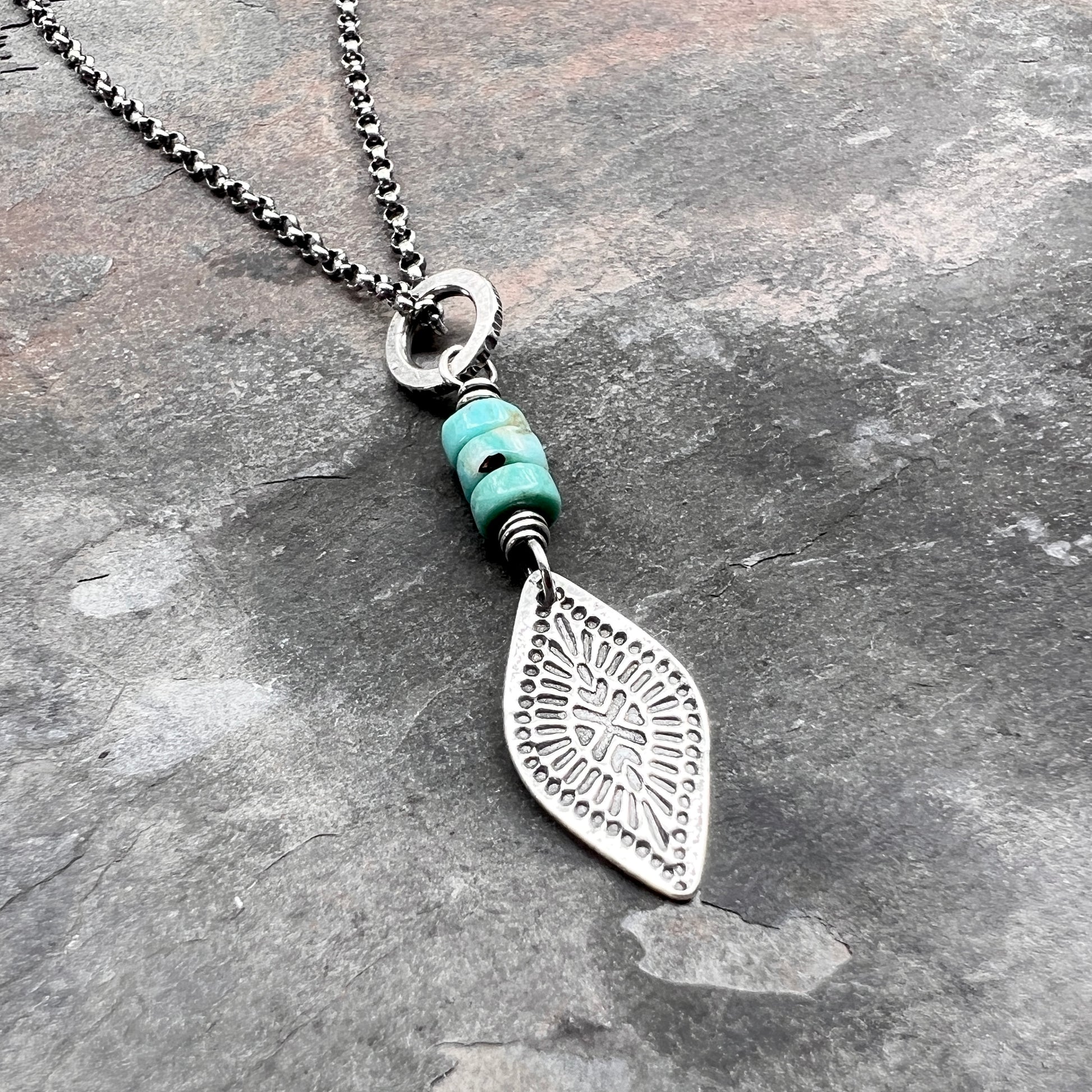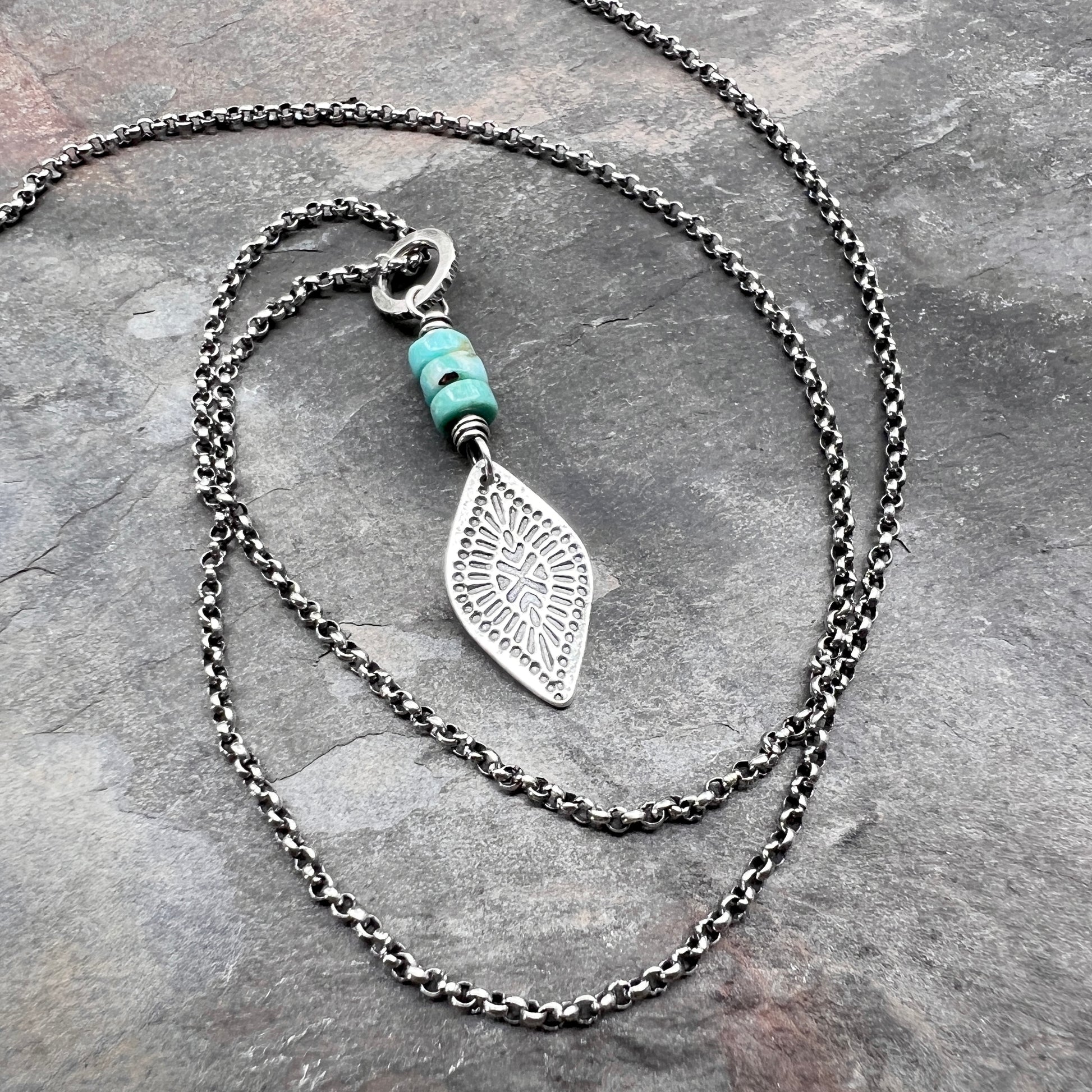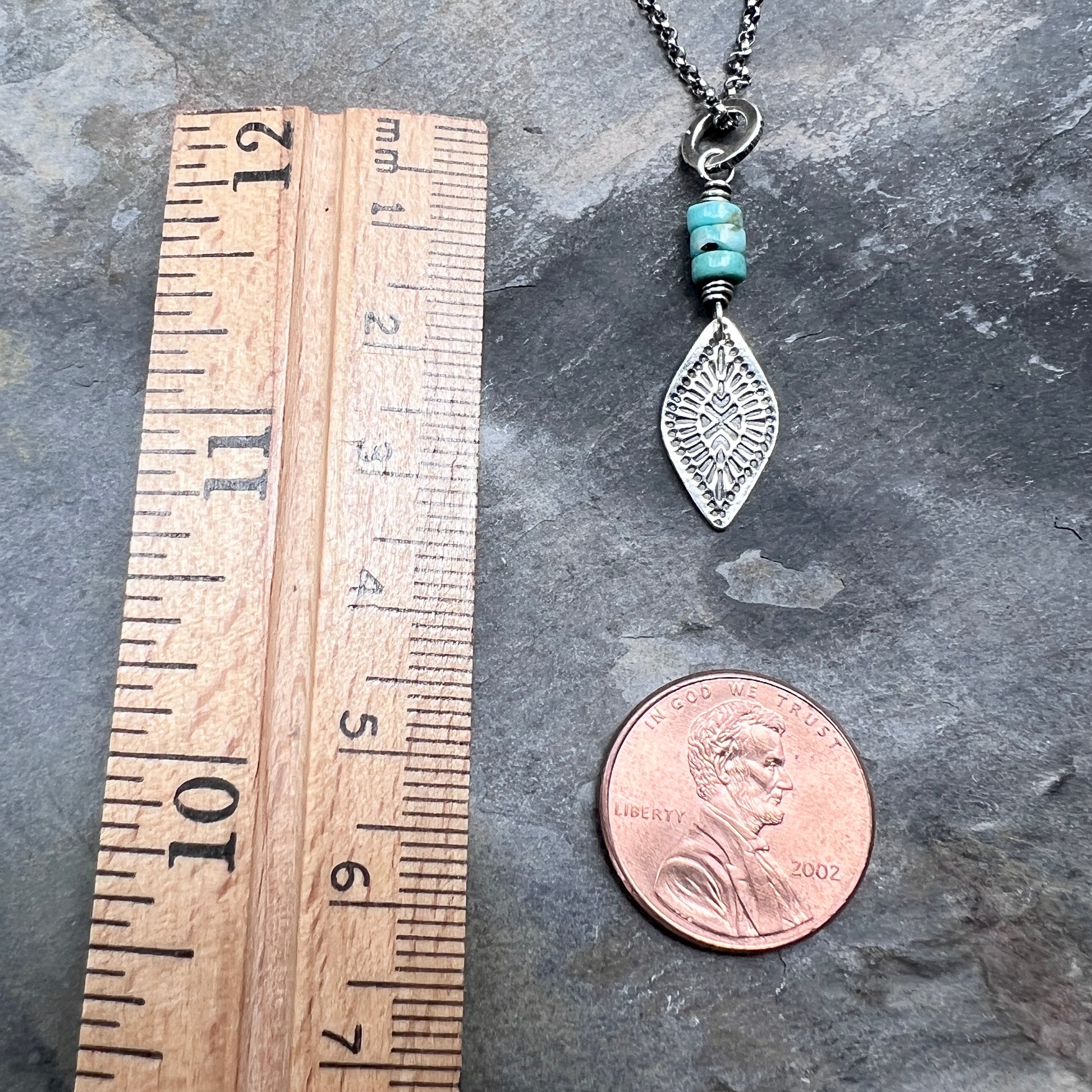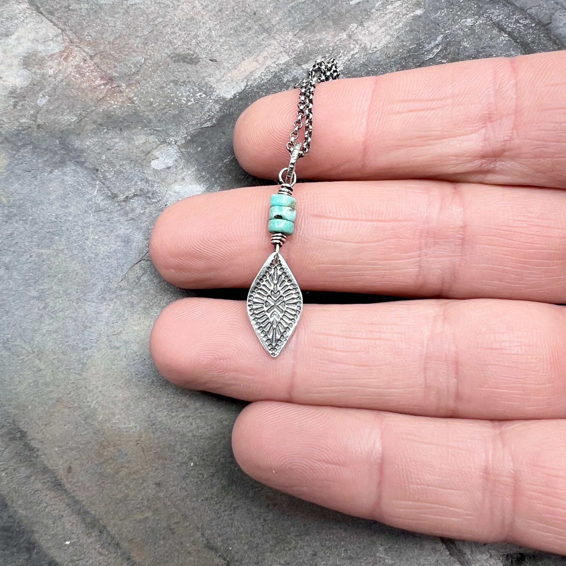 A set of genuine natural turquoise stones have been wrapped in sterling silver. Below the small stones is a stamped silver diamond shape. The silver diamond has been cut from sterling silver and stamped with a unique pattern. The pendant hangs from a lightweight sterling silver chain. The silver has been oxidized and polished to give it an antique patina finish.