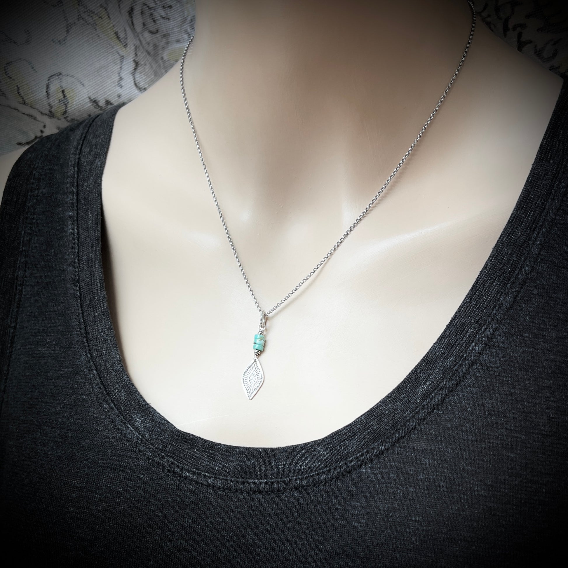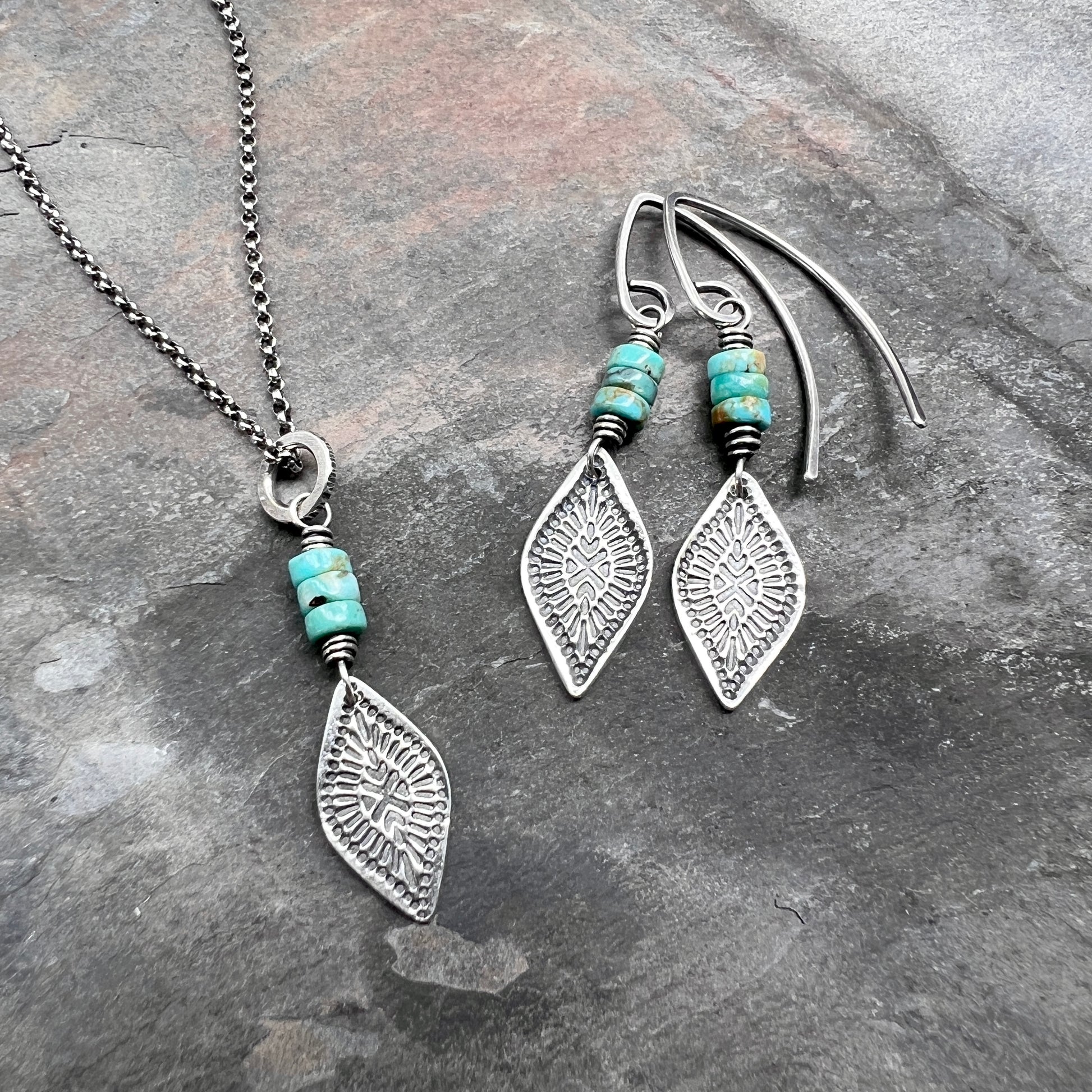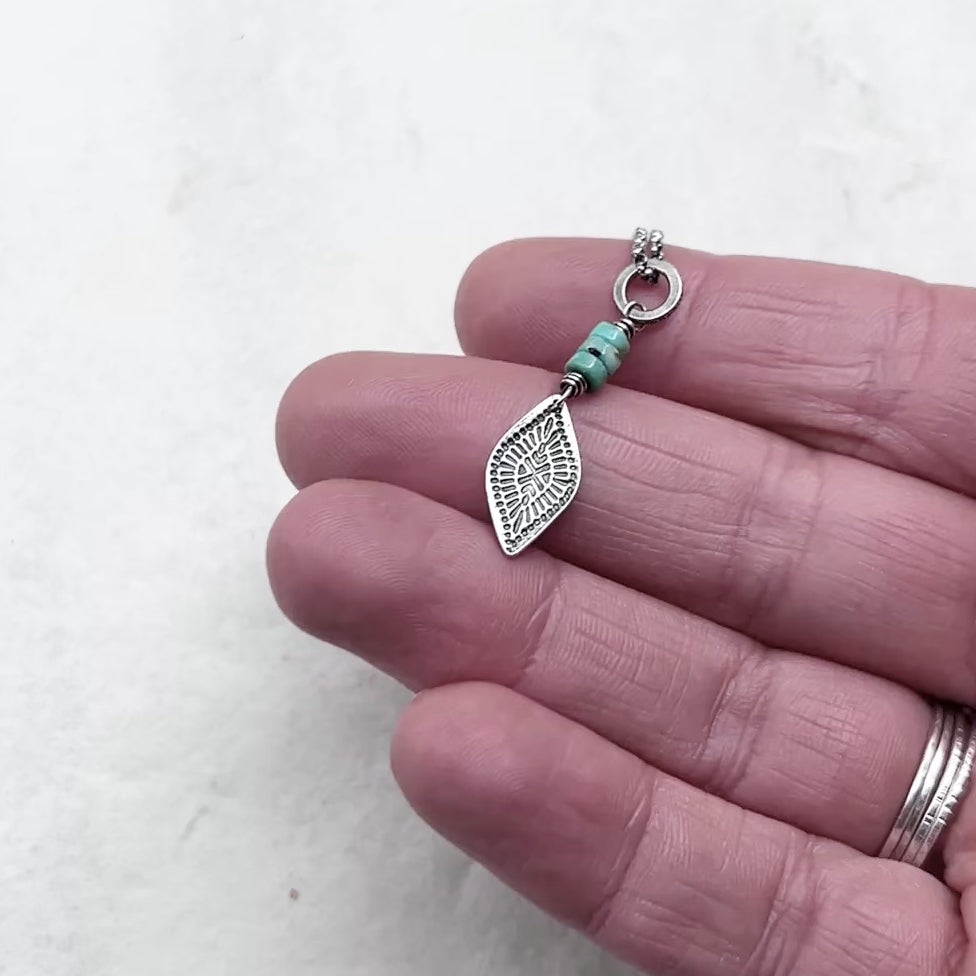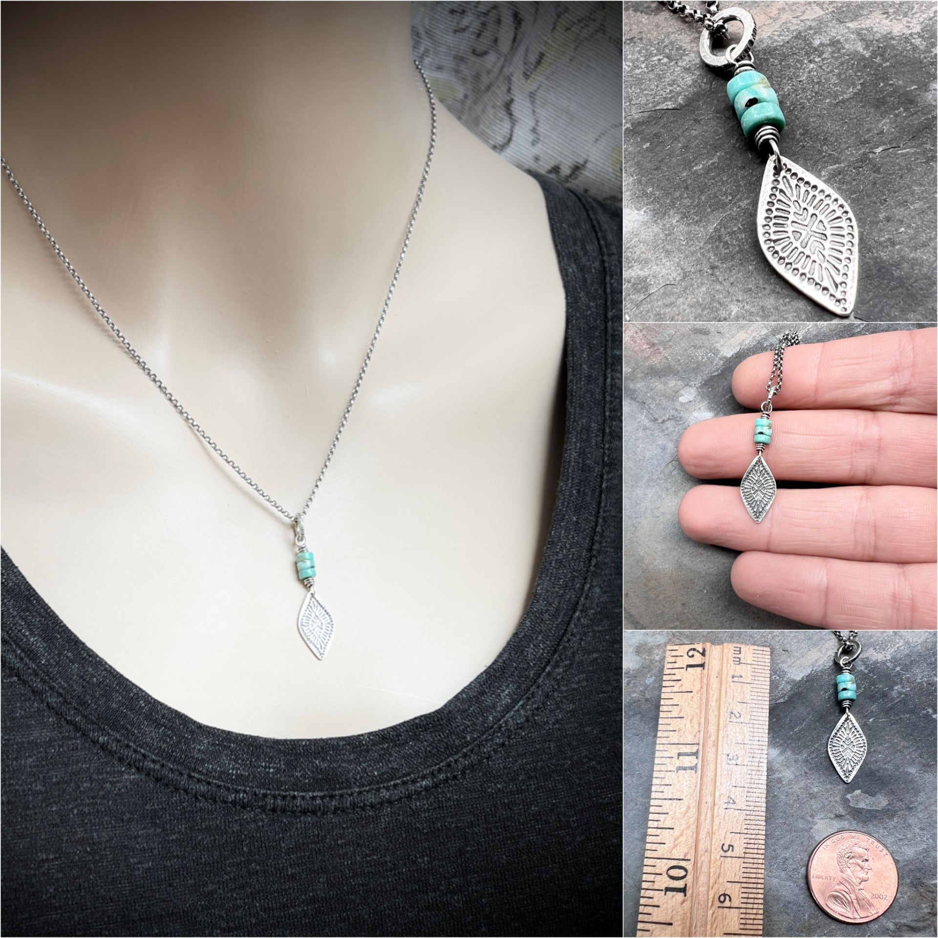 A set of genuine natural turquoise stones have been wrapped in sterling silver. Below the small stones is a stamped silver diamond shape. The silver diamond has been cut from sterling silver and stamped with a unique pattern. The pendant hangs from a lightweight sterling silver chain. The silver has been oxidized and polished to give it an antique patina finish.