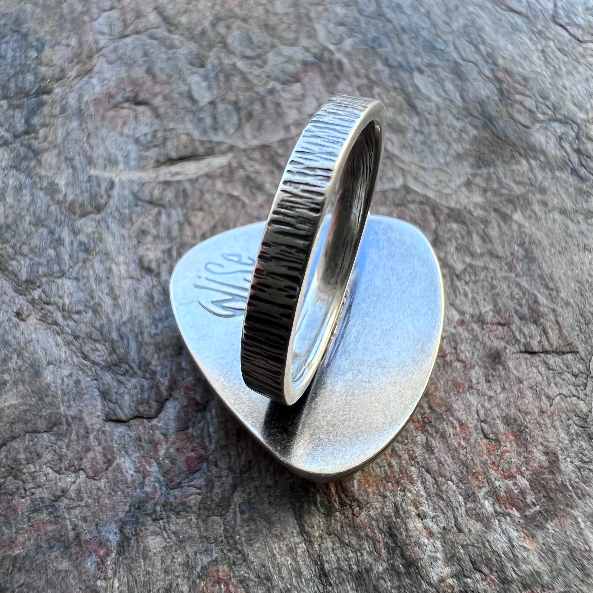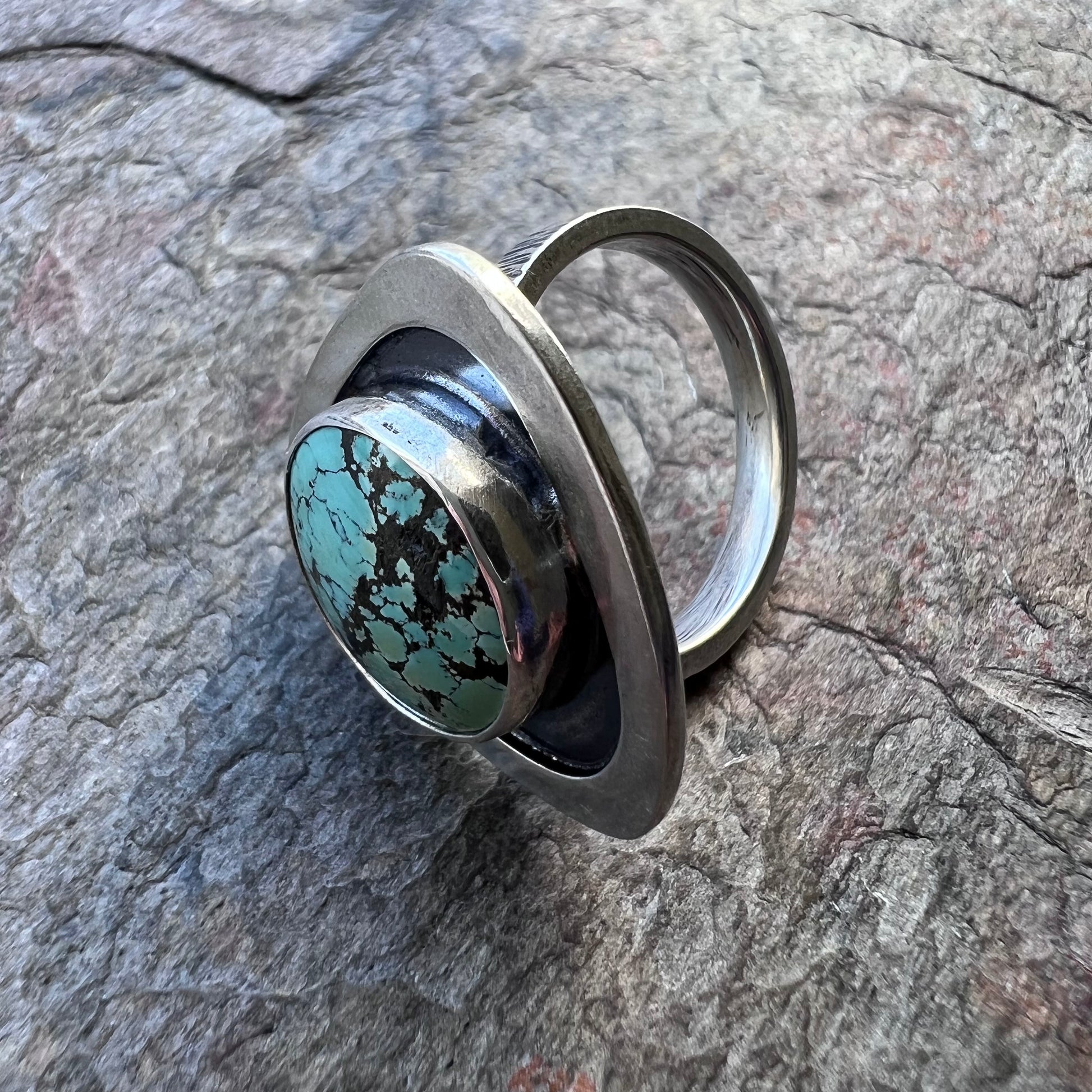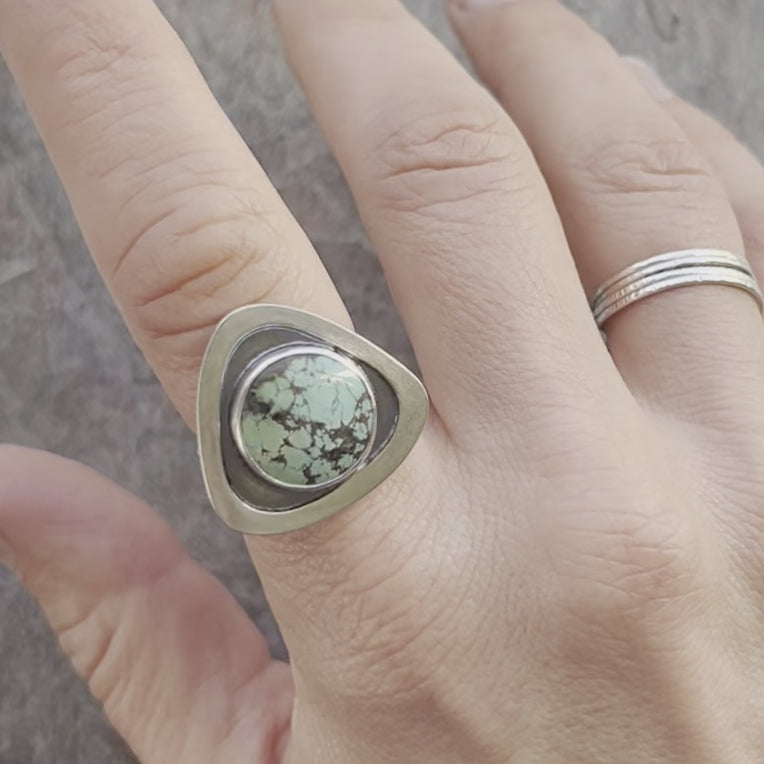 I have set a genuine turquoise cabochon in sterling and fine silver. The round stone is framed by a smooth triangular shadowbox setting. I have created this one-of-a-kind design by sawing, forming, soldering, and finishing the piece entirely by hand. The silver has been oxidized and polished to create a patina finish. This ring is US size 8.25 as sized on a standard US ring sizer.
