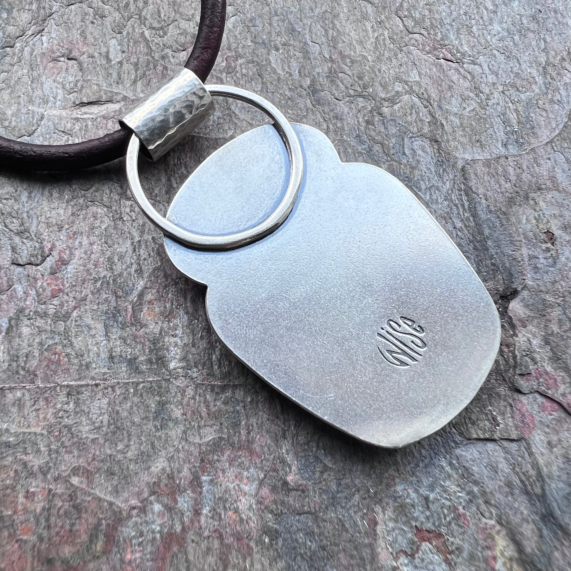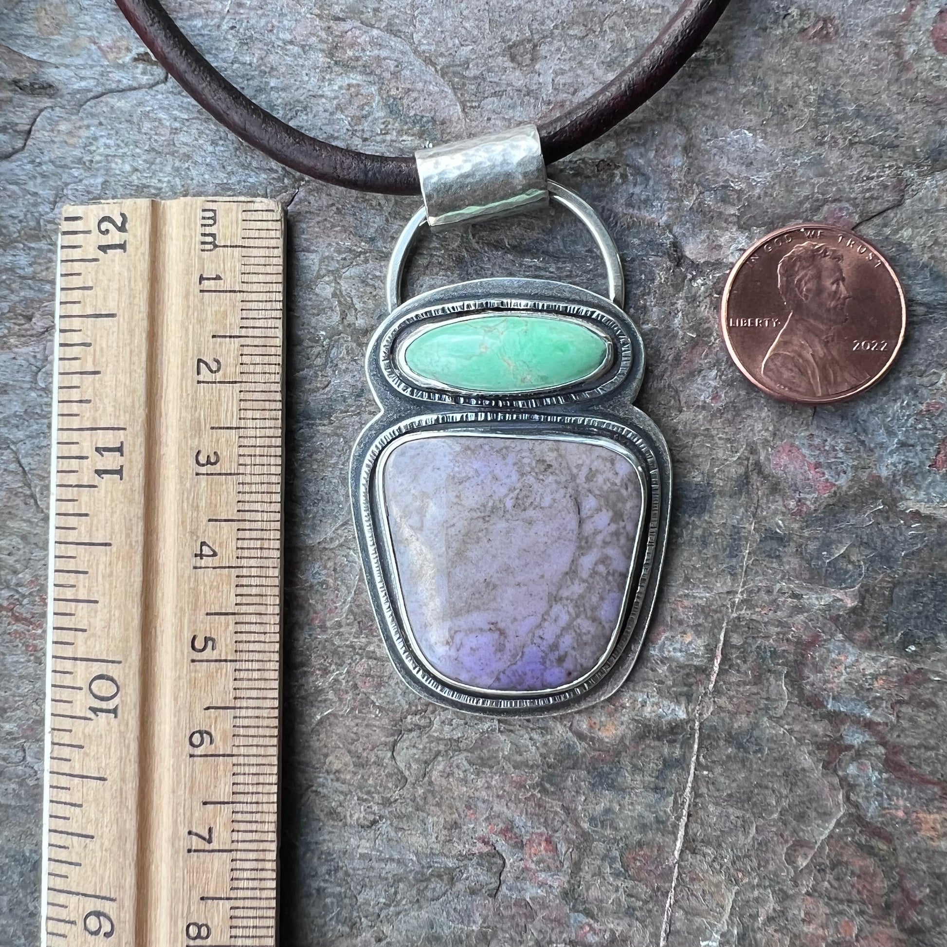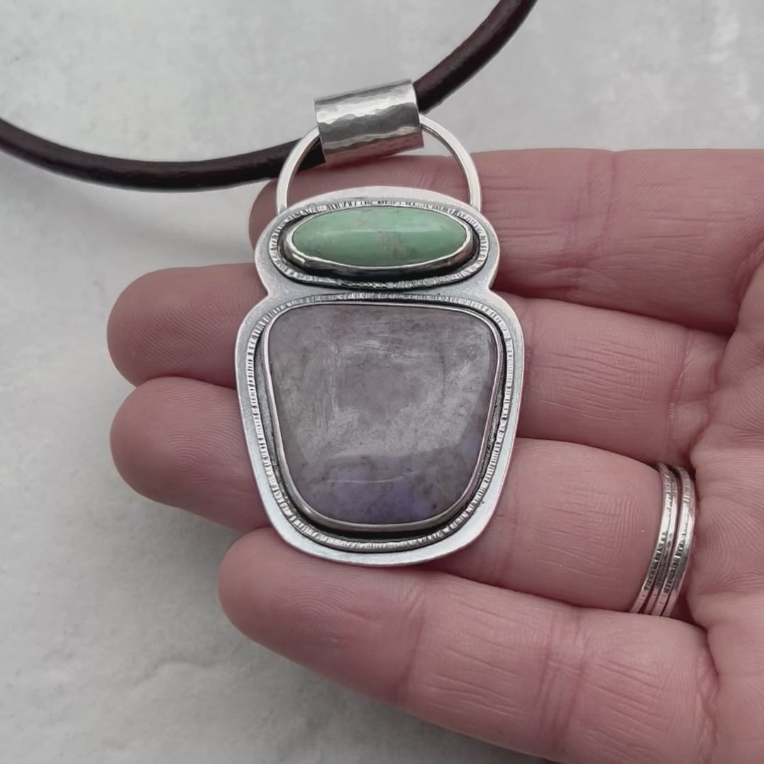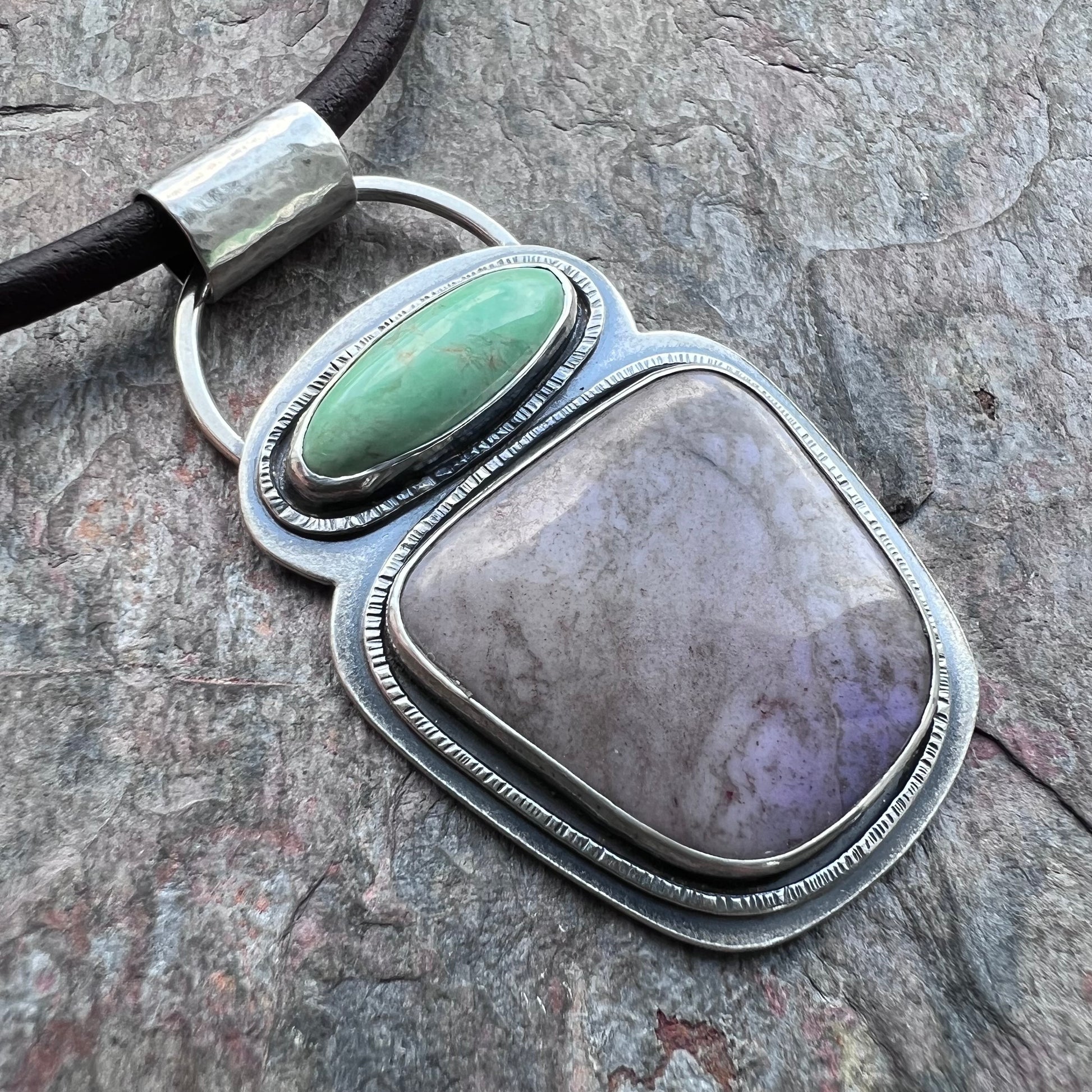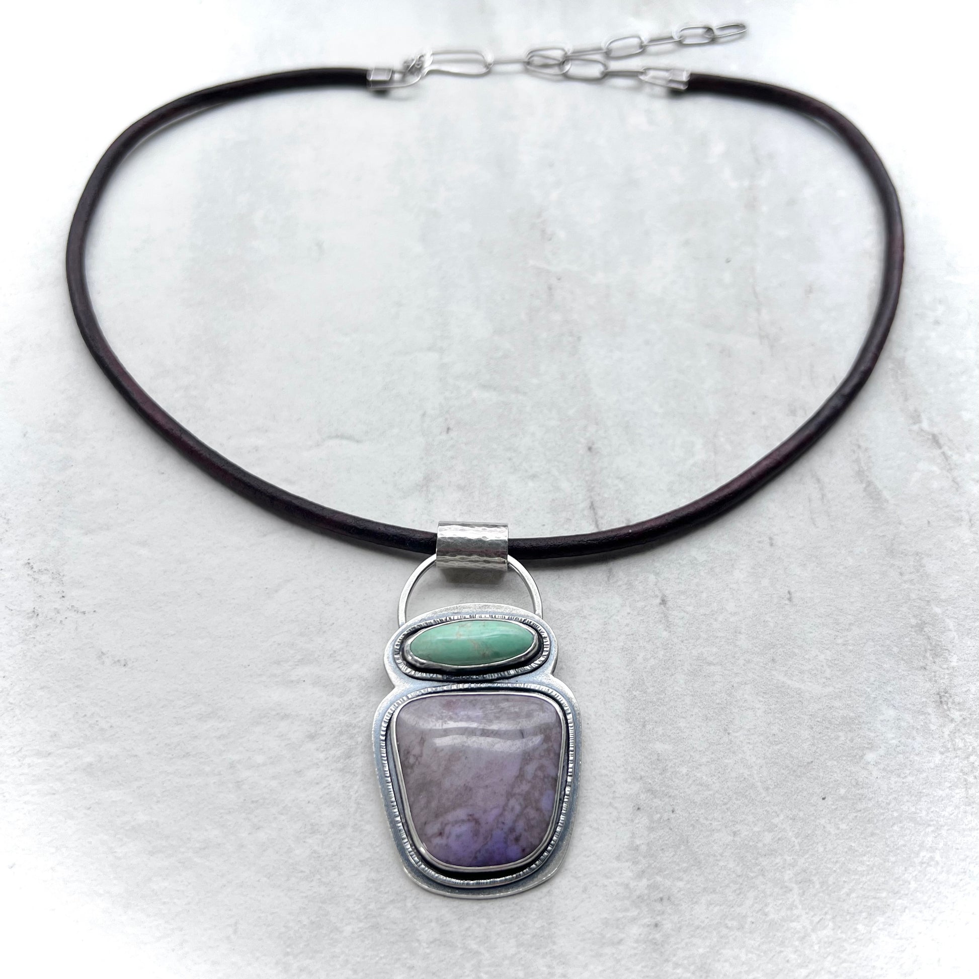 Turkish lavender jade and variscite cabochons have been set in sterling and fine silver. I have made this one-of-a-kind necklace by sawing, soldering, texturing, and finishing the design entirely by hand. Pendant hangs from a genuine deep brown leather cord featuring a 4-inch sterling silver extender chain and handmade clasp. The silver has been oxidized and polished to create a patina finish.