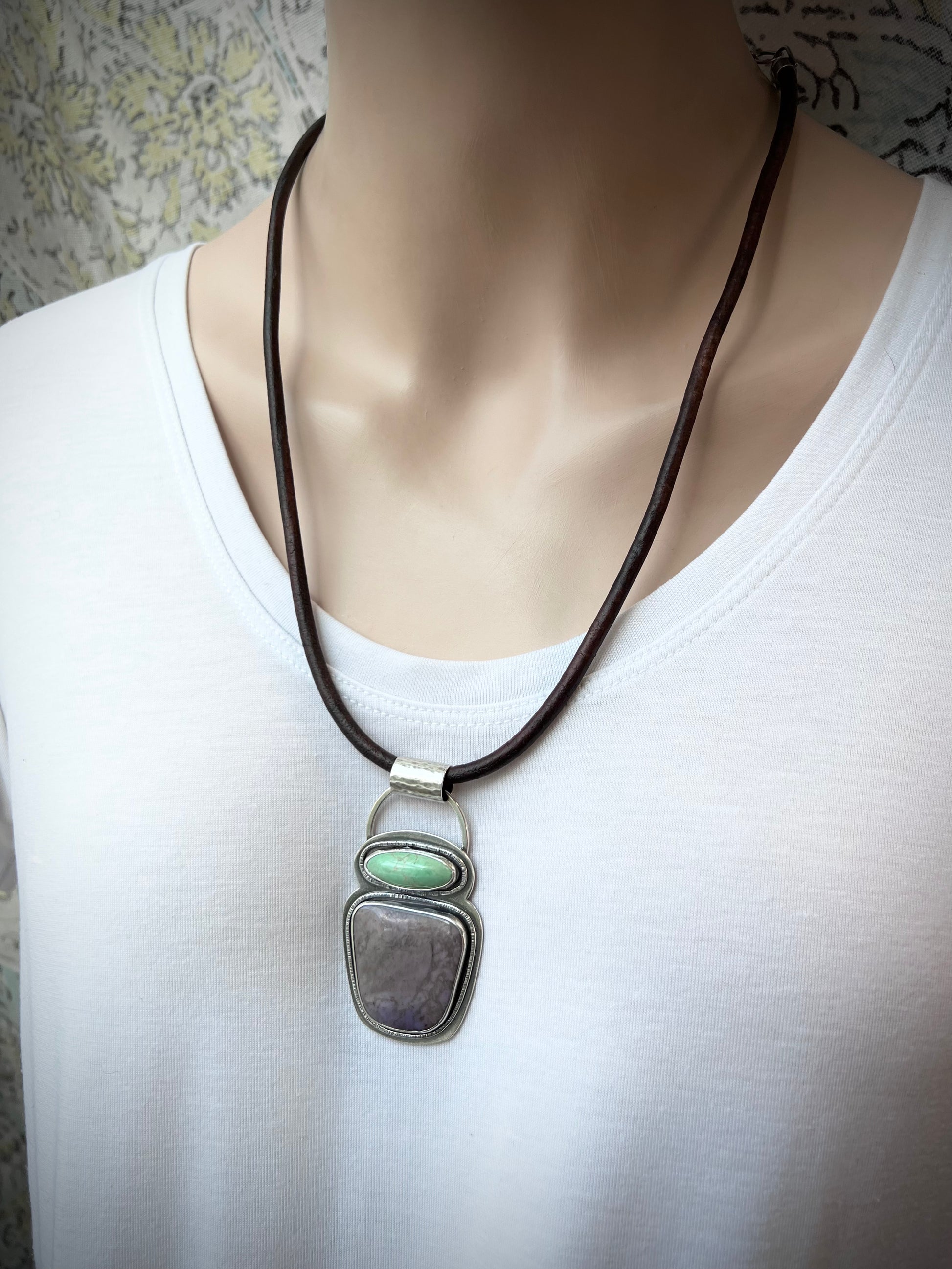 Variscite and Jade Sterling Silver Necklace - Handmade One-of-a-kind Pendant on Genuine Leather
