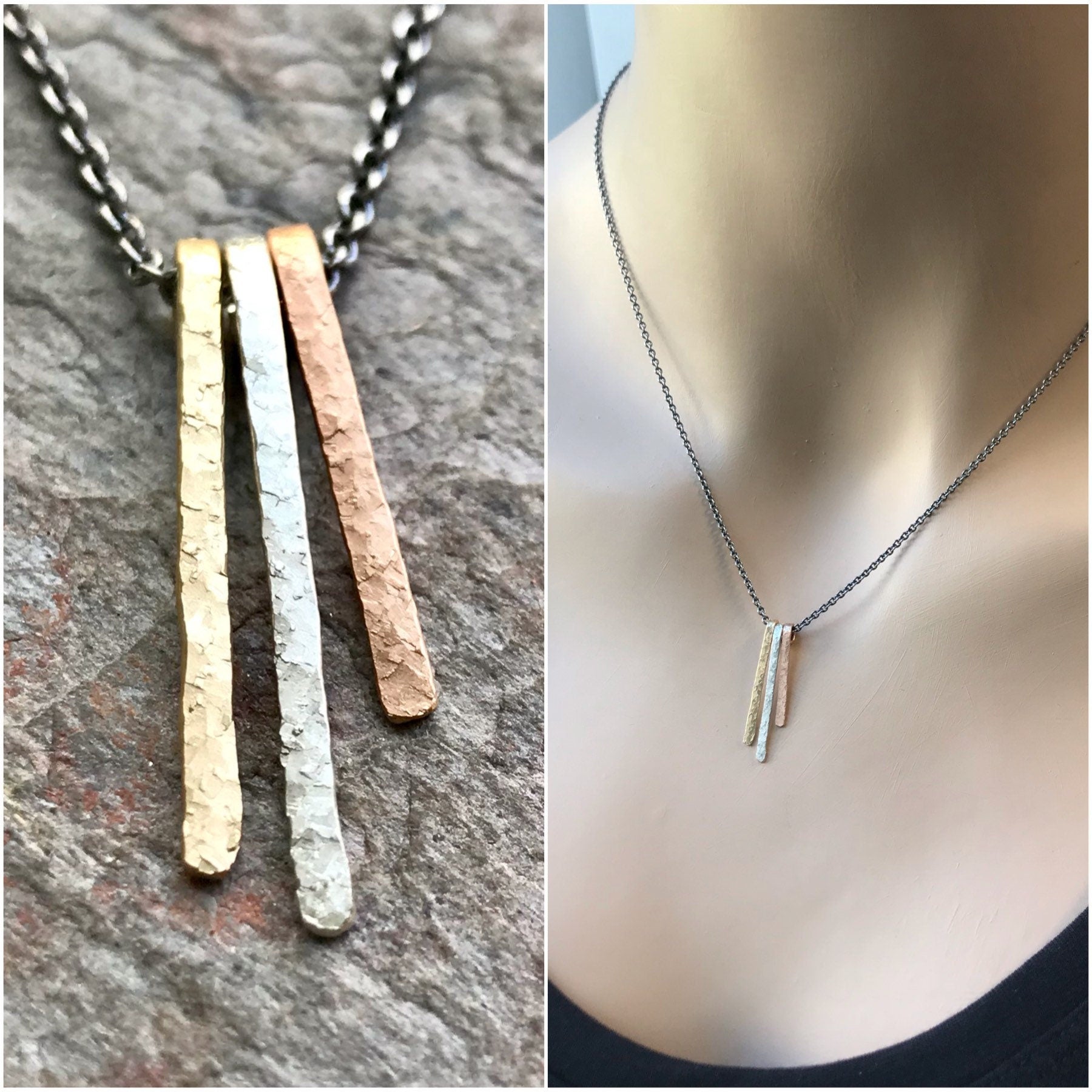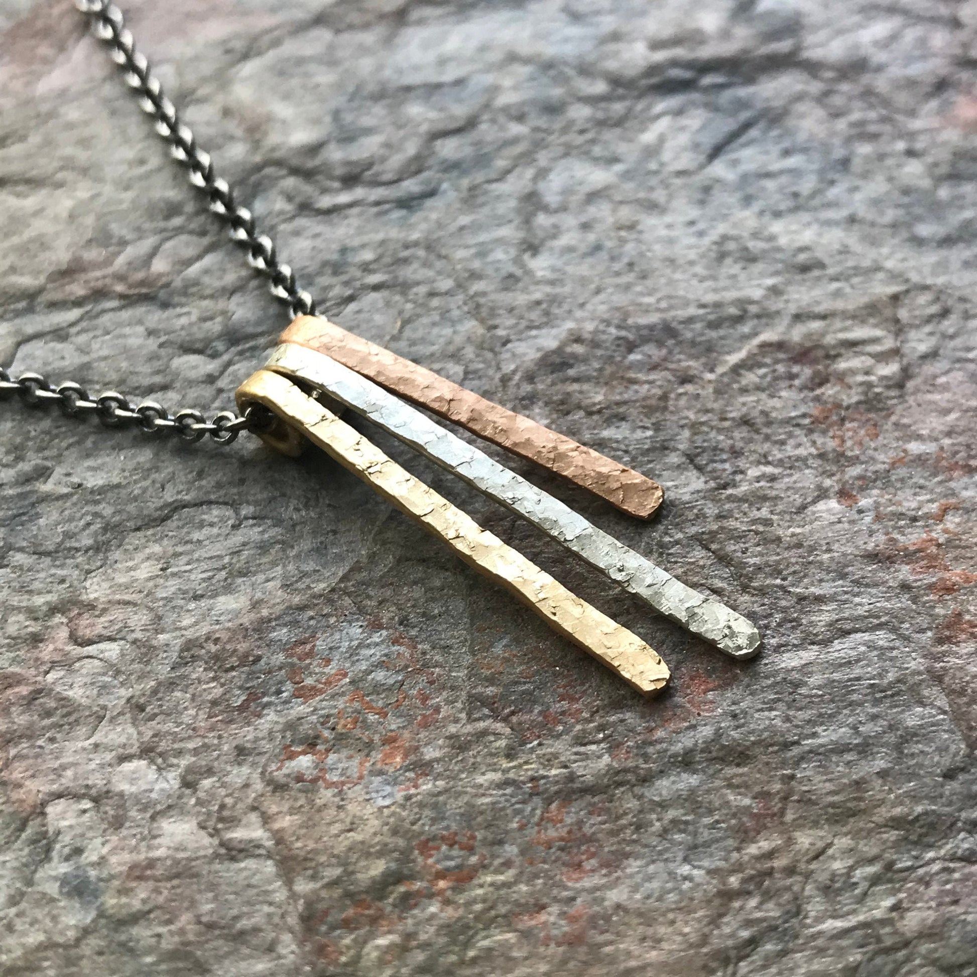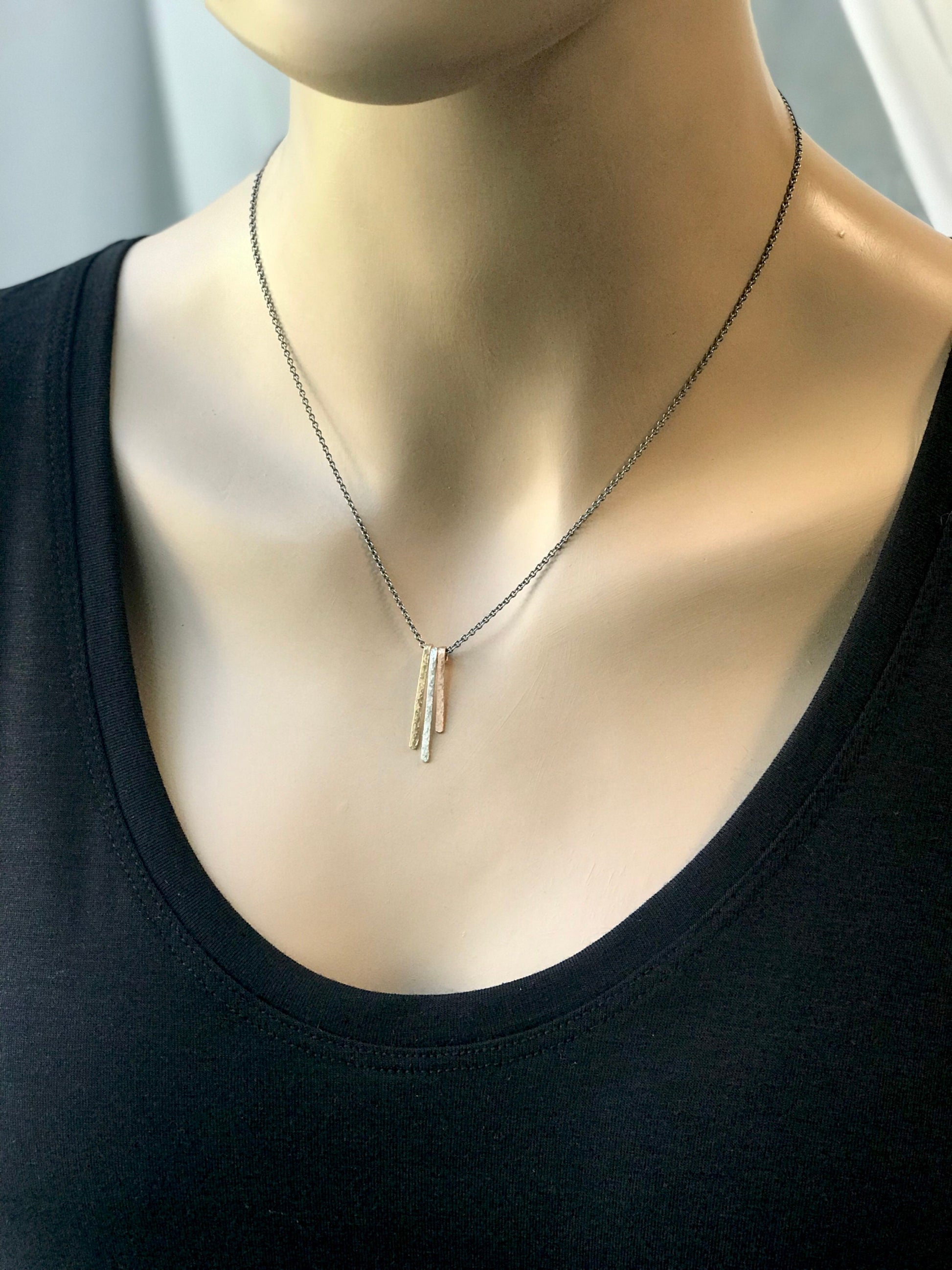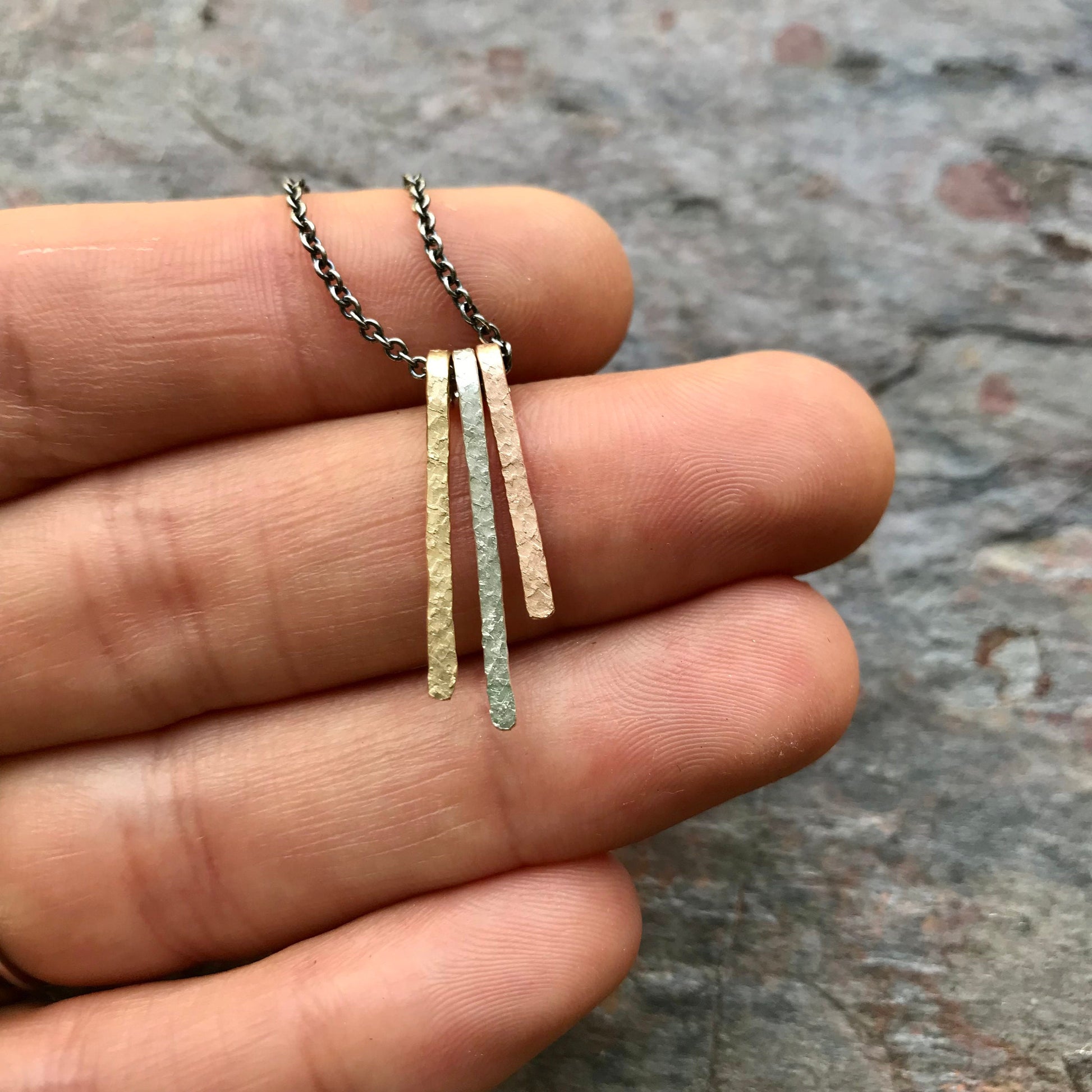 Three dainty bars have been created from 14K yellow goldfill, sterling silver, and 14K rose goldfill. Each bar has been cut, formed, and textured by hand. The pendant is suspended from a lightweight Sterling Silver chain. The chain has been oxidized and polished to create a contrasting patina finish.